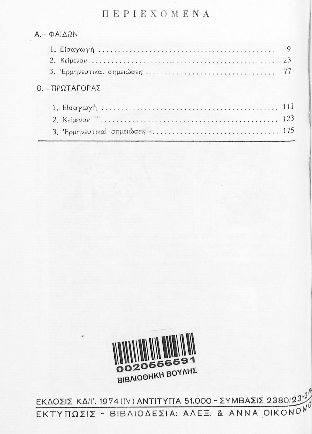 Σχολικό εγχειρίδιο Αρχαίων Ελληνικών της ΣΤ ' Γυμνασίου. Το βιβλίο παρουσιάζει δύο έργα του Πλάτωνα, Φαίδων και Πρωταγόρας. Το βιβλίο αρχίζει με μια εισαγωγή στην εποχή και το έργο του Πλάτωνα. Στη συνέχεια παρουσιάζει τα κείμενα από το πρωτότυπο και ολοκληρώνει με λεξιλογικές και ερμηνευτικές αναλύσεις