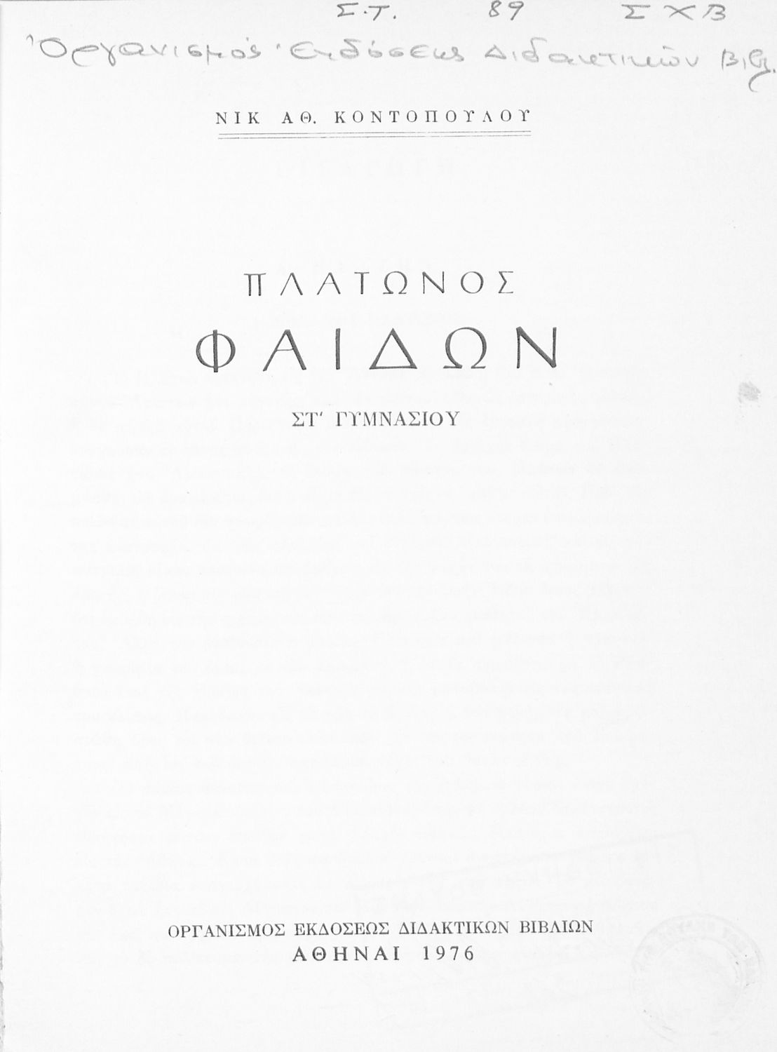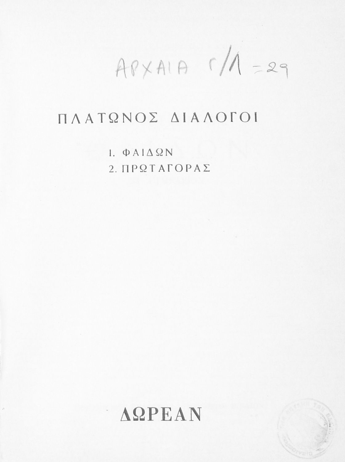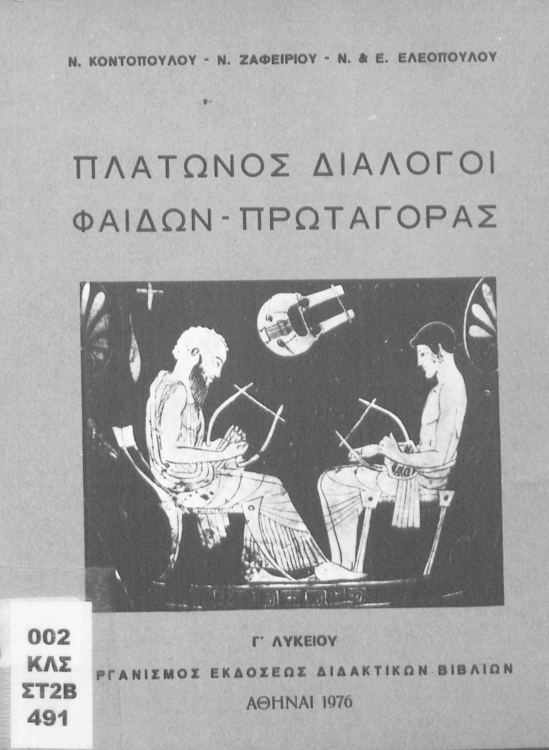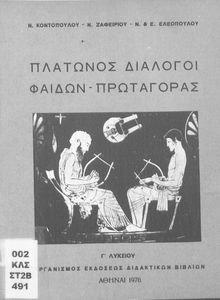 Σχολικό εγχειρίδιο Αρχαίων Ελληνικών της Γ' Λυκείου. Το βιβλίο περιέχει τα δύο έργα του Πλάτωνα, Φαίδων και Πρωταγόρας, όπου ο Σωκράτης συνομιλεί για την έννοια και ιδέες της φιλοσοφίας.