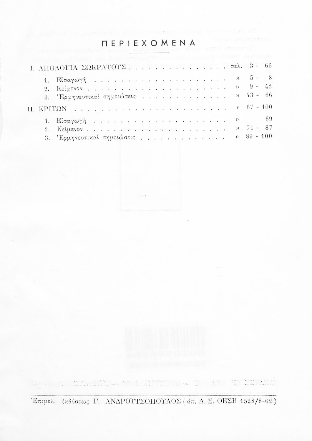 Σχολικό εγχειρίδιο Αρχαίων Ελληνικών Γυμνασίου που περιέχει τα έργα του Πλάτωνα Απολογία Σωκράτους και Κρίτων, ερμηνευτικά και πραγματολογικά σχόλια και λεξιλογικές παρατηρήσεις.