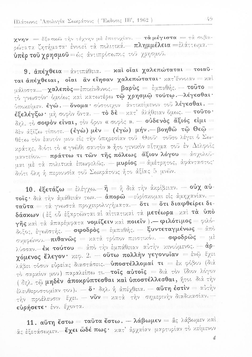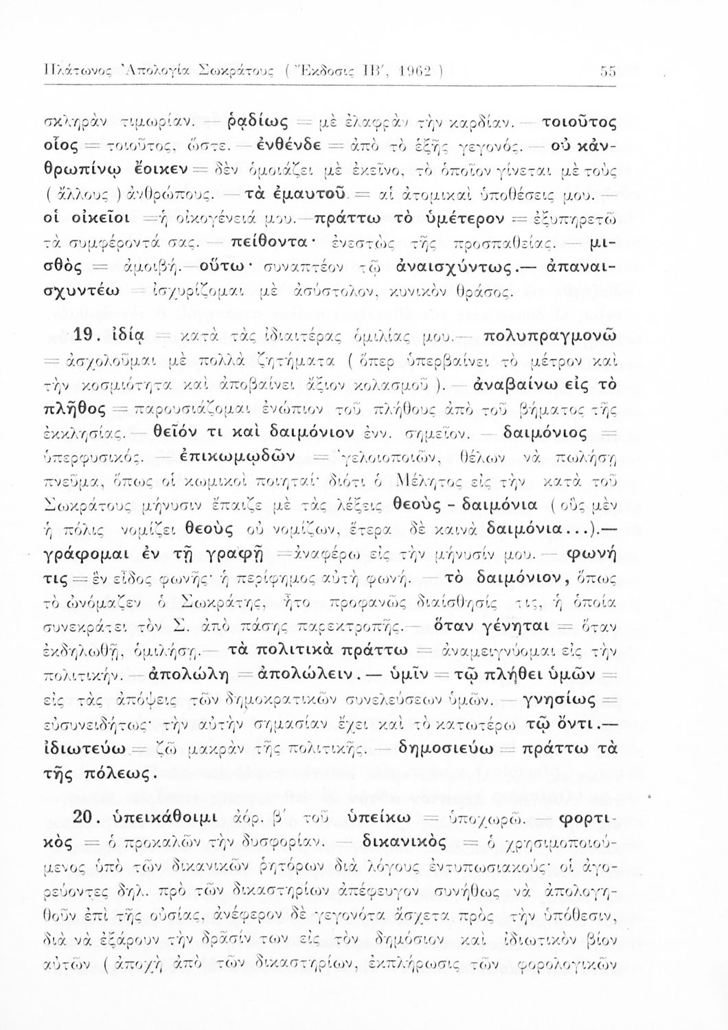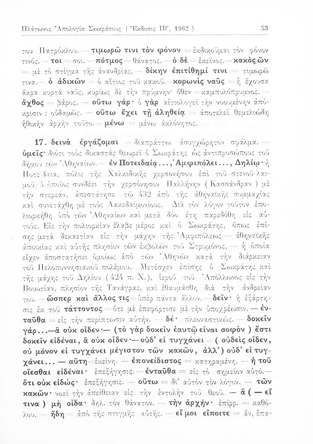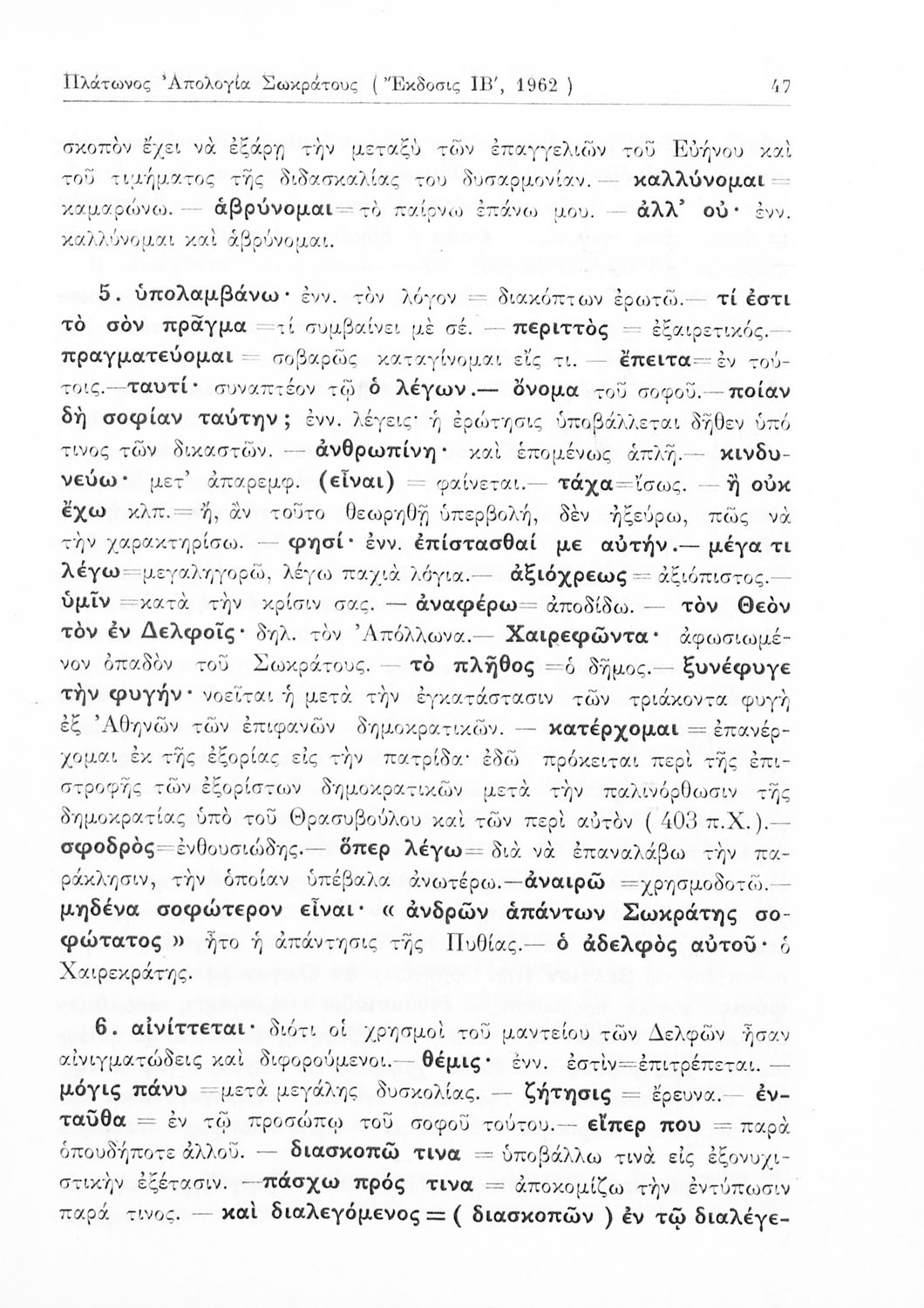 Σχολικό εγχειρίδιο Αρχαίων Ελληνικών της Ε' Γυμνασίου. Το βιβλίο περιέχει τα έργα του Πλάτωνα “Απολογία Σωκράτους” και “Κρίτων” από το πρωτότυπο. Στο δεύτερο μέρος υπάρχουν ερμηνευτικές και λεξιλογικές αναλύσεις των δύο έργων.