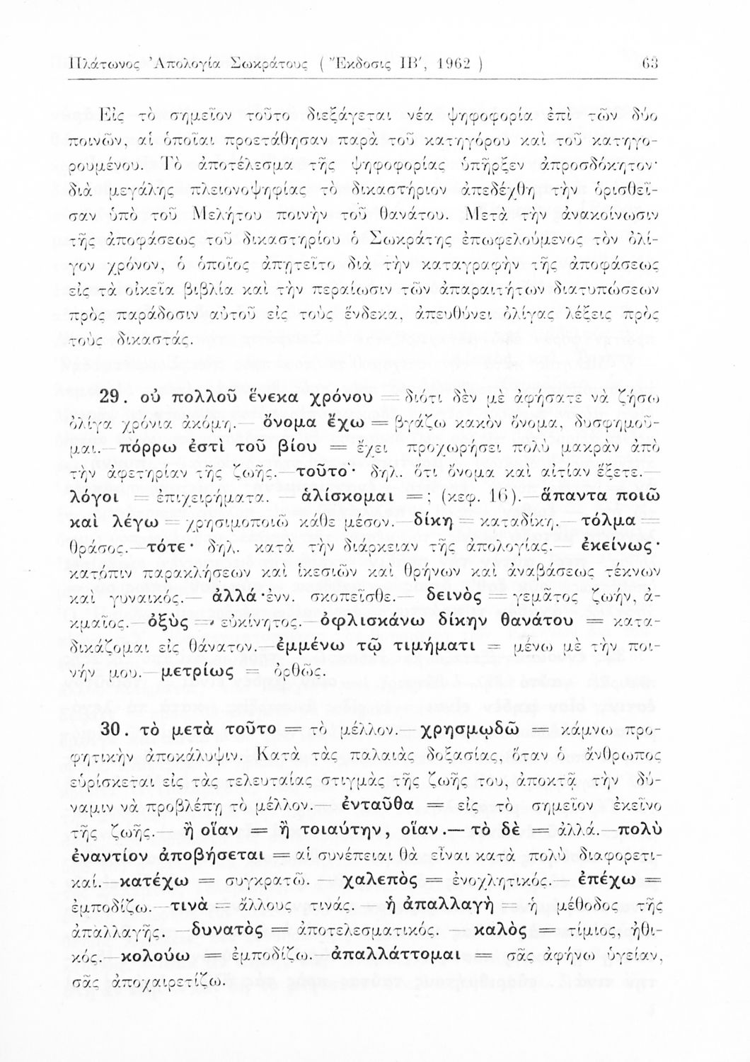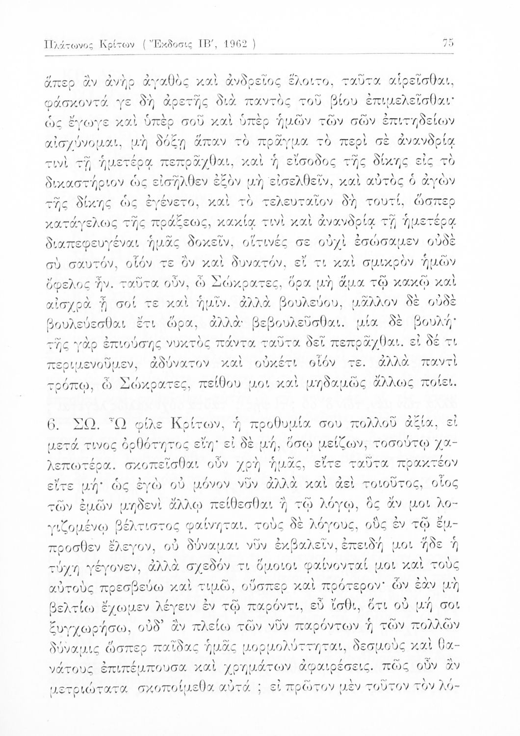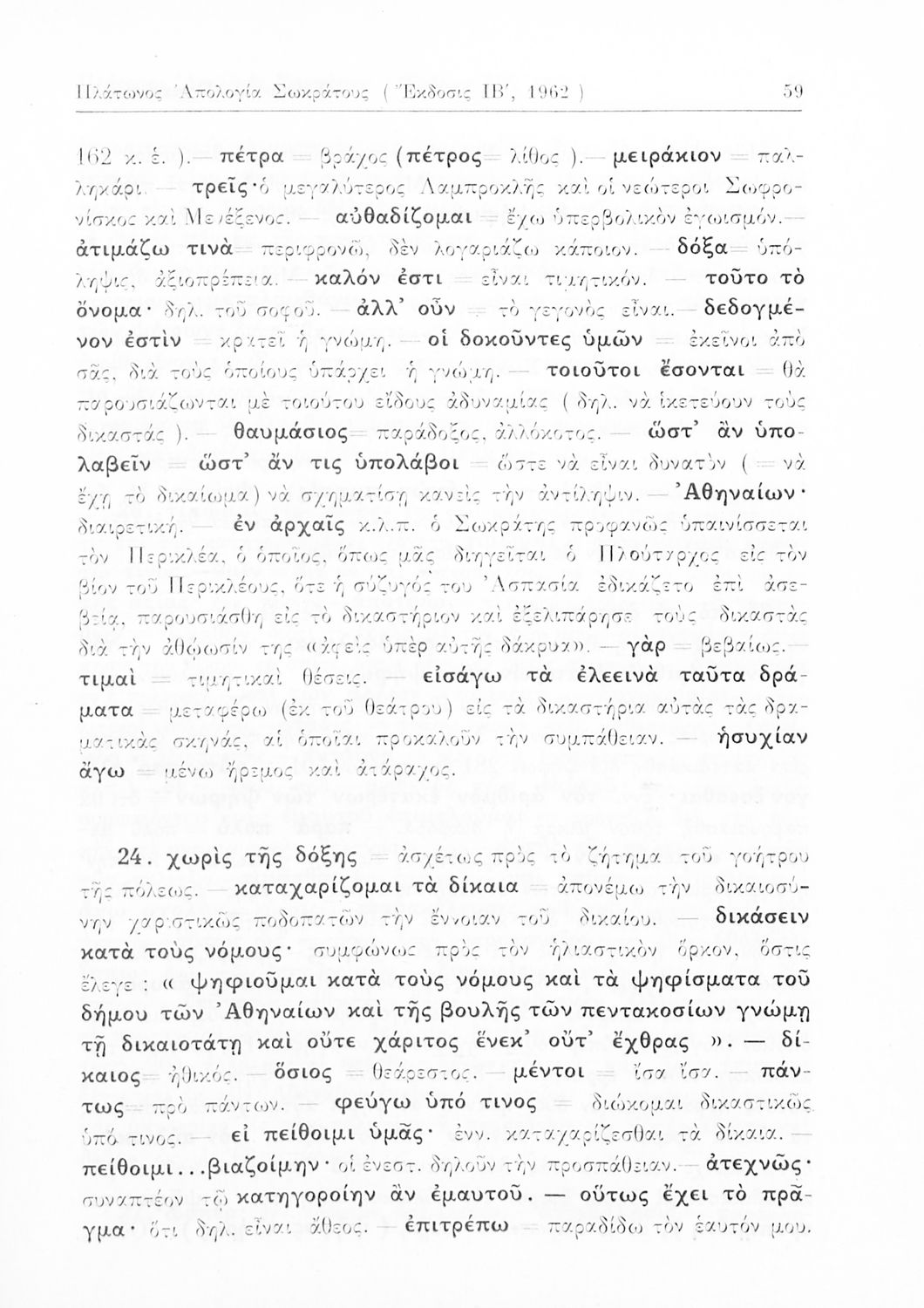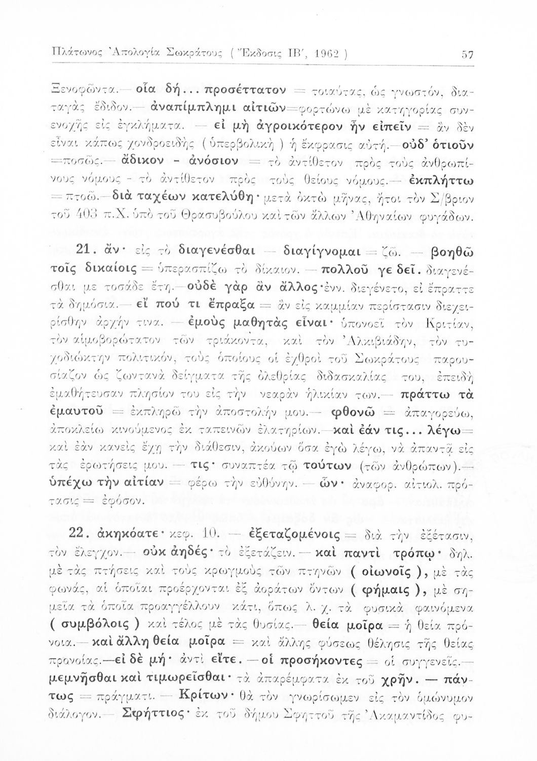 Σχολικό εγχειρίδιο Αρχαίων Ελληνικών Γυμνασίου που περιέχει τα έργα του Πλάτωνα Απολογία Σωκράτους και Κρίτων, ερμηνευτικά και πραγματολογικά σχόλια και λεξιλογικές παρατηρήσεις.