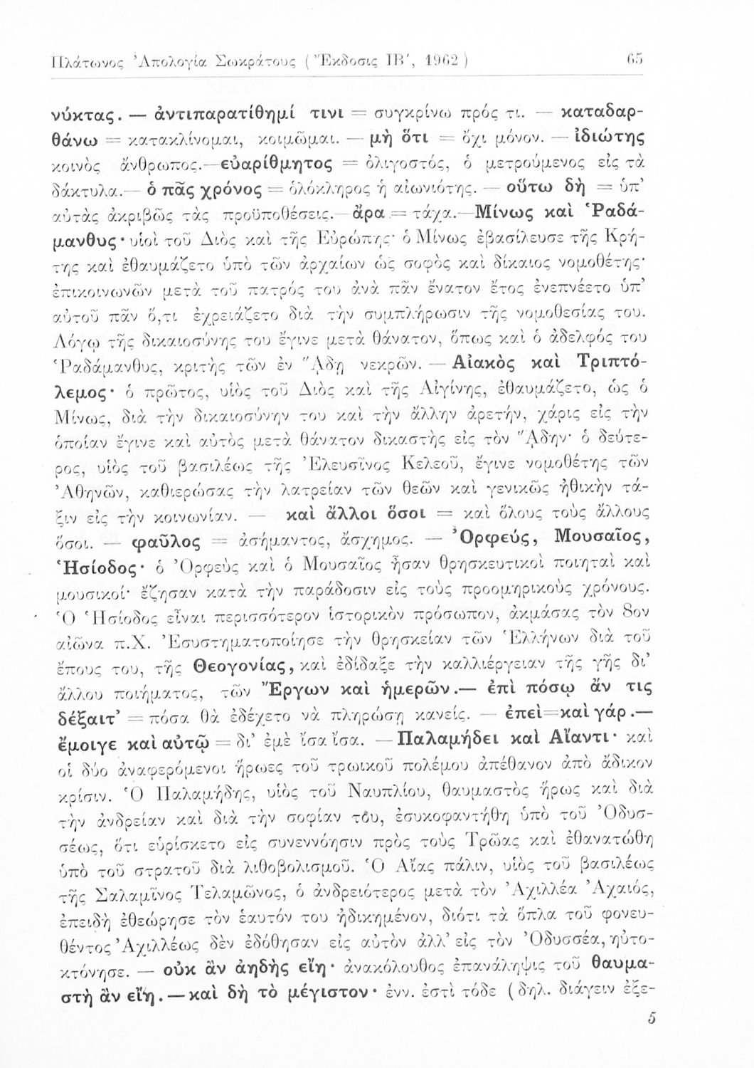 Σχολικό εγχειρίδιο Αρχαίων Ελληνικών της Ε' Γυμνασίου. Το βιβλίο περιέχει τα έργα του Πλάτωνα “Απολογία Σωκράτους” και “Κρίτων” από το πρωτότυπο. Στο δεύτερο μέρος υπάρχουν ερμηνευτικές και λεξιλογικές αναλύσεις των δύο έργων.