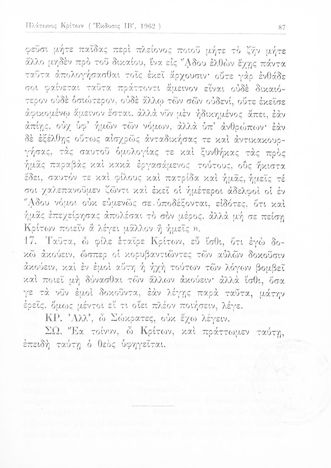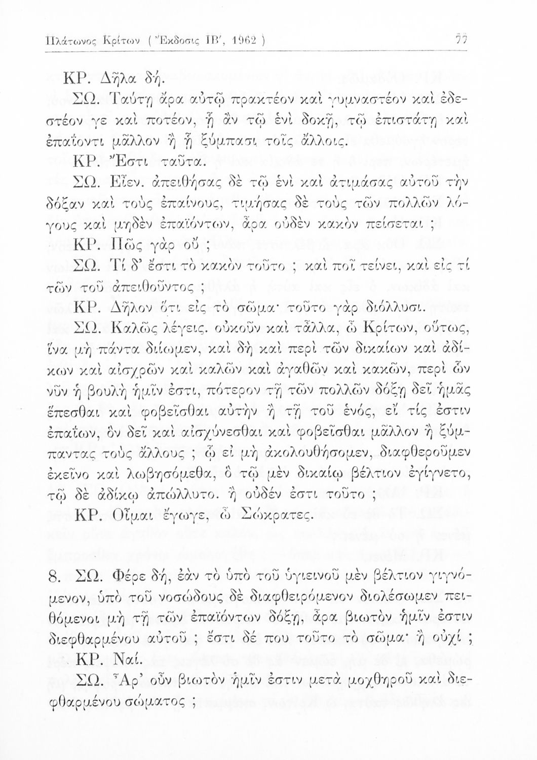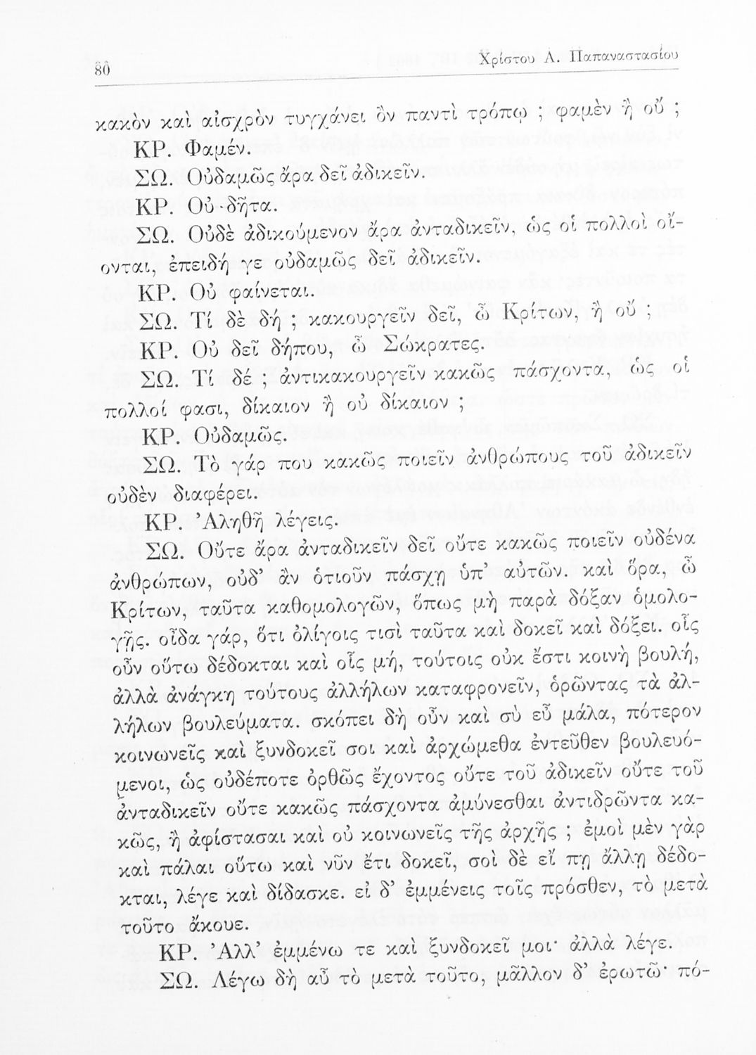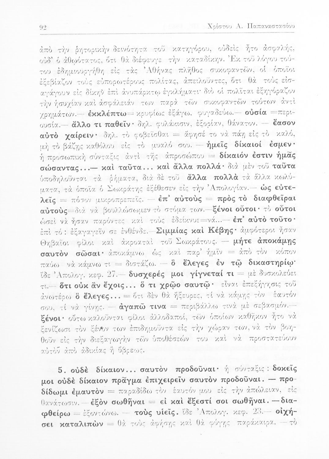 Σχολικό εγχειρίδιο Αρχαίων Ελληνικών της Ε' Γυμνασίου. Το βιβλίο περιέχει τα έργα του Πλάτωνα “Απολογία Σωκράτους” και “Κρίτων” από το πρωτότυπο. Στο δεύτερο μέρος υπάρχουν ερμηνευτικές και λεξιλογικές αναλύσεις των δύο έργων.