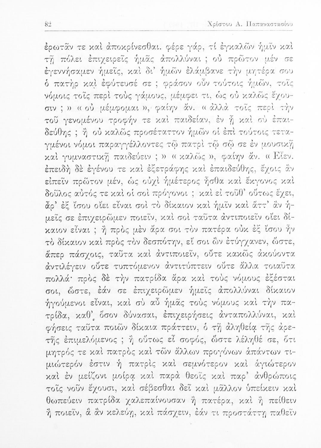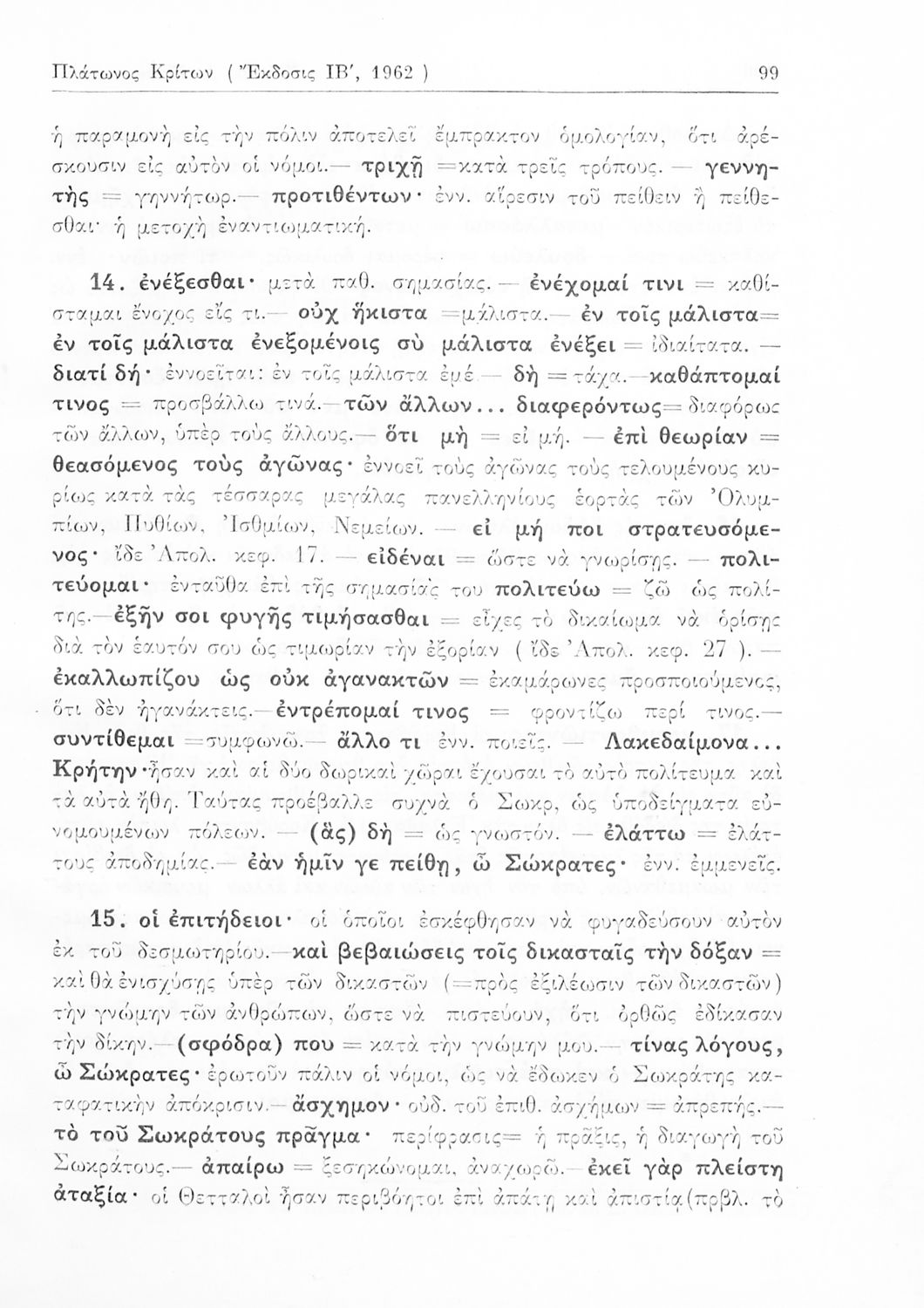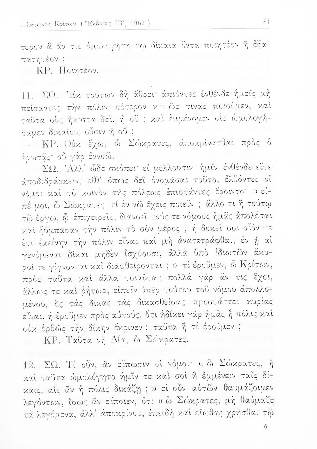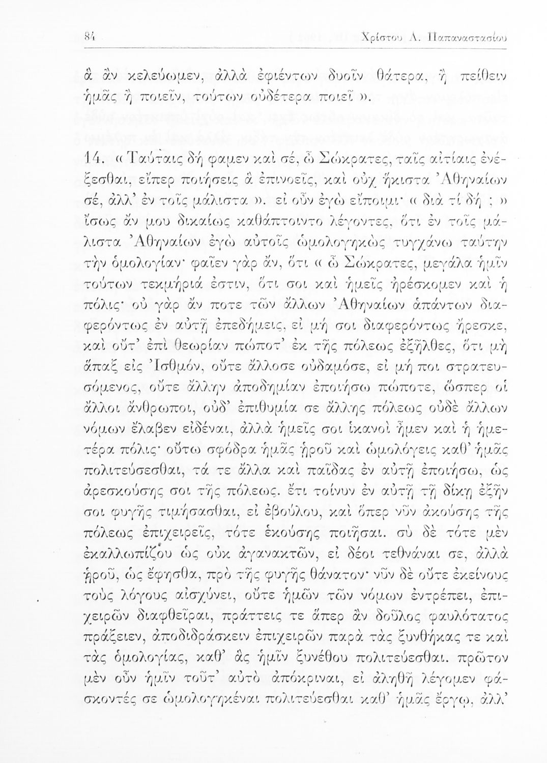 Σχολικό εγχειρίδιο Αρχαίων Ελληνικών της Ε' Γυμνασίου. Το βιβλίο περιέχει τα έργα του Πλάτωνα “Απολογία Σωκράτους” και “Κρίτων” από το πρωτότυπο. Στο δεύτερο μέρος υπάρχουν ερμηνευτικές και λεξιλογικές αναλύσεις των δύο έργων.