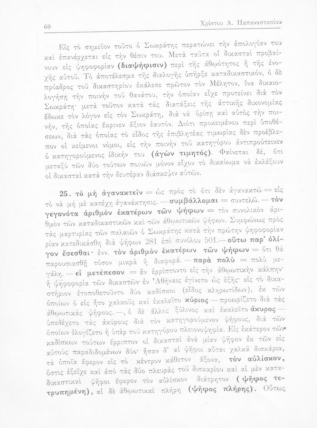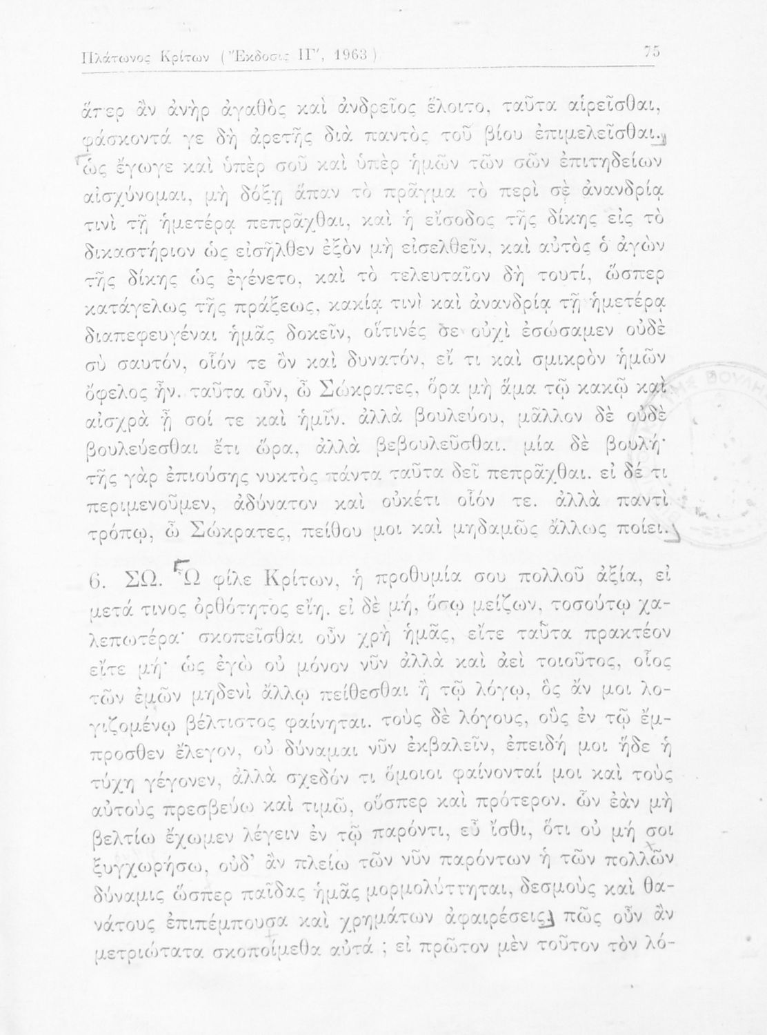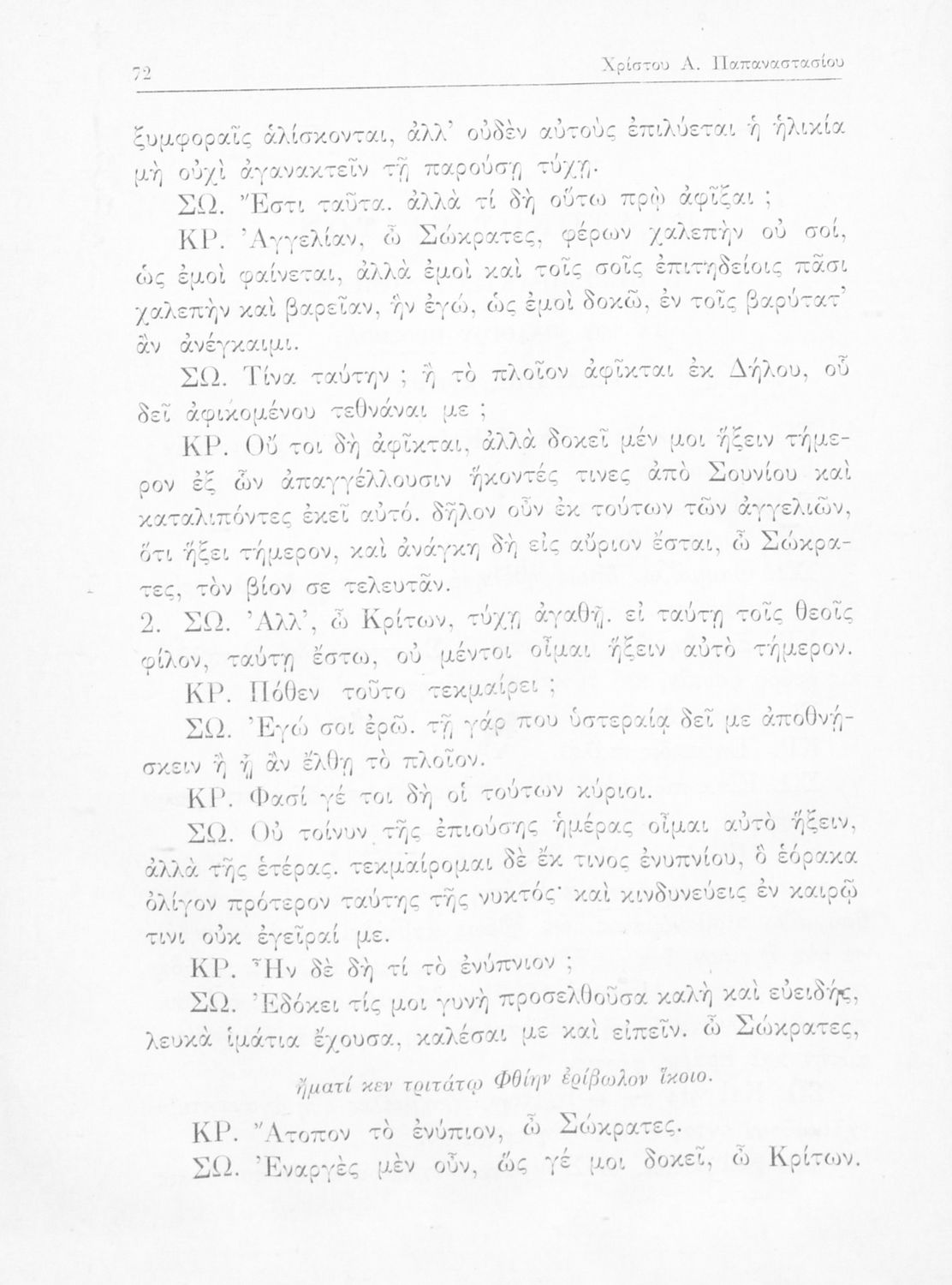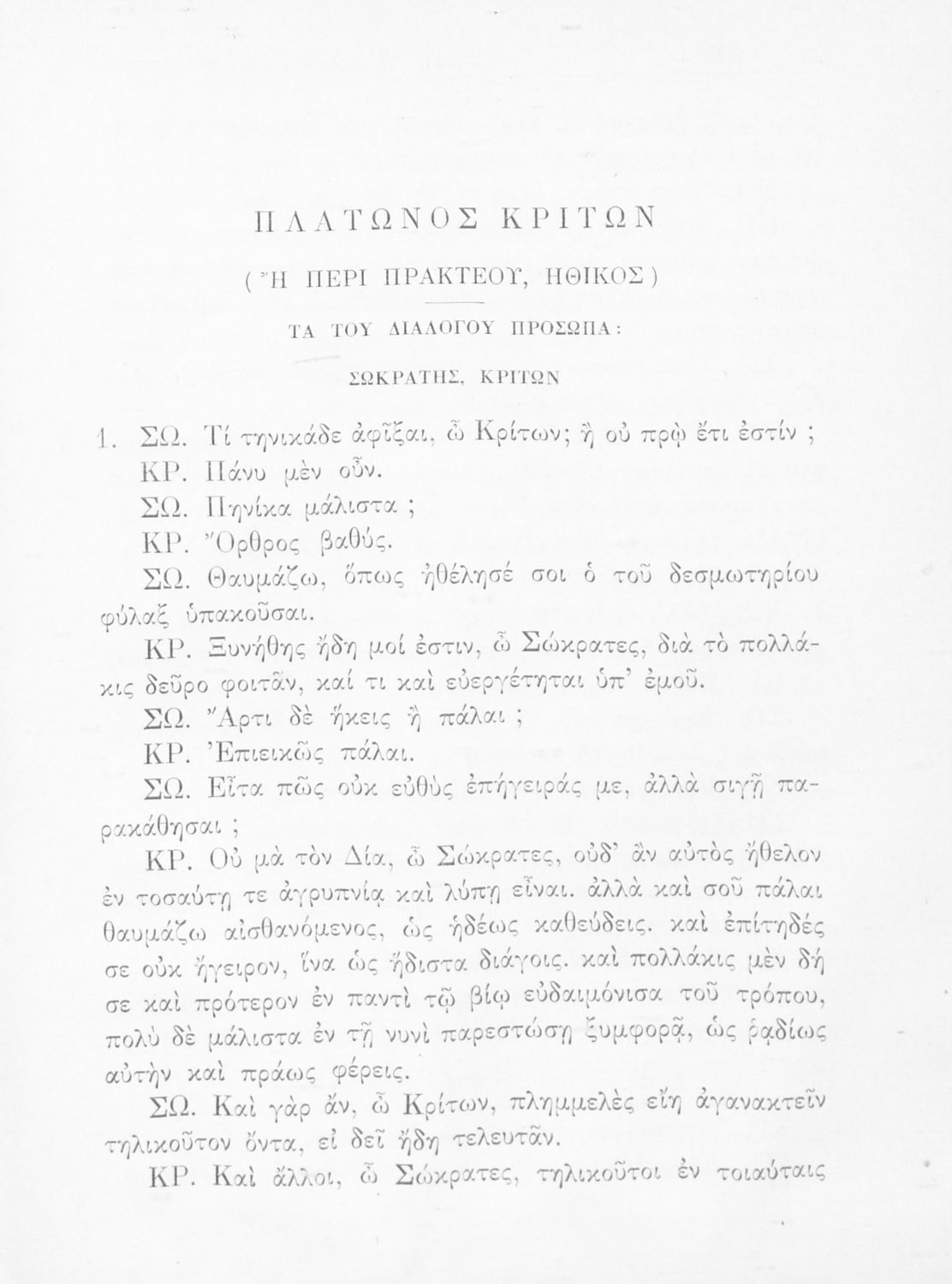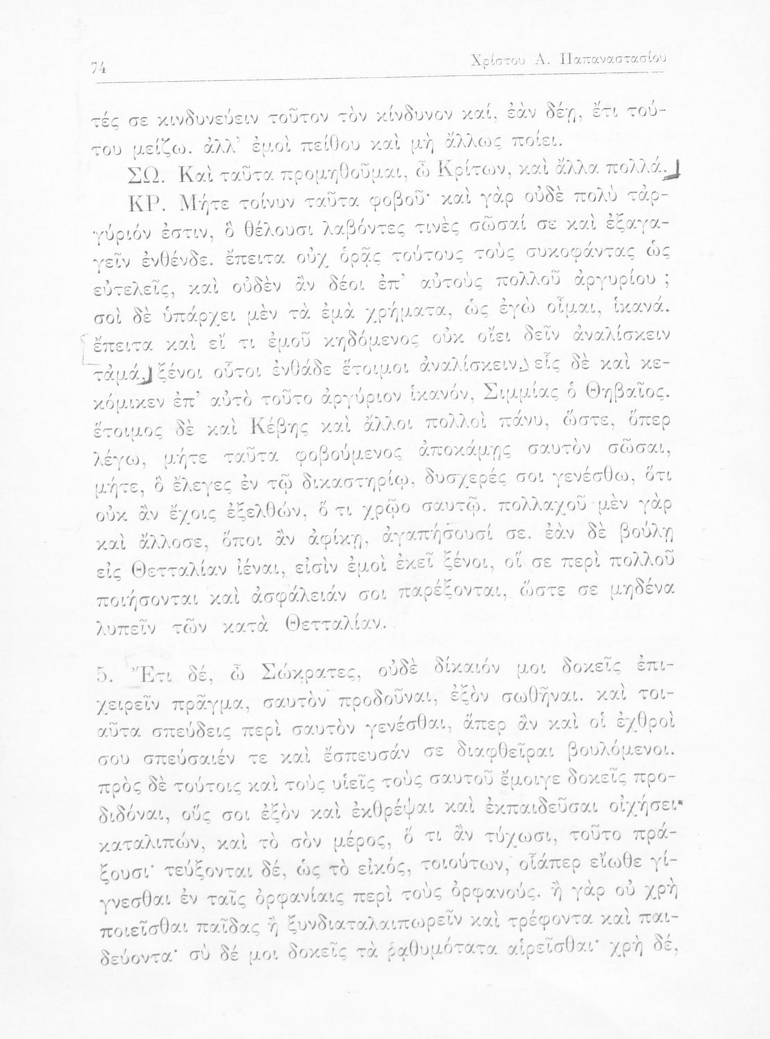 Σχολικό εγχειρίδιο για την Ε΄ Γυμνασίου για το μάθημα των Αρχαίων Ελληνικών και συγκεκριμένα επιλεγόμενα αποσπάσματα από την Απολογία Σωκράτους και τον Κρίτωνα. Το εγχειρίδιο περιλαμβάνει την εισαγωγή, το αρχαίο κείμενο και ερμηνευτικά και πραγματολογικά, γλωσσικά σχόλια πάνω στα έργα του Πλάτωνα, Απολογία Σωκράτους και Κρίτων.