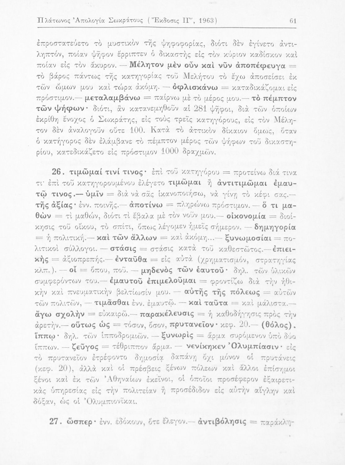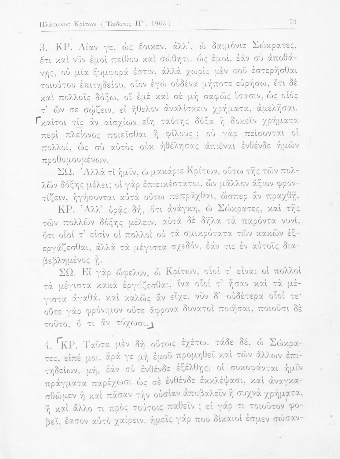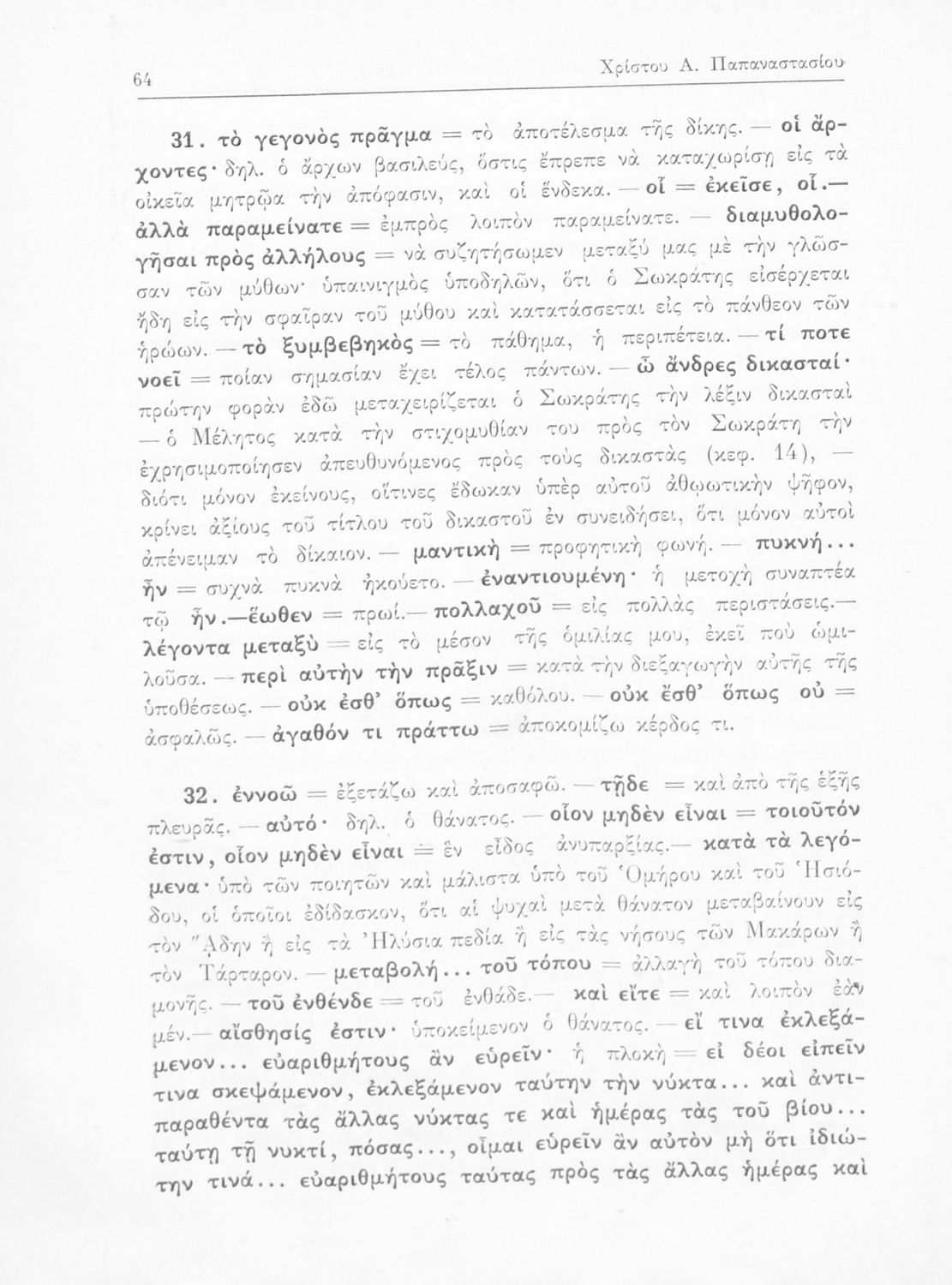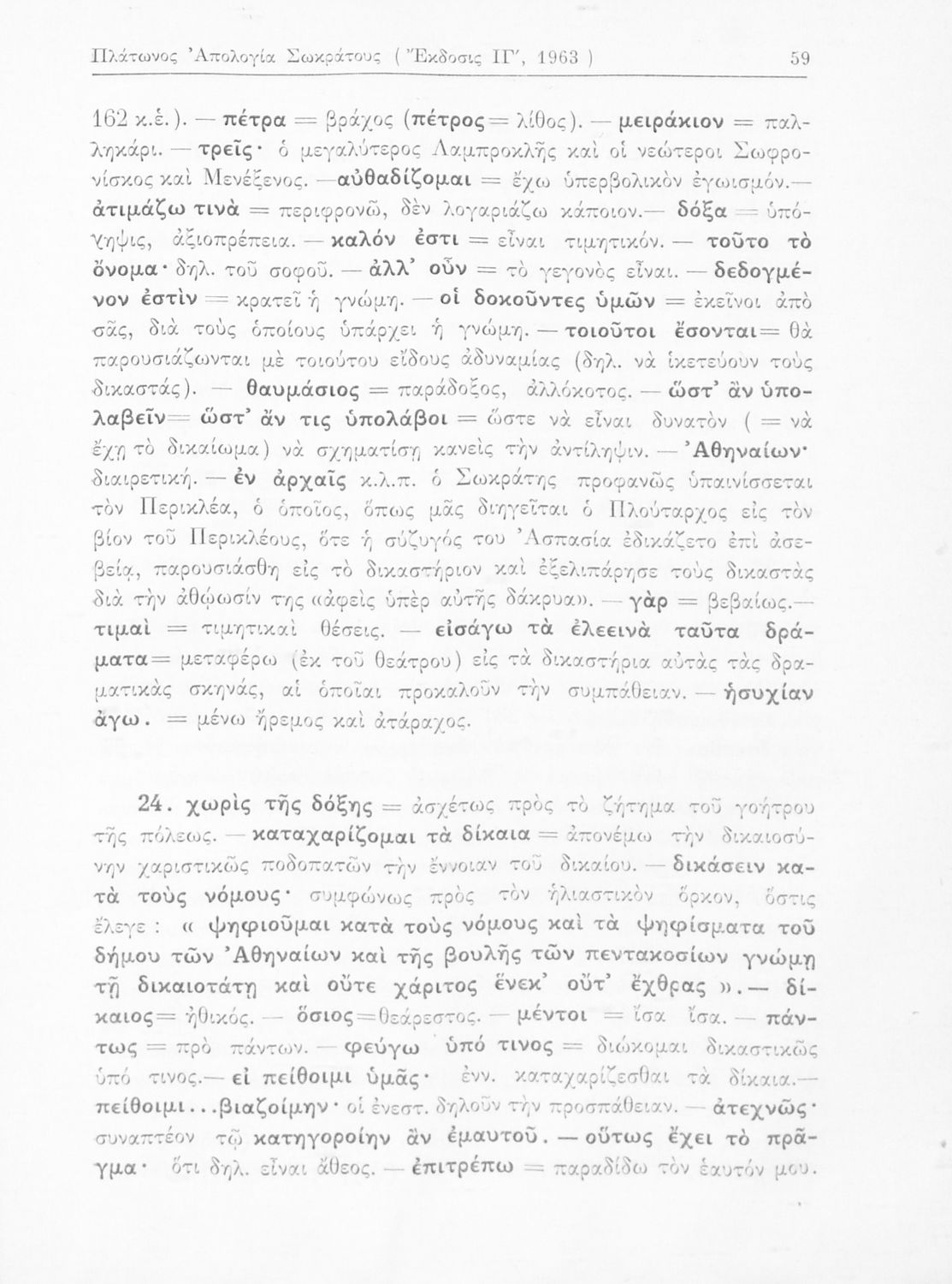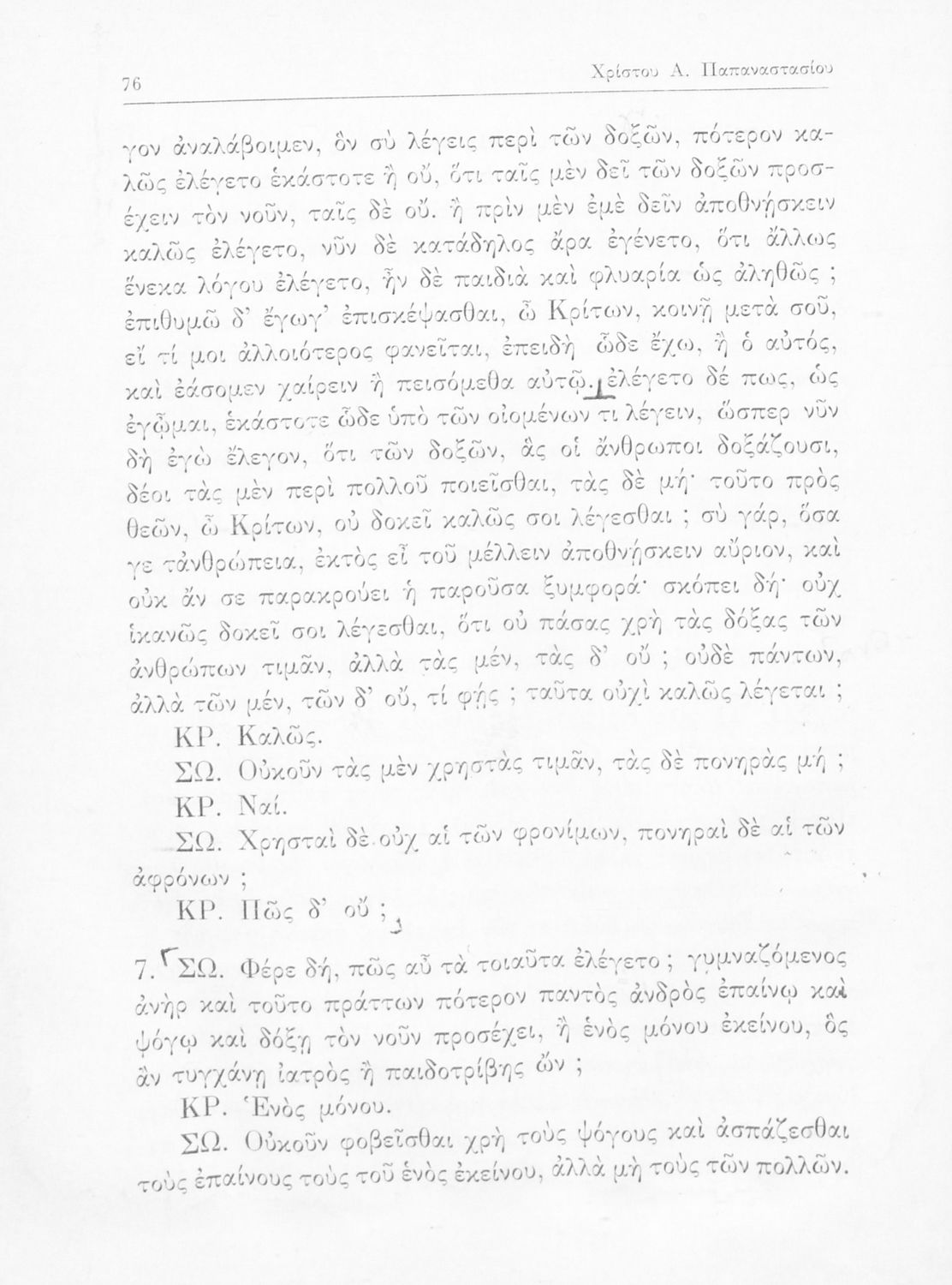 Σχολικό εγχειρίδιο για την Ε΄ Γυμνασίου για το μάθημα των Αρχαίων Ελληνικών και συγκεκριμένα επιλεγόμενα αποσπάσματα από την Απολογία Σωκράτους και τον Κρίτωνα. Το εγχειρίδιο περιλαμβάνει την εισαγωγή, το αρχαίο κείμενο και ερμηνευτικά και πραγματολογικά, γλωσσικά σχόλια πάνω στα έργα του Πλάτωνα, Απολογία Σωκράτους και Κρίτων.