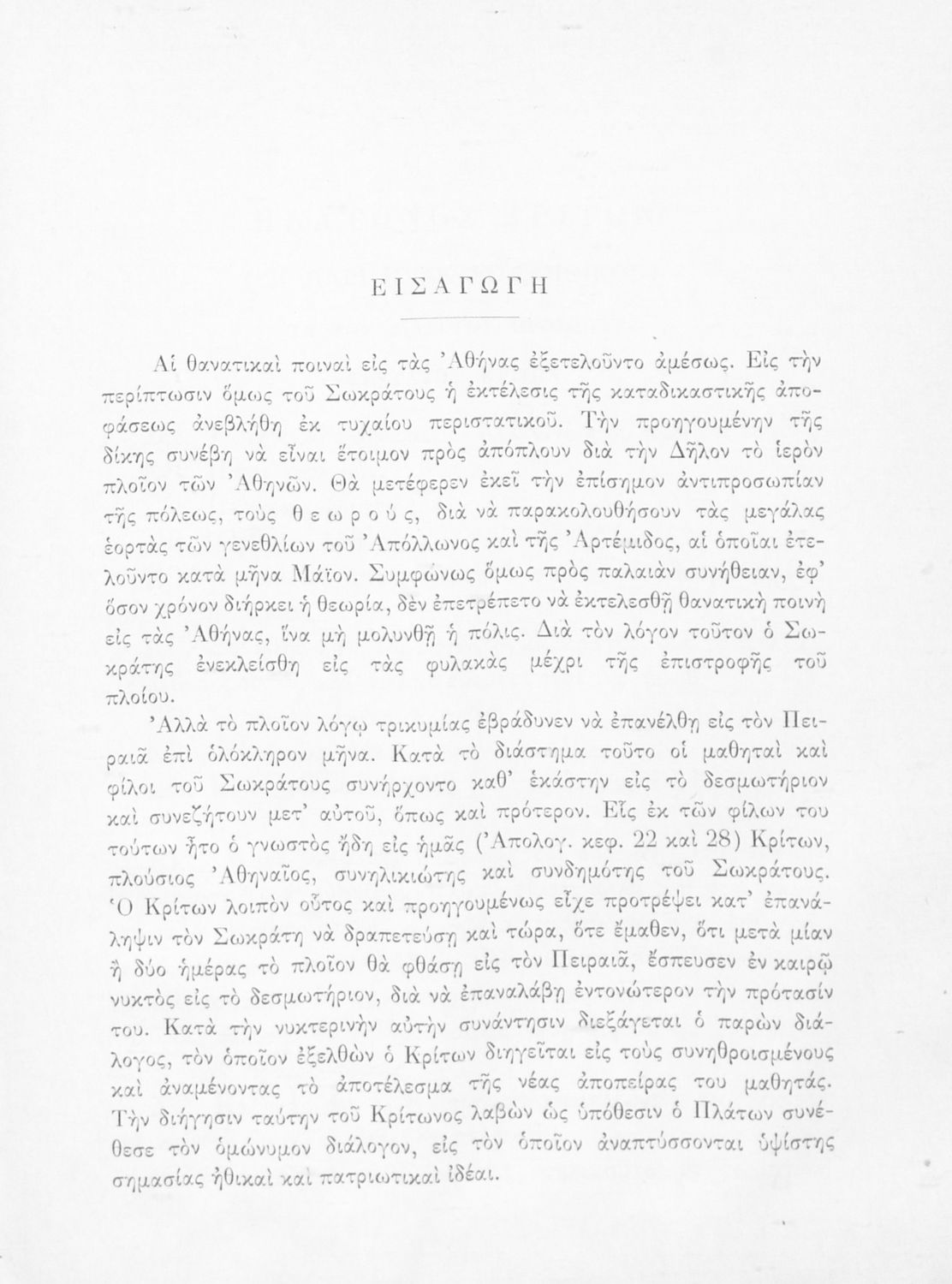 Βαθμίδα εκπαίδευσης: Δευτεροβάθμια Τάξη: Ε' Γυμνασίου Μάθημα: Αρχαία Ελληνικά Γλώσσα: Καθαρεύουσα Παρουσίαση περιεχομένου: Σχολικό εγχειρίδιο για την Ε΄ Γυμνασίου για το μάθημα των Αρχαίων Ελληνικών και συγκεκριμένα επιλεγόμενα αποσπάσματα από την Απολογία Σωκράτους και τον Κρίτωνα. Το εγχειρίδιο περιλαμβάνει την εισαγωγή, το αρχαίο κείμενο και ερμηνευτικά και πραγματολογικά, γλωσσικά σχόλια πάνω στα έργα του Πλάτωνα, Απολογία Σωκράτους και Κρίτων. |