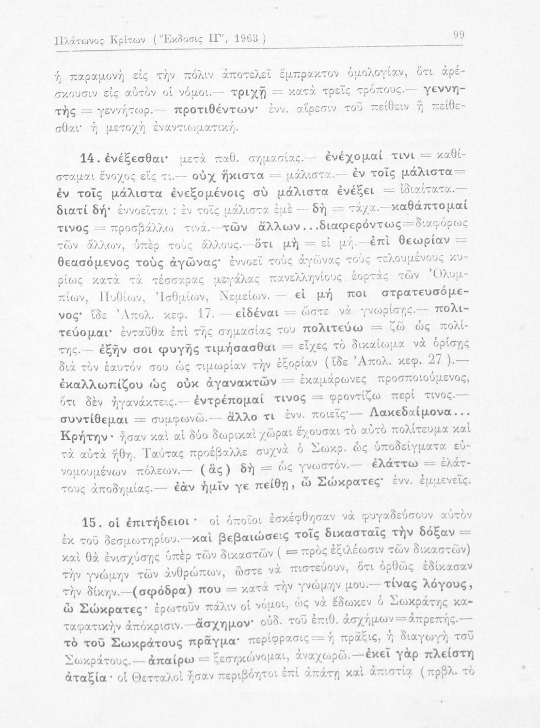 Σχολικό εγχειρίδιο της Ε΄ Γυμνασίου για το μάθημα των Αρχαίων Ελληνικών. Περιέχει το πρωτότυπο κείμενο του Πλάτωνα από την απολογία του Κρίτωνα με ερμηνευτικά, πραγματολογικά σχόλια και λεξιλογικές ...