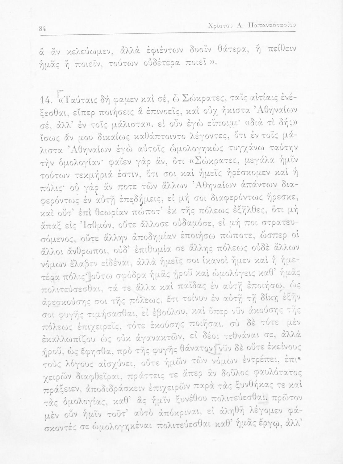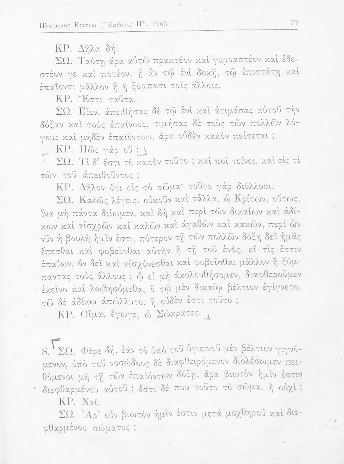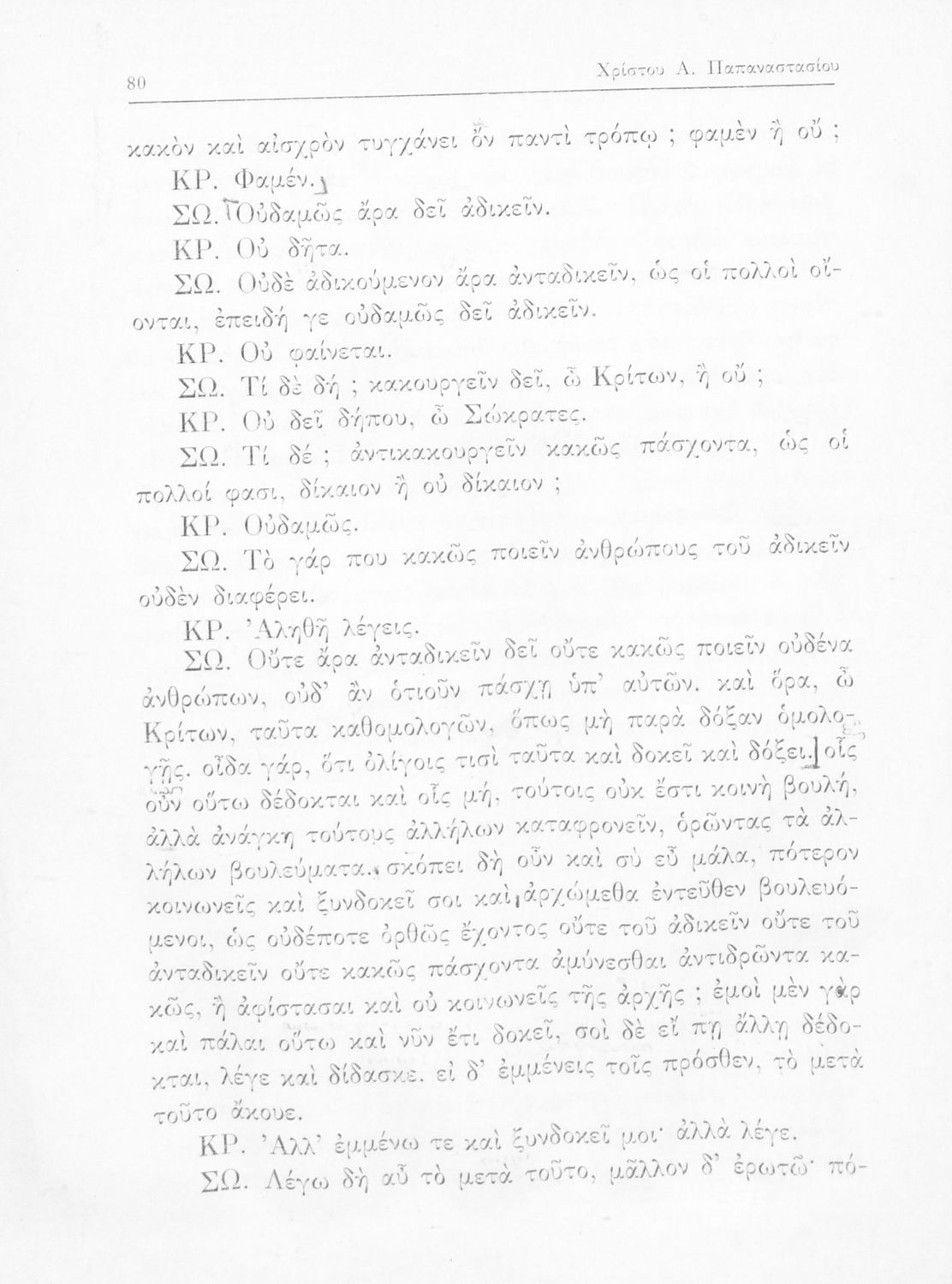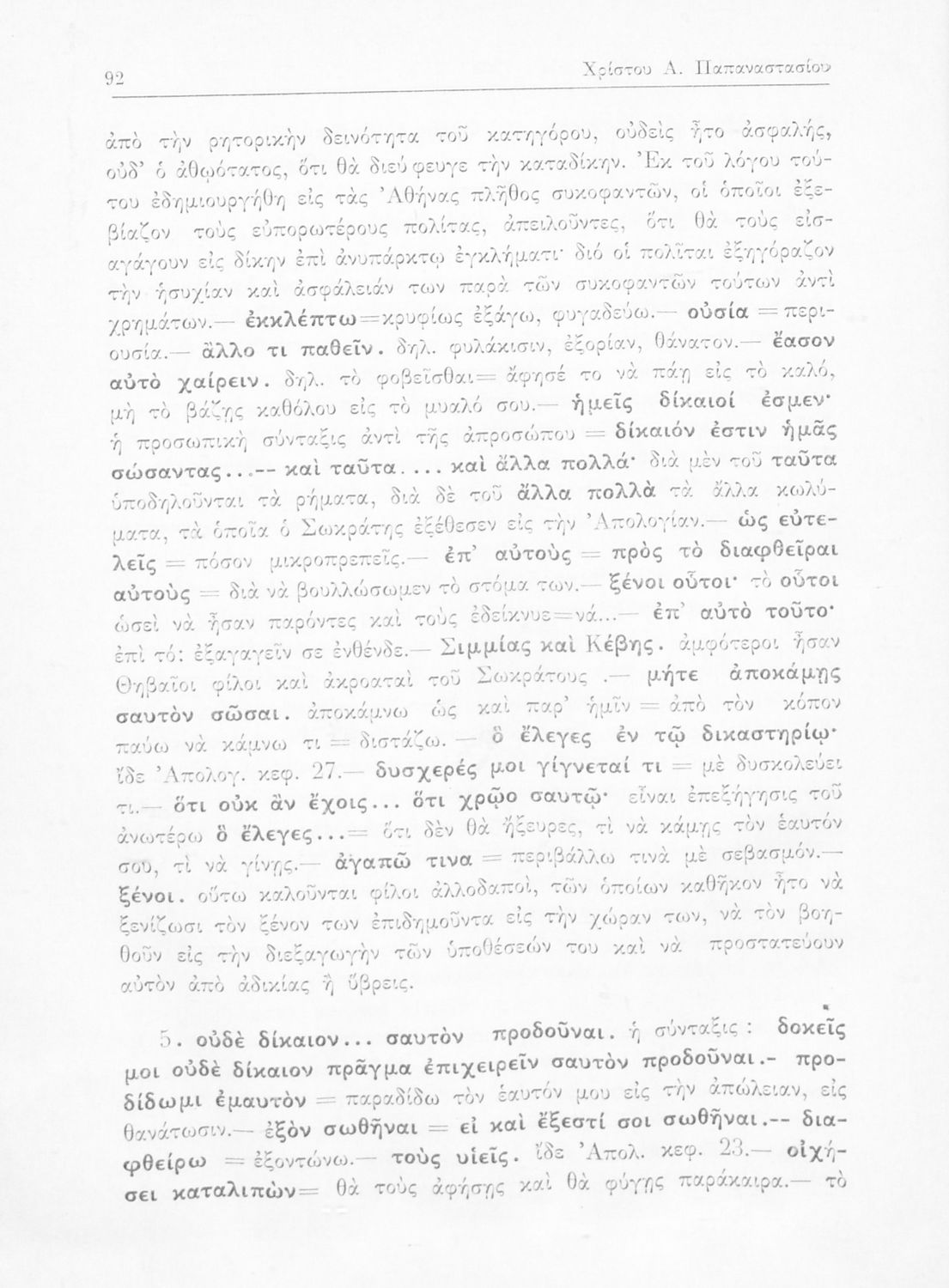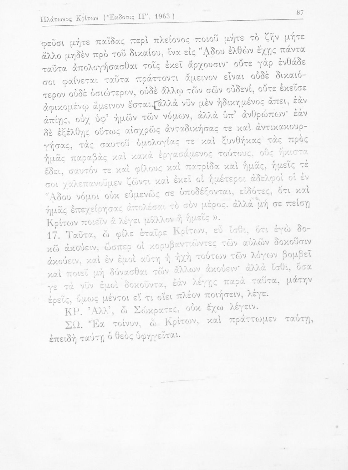 Σχολικό εγχειρίδιο για την Ε΄ Γυμνασίου για το μάθημα των Αρχαίων Ελληνικών και συγκεκριμένα επιλεγόμενα αποσπάσματα από την Απολογία Σωκράτους και τον Κρίτωνα. Το εγχειρίδιο περιλαμβάνει την εισαγωγή, το αρχαίο κείμενο και ερμηνευτικά και πραγματολογικά, γλωσσικά σχόλια πάνω στα έργα του Πλάτωνα, Απολογία Σωκράτους και Κρίτων.