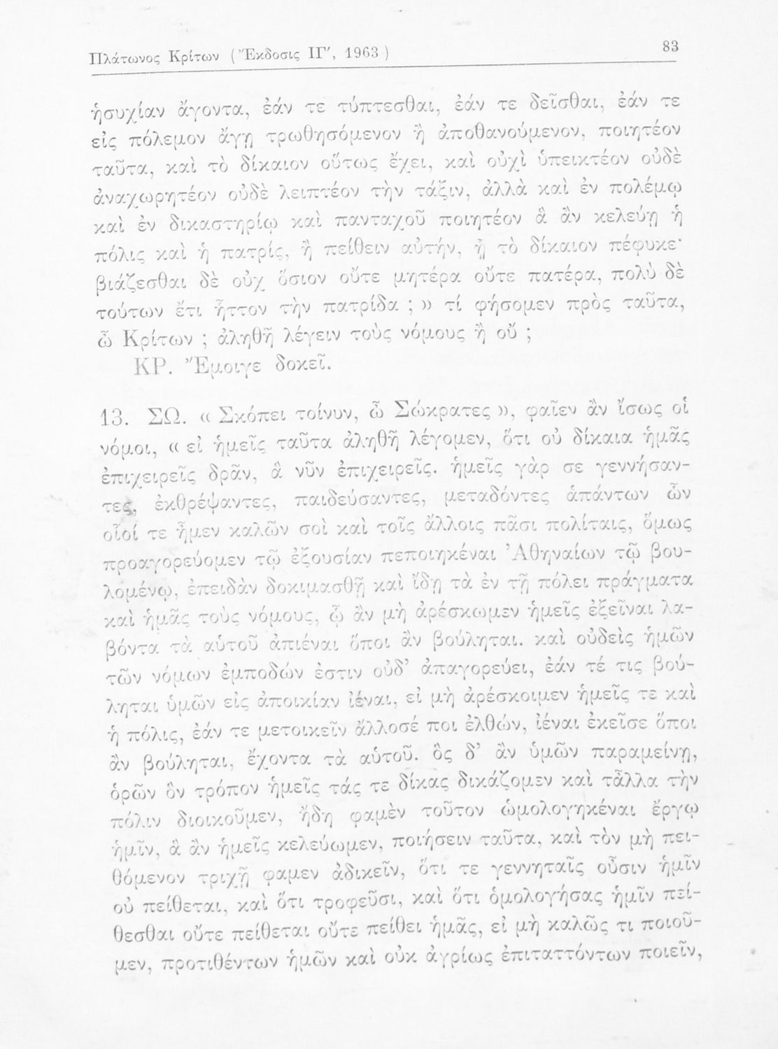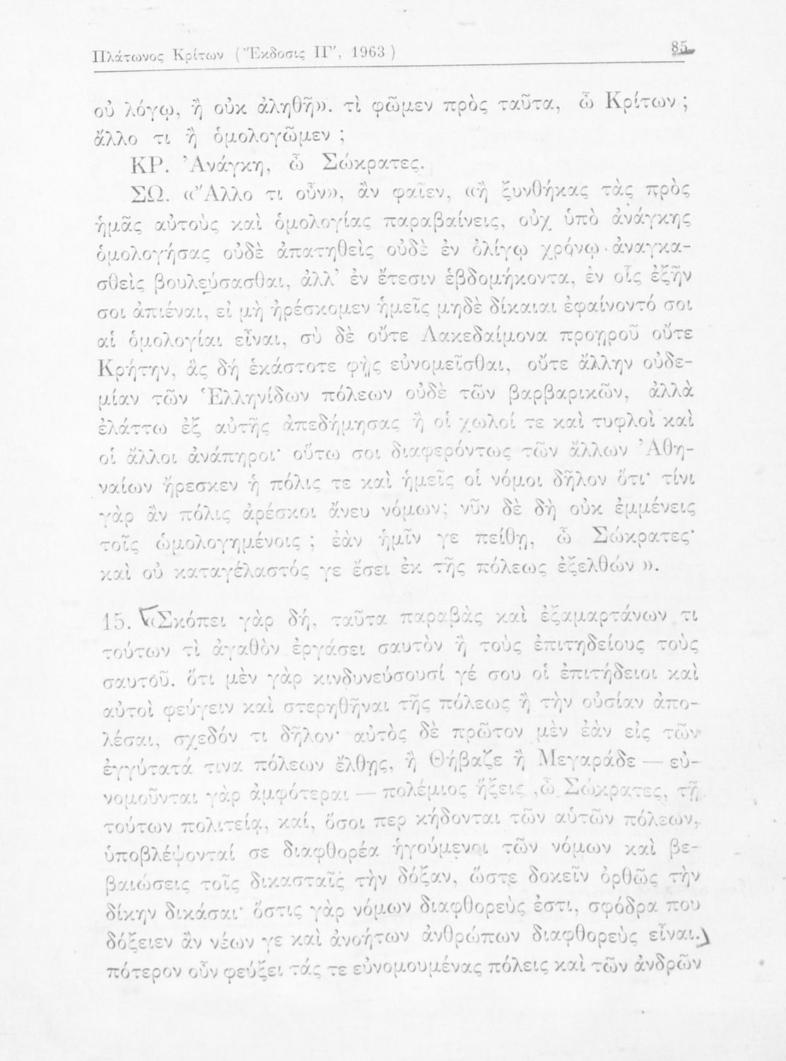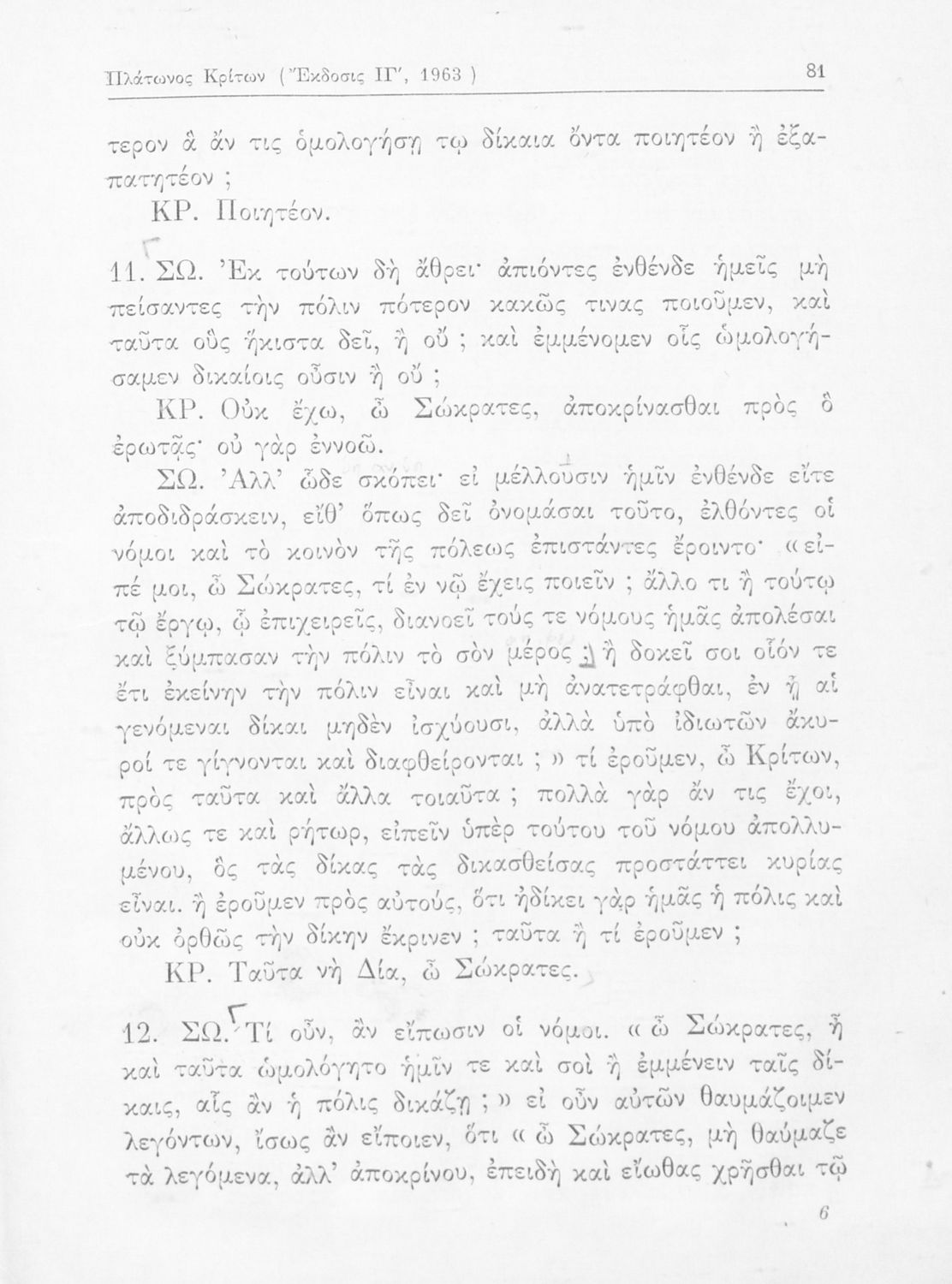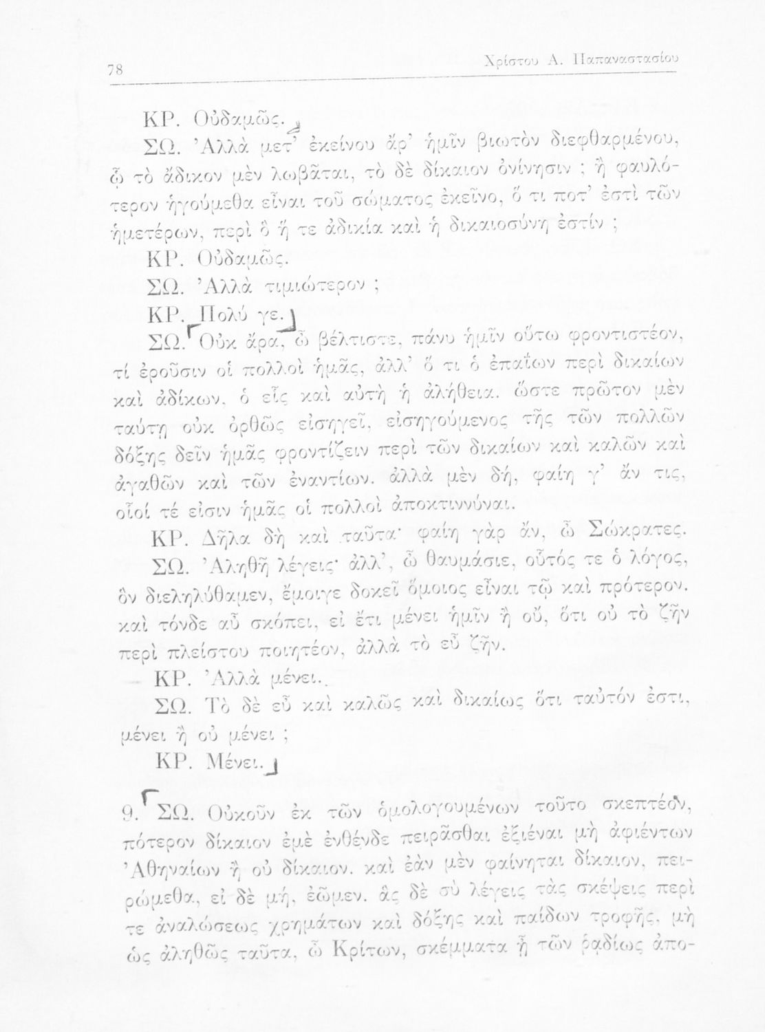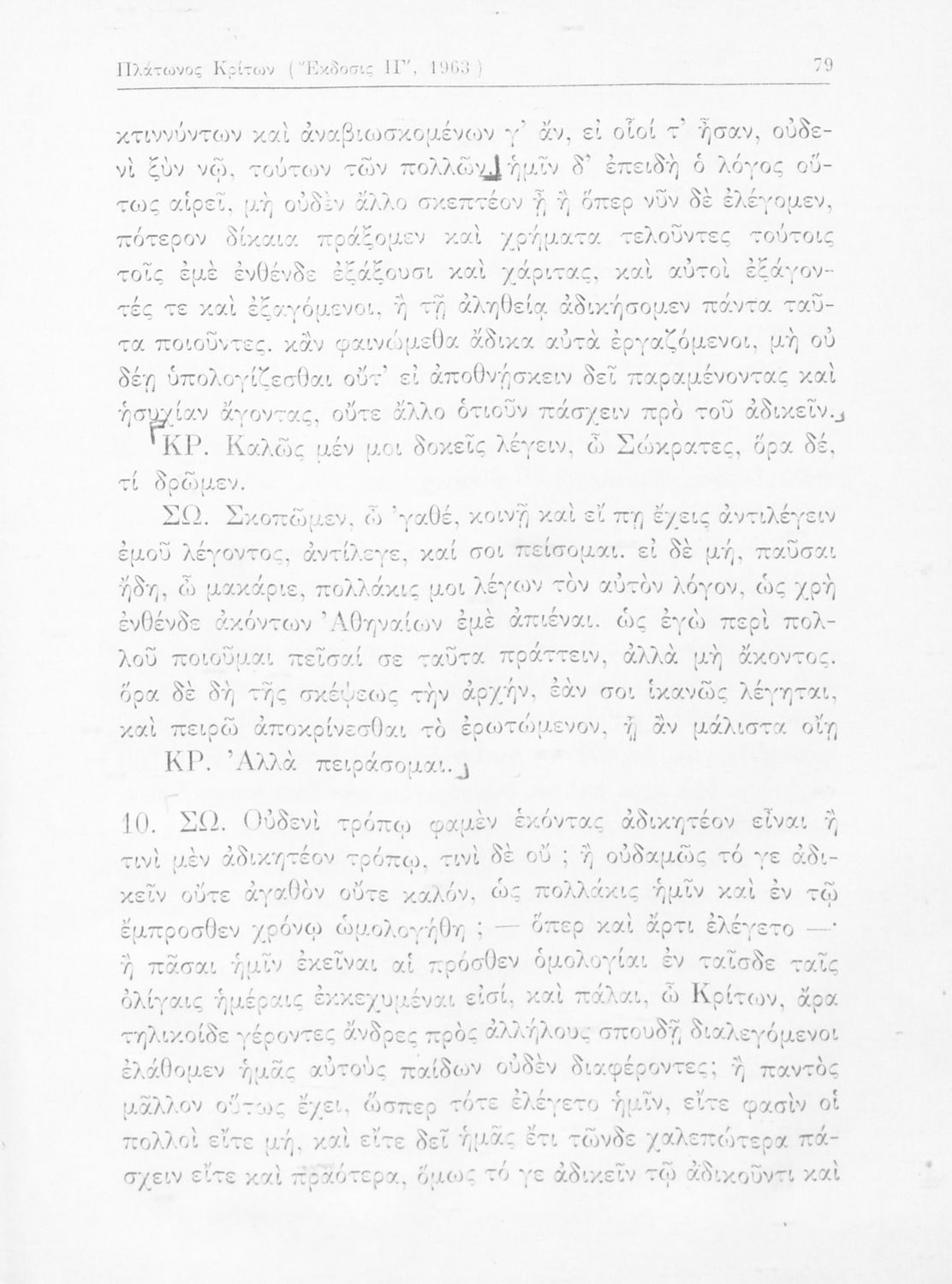 Σχολικό εγχειρίδιο για την Ε΄ Γυμνασίου για το μάθημα των Αρχαίων Ελληνικών και συγκεκριμένα επιλεγόμενα αποσπάσματα από την Απολογία Σωκράτους και τον Κρίτωνα. Το εγχειρίδιο περιλαμβάνει την εισαγωγή, το αρχαίο κείμενο και ερμηνευτικά και πραγματολογικά, γλωσσικά σχόλια πάνω στα έργα του Πλάτωνα, Απολογία Σωκράτους και Κρίτων.