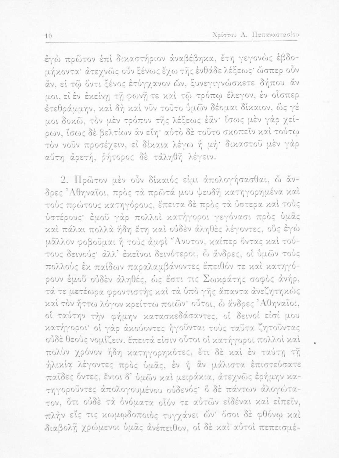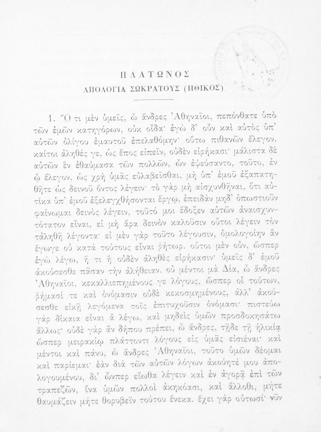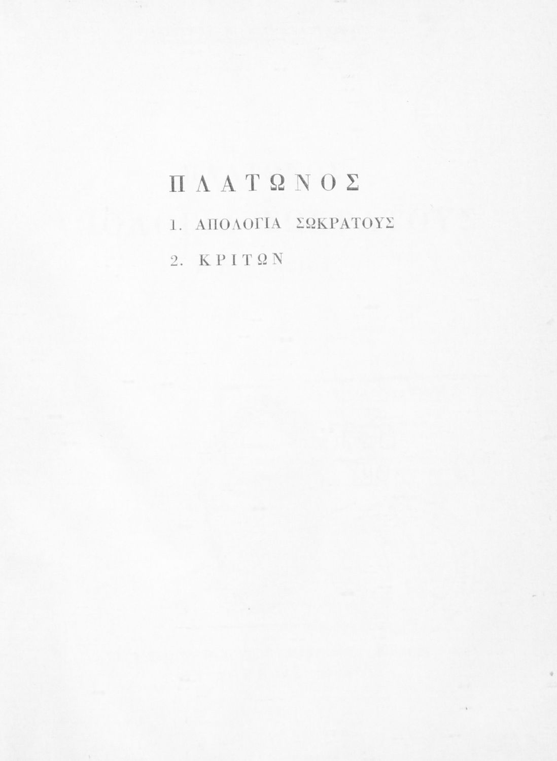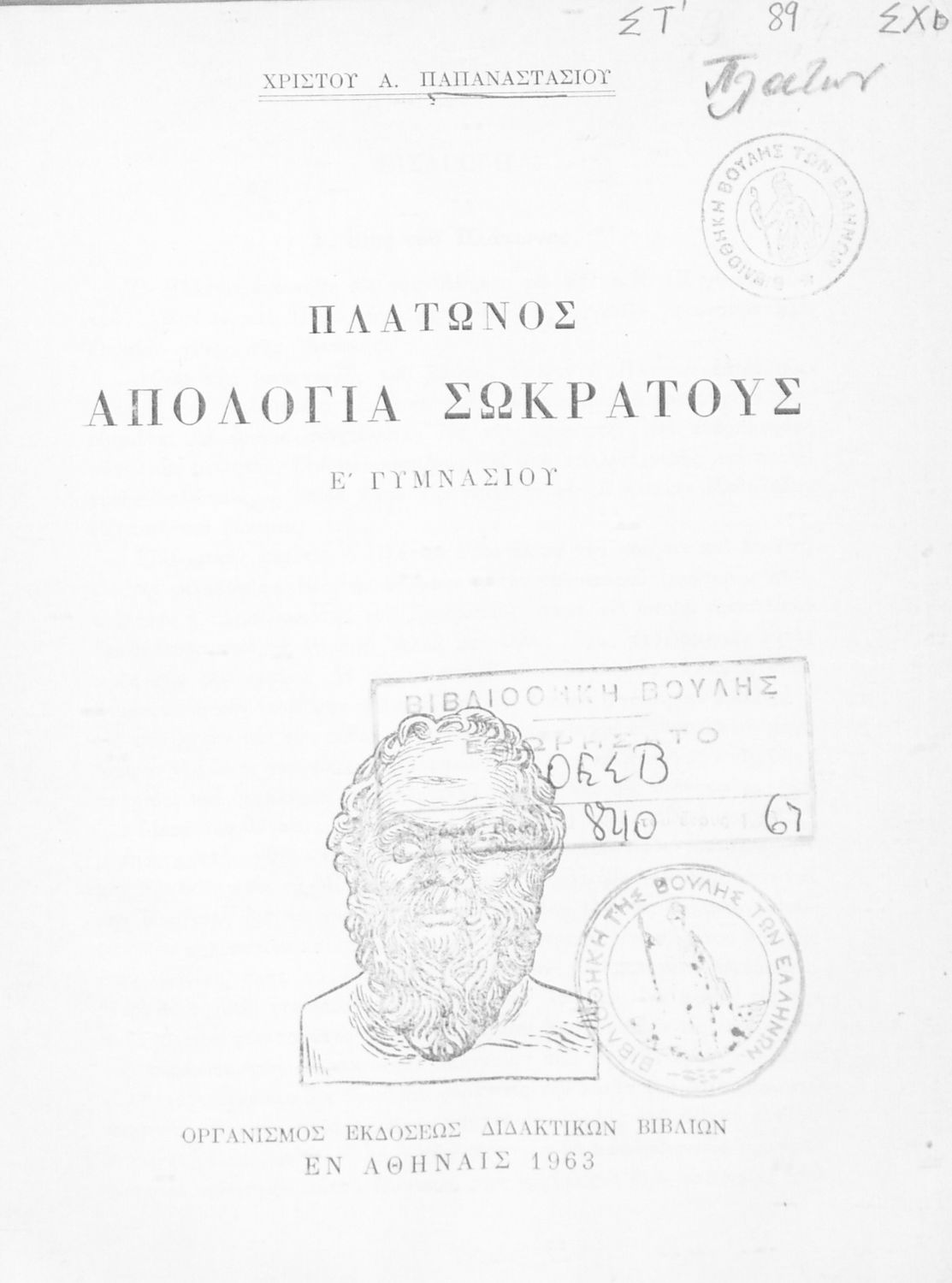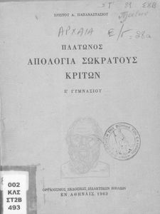 Σχολικό εγχειρίδιο για την Ε΄ Γυμνασίου για το μάθημα των Αρχαίων Ελληνικών και συγκεκριμένα επιλεγόμενα αποσπάσματα από την Απολογία Σωκράτους και τον Κρίτωνα. Το εγχειρίδιο περιλαμβάνει την εισαγωγή, το αρχαίο κείμενο και ερμηνευτικά και πραγματολογικά, γλωσσικά σχόλια πάνω στα έργα του Πλάτωνα, Απολογία Σωκράτους και Κρίτων.
