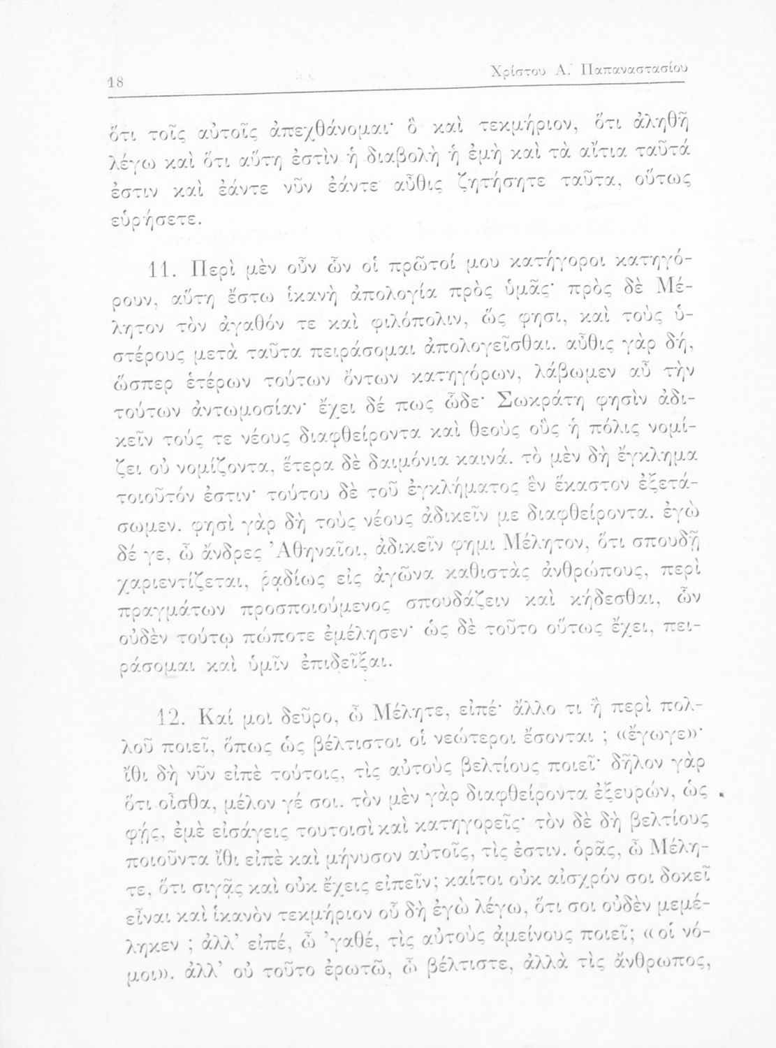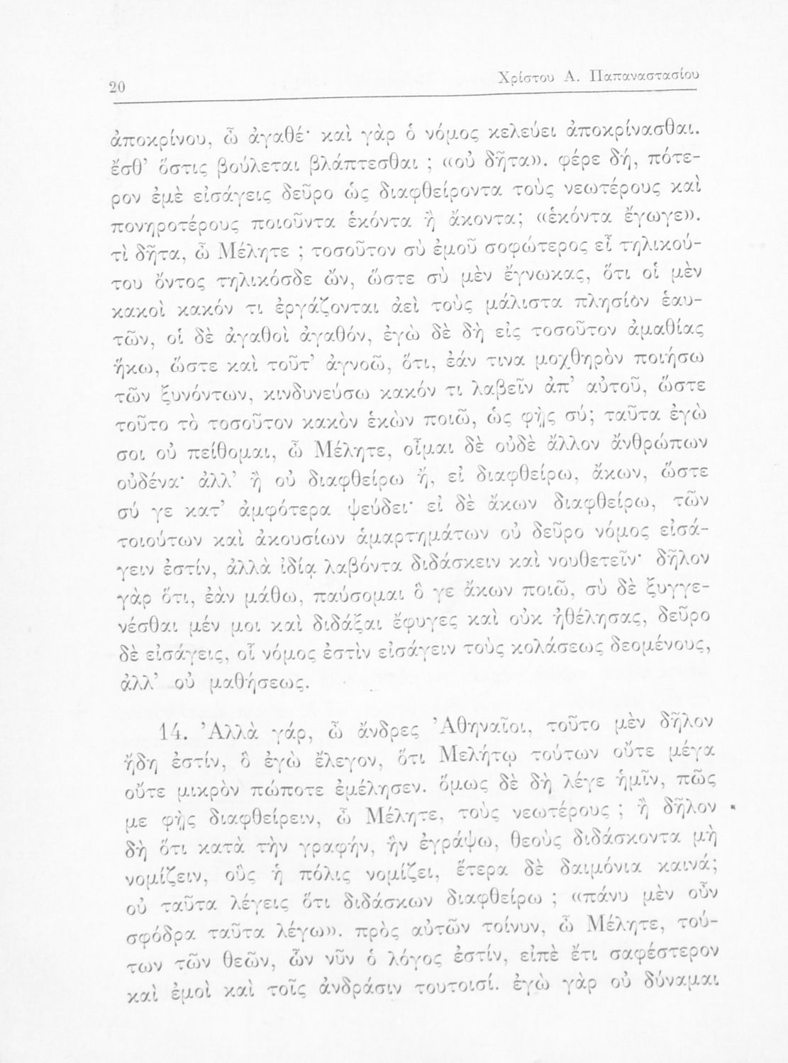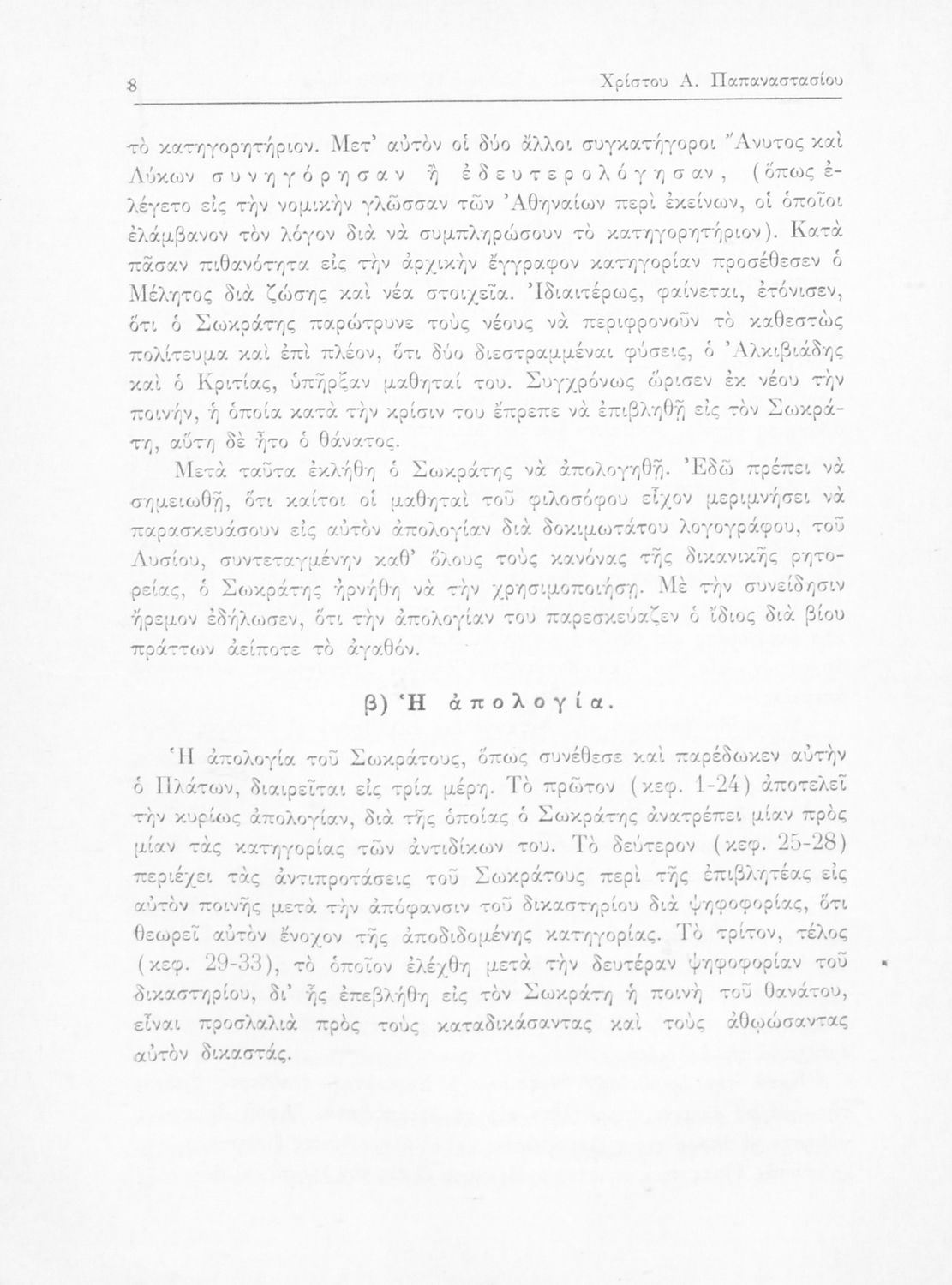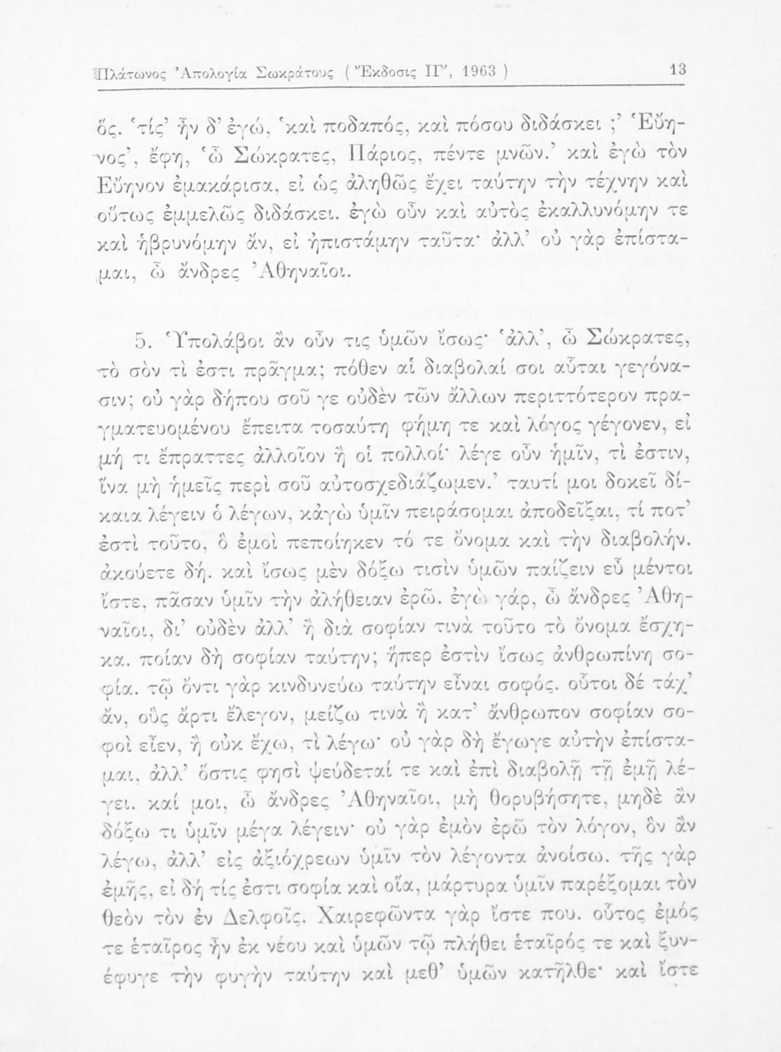 Σχολικό εγχειρίδιο για την Ε΄ Γυμνασίου για το μάθημα των Αρχαίων Ελληνικών και συγκεκριμένα επιλεγόμενα αποσπάσματα από την Απολογία Σωκράτους και τον Κρίτωνα. Το εγχειρίδιο περιλαμβάνει την εισαγωγή, το αρχαίο κείμενο και ερμηνευτικά και πραγματολογικά, γλωσσικά σχόλια πάνω στα έργα του Πλάτωνα, Απολογία Σωκράτους και Κρίτων.
