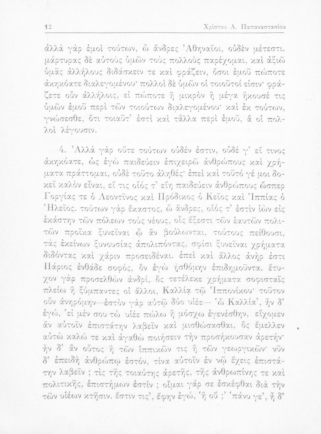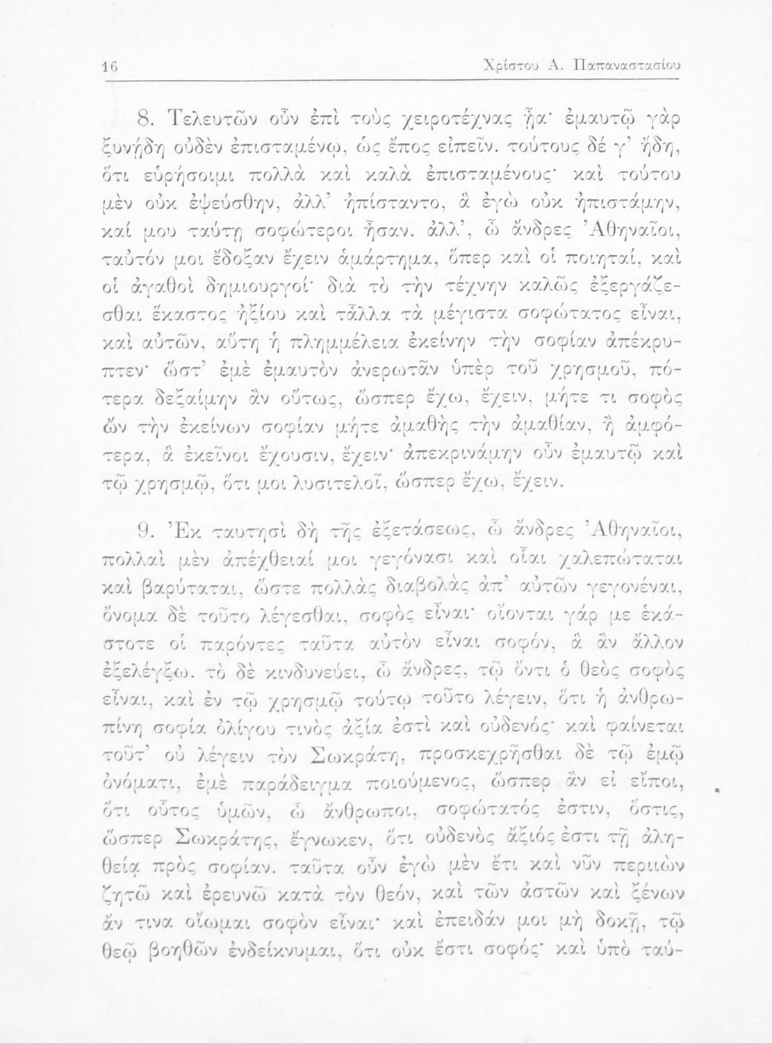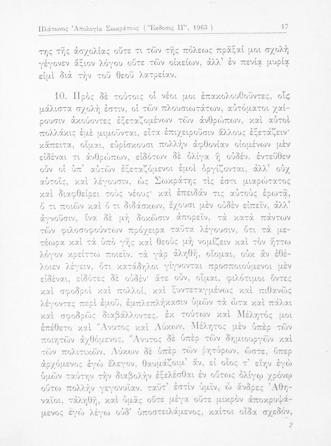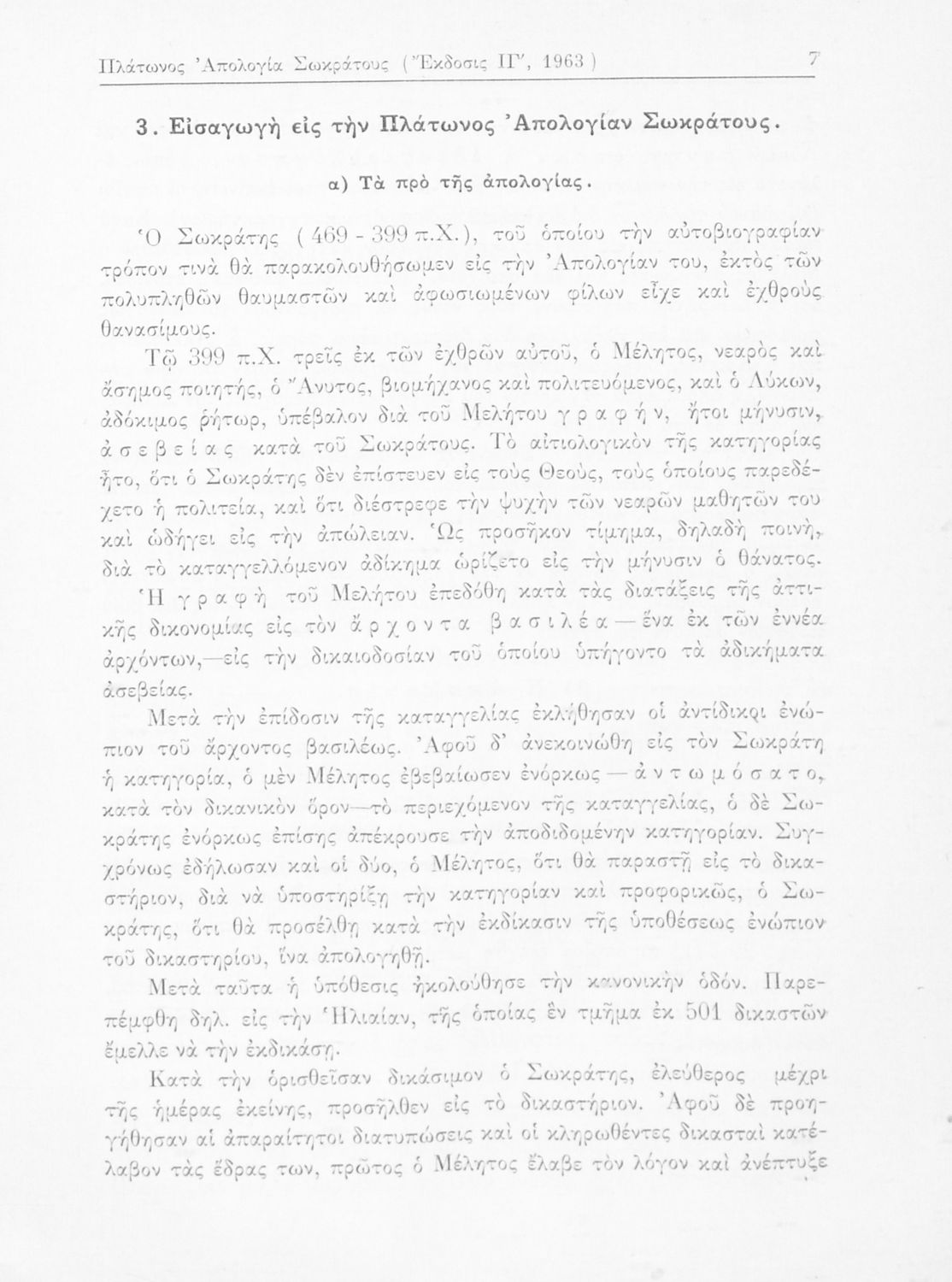 Σχολικό εγχειρίδιο για την Ε΄ Γυμνασίου για το μάθημα των Αρχαίων Ελληνικών και συγκεκριμένα επιλεγόμενα αποσπάσματα από την Απολογία Σωκράτους και τον Κρίτωνα. Το εγχειρίδιο περιλαμβάνει την εισαγωγή, το αρχαίο κείμενο και ερμηνευτικά και πραγματολογικά, γλωσσικά σχόλια πάνω στα έργα του Πλάτωνα, Απολογία Σωκράτους και Κρίτων.