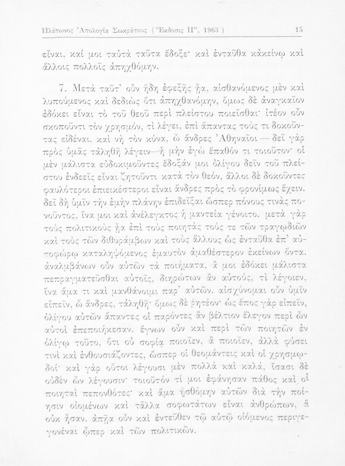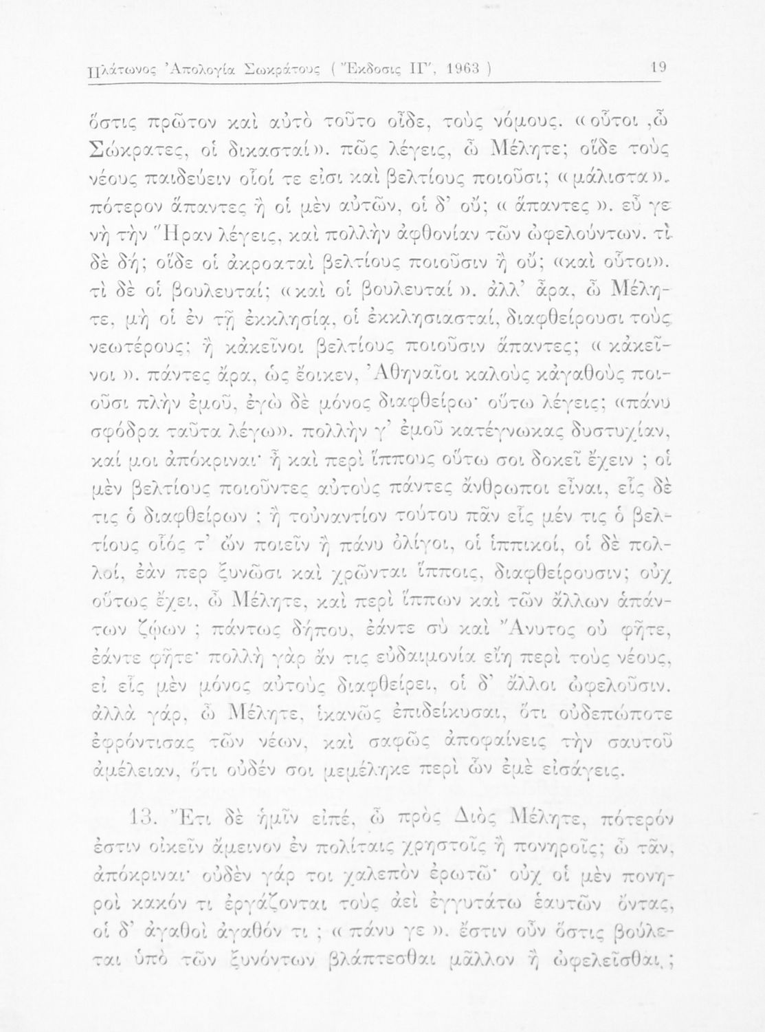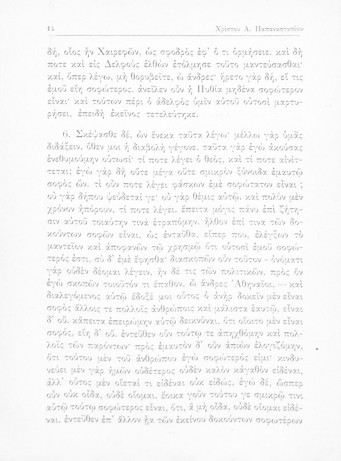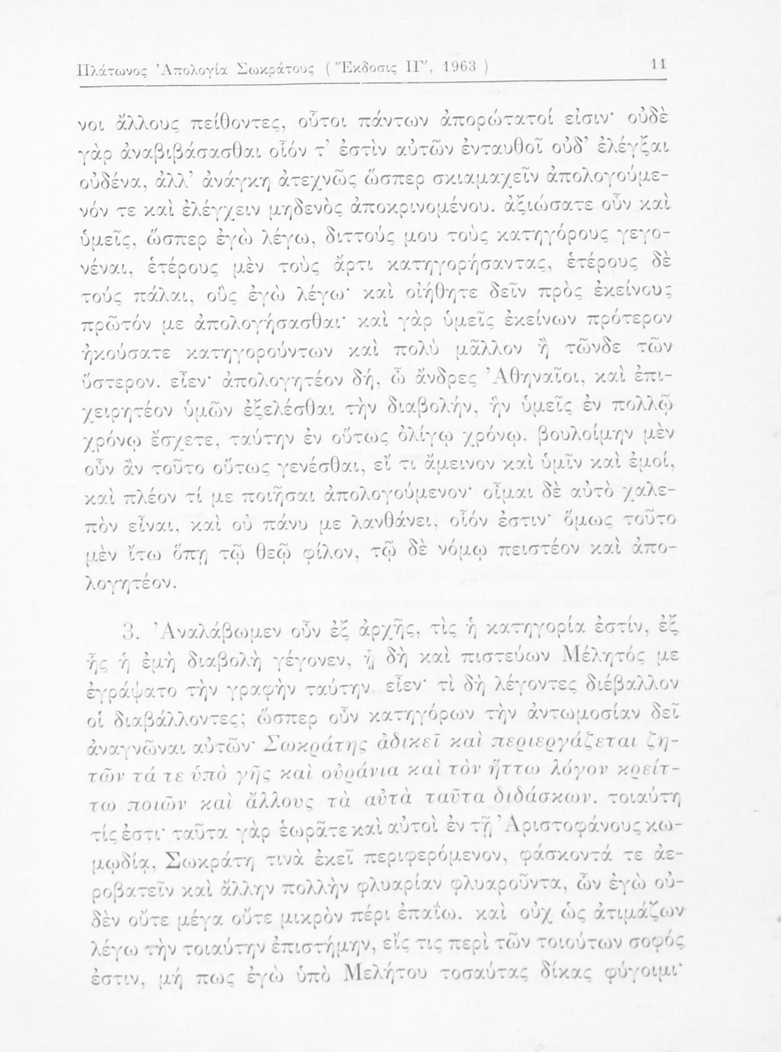 Σχολικό εγχειρίδιο για την Ε΄ Γυμνασίου για το μάθημα των Αρχαίων Ελληνικών και συγκεκριμένα επιλεγόμενα αποσπάσματα από την Απολογία Σωκράτους και τον Κρίτωνα. Το εγχειρίδιο περιλαμβάνει την εισαγωγή, το αρχαίο κείμενο και ερμηνευτικά και πραγματολογικά, γλωσσικά σχόλια πάνω στα έργα του Πλάτωνα, Απολογία Σωκράτους και Κρίτων.