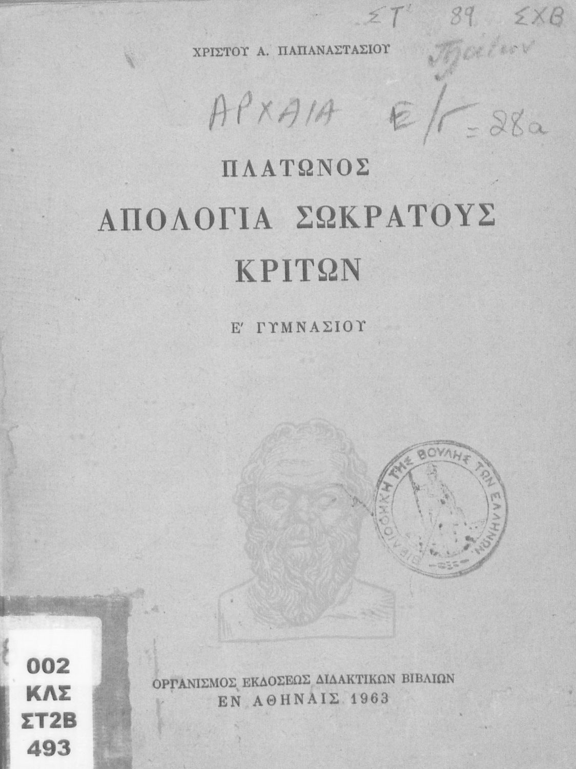 Βαθμίδα εκπαίδευσης: Δευτεροβάθμια Τάξη: Ε' Γυμνασίου Μάθημα: Αρχαία Ελληνικά Γλώσσα: Καθαρεύουσα Παρουσίαση περιεχομένου: Σχολικό εγχειρίδιο για την Ε΄ Γυμνασίου για το μάθημα των Αρχαίων Ελληνικών και συγκεκριμένα επιλεγόμενα αποσπάσματα από την Απολογία Σωκράτους και τον Κρίτωνα. Το εγχειρίδιο περιλαμβάνει την εισαγωγή, το αρχαίο κείμενο και ερμηνευτικά και πραγματολογικά, γλωσσικά σχόλια πάνω στα έργα του Πλάτωνα, Απολογία Σωκράτους και Κρίτων. |