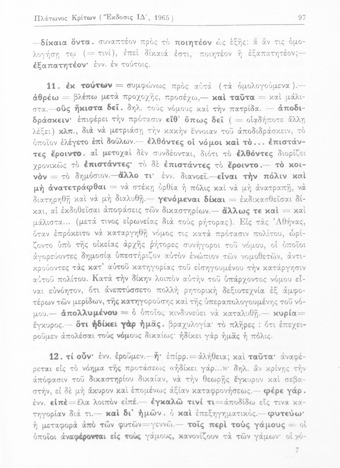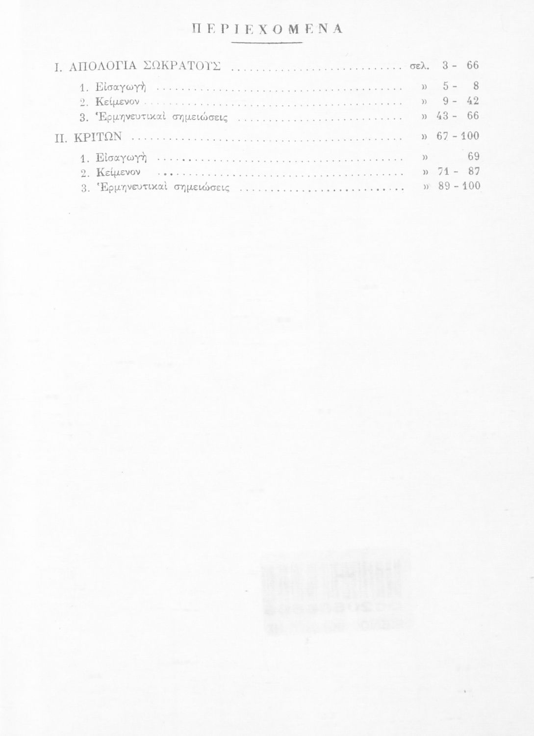 Σχολικό εγχειρίδιο Αρχαίων Ελληνικών από το κείμενο του Πλάτωνα. Περιέχονται ερμηνευτικά σχόλια του συγγραφέα στη καθαρεύουσα. Απεικονίζεται το σύμβολο της Επταετίας.
