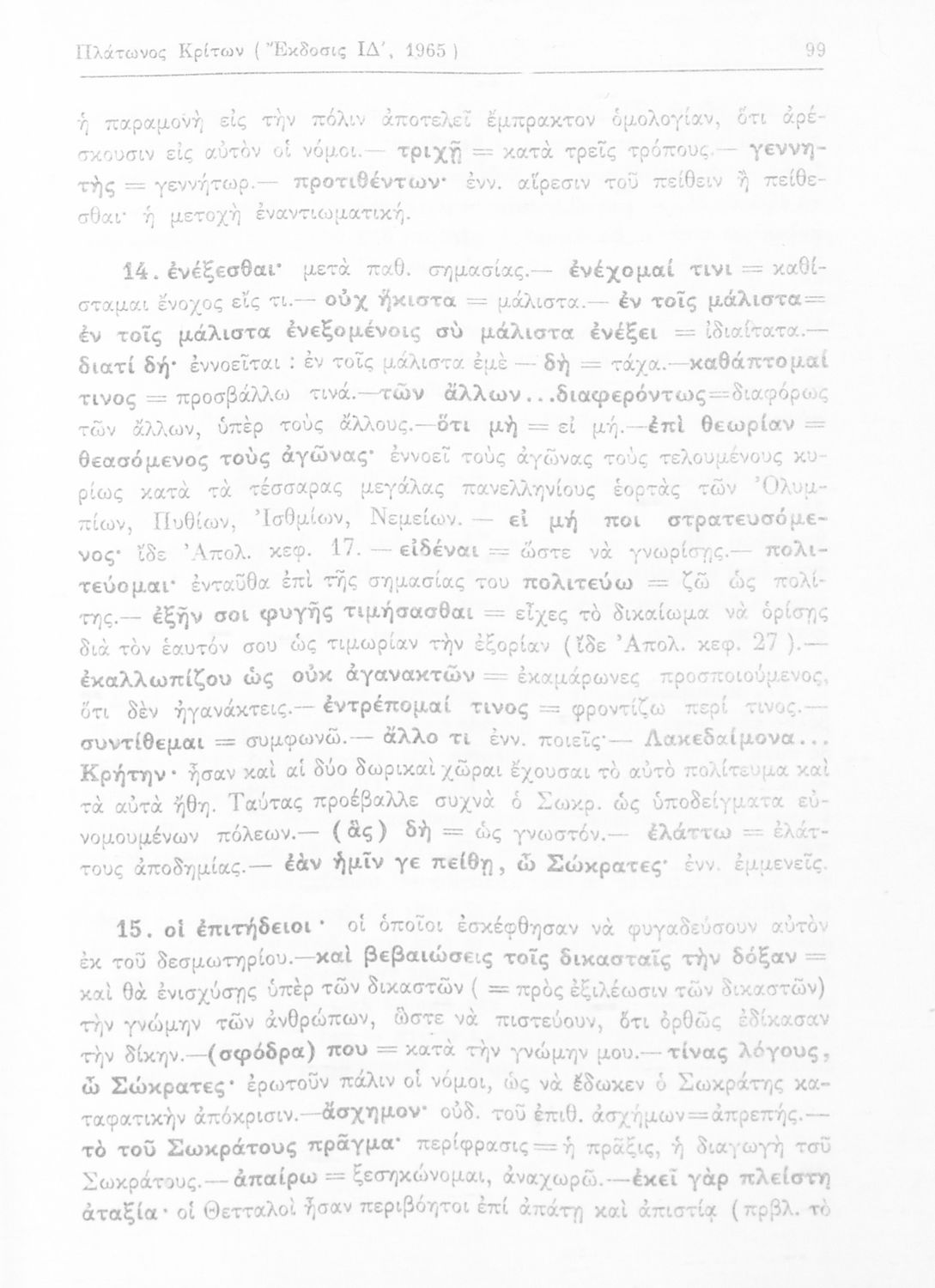Σχολικό εγχειρίδιο Αρχαίων Ελληνικών Γυμνασίου που περιέχει τα έργα του Πλάτωνα Απολογία Σωκράτους και Κρίτων, ερμηνευτικά και πραγματολογικά σχόλια και λεξιλογικές παρατηρήσεις.
