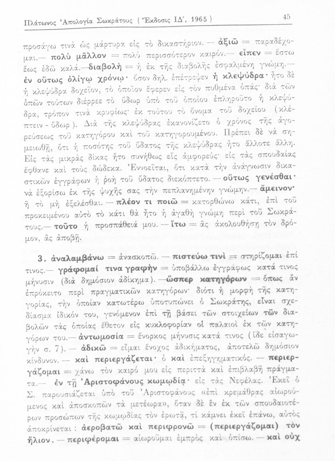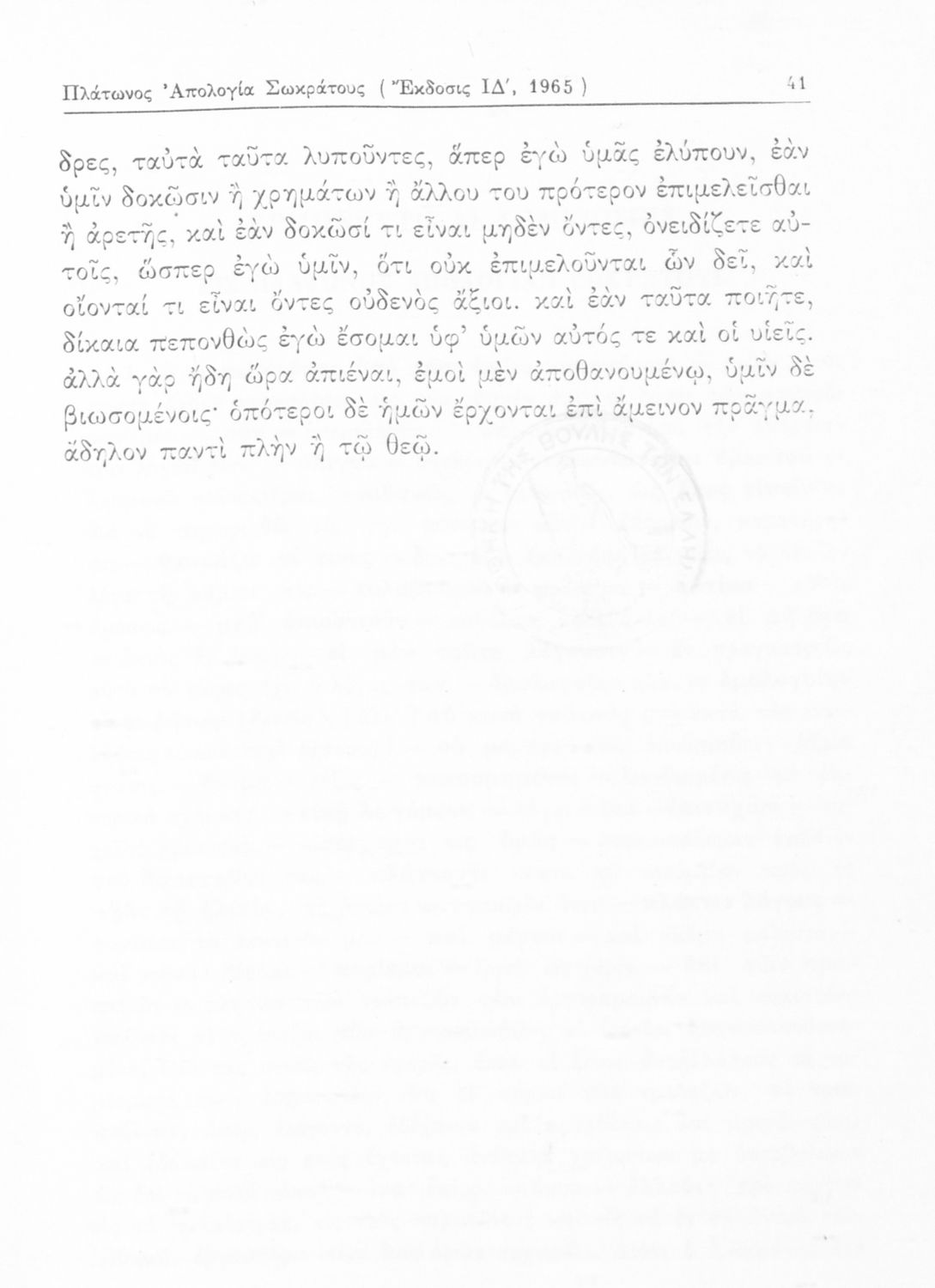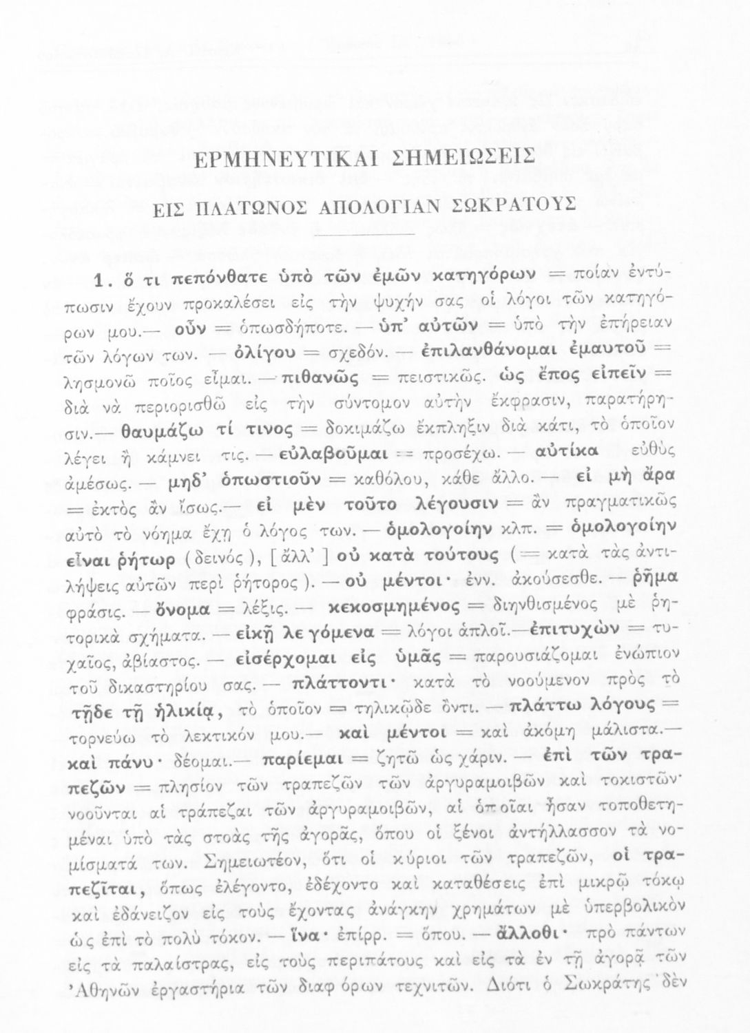 520 ## _aΣχολικό εγχειρίδιο για το μάθημα των Αρχαίων Ελληνικών και συγκεκριμένα επιλεγόμενα αποσπάσματα από την Απολογία Σωκράτους και τον διάλογο Κρίτων του Πλάτωνα. Το εγχειρίδιο χωρίζεται σε δύο μέρη. Το πρώτο μέρος περιλαμβάνει την Απολογία Σωκράτους, εισαγωγικός βίος Πλάτωνα και υπόθεση έργου, το αρχαίο κείμενο, ερμηνευτικά και πραγματολογικά σχόλια και στο δεύτερο μέρος εισαγωγικά στοιχεία για τον διάλογο μεταξύ Σωκράτη και Κρίτωνα, το αρχαίο κείμενο, ερμηνευτικές και πραγματολογικές σημειώσεις