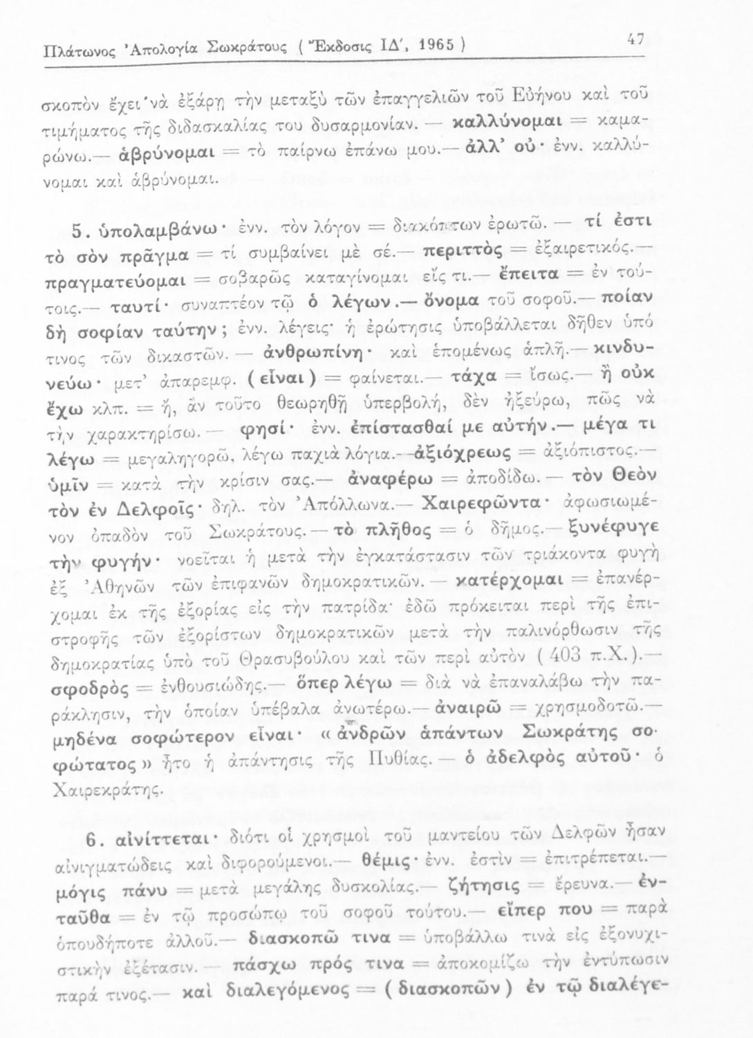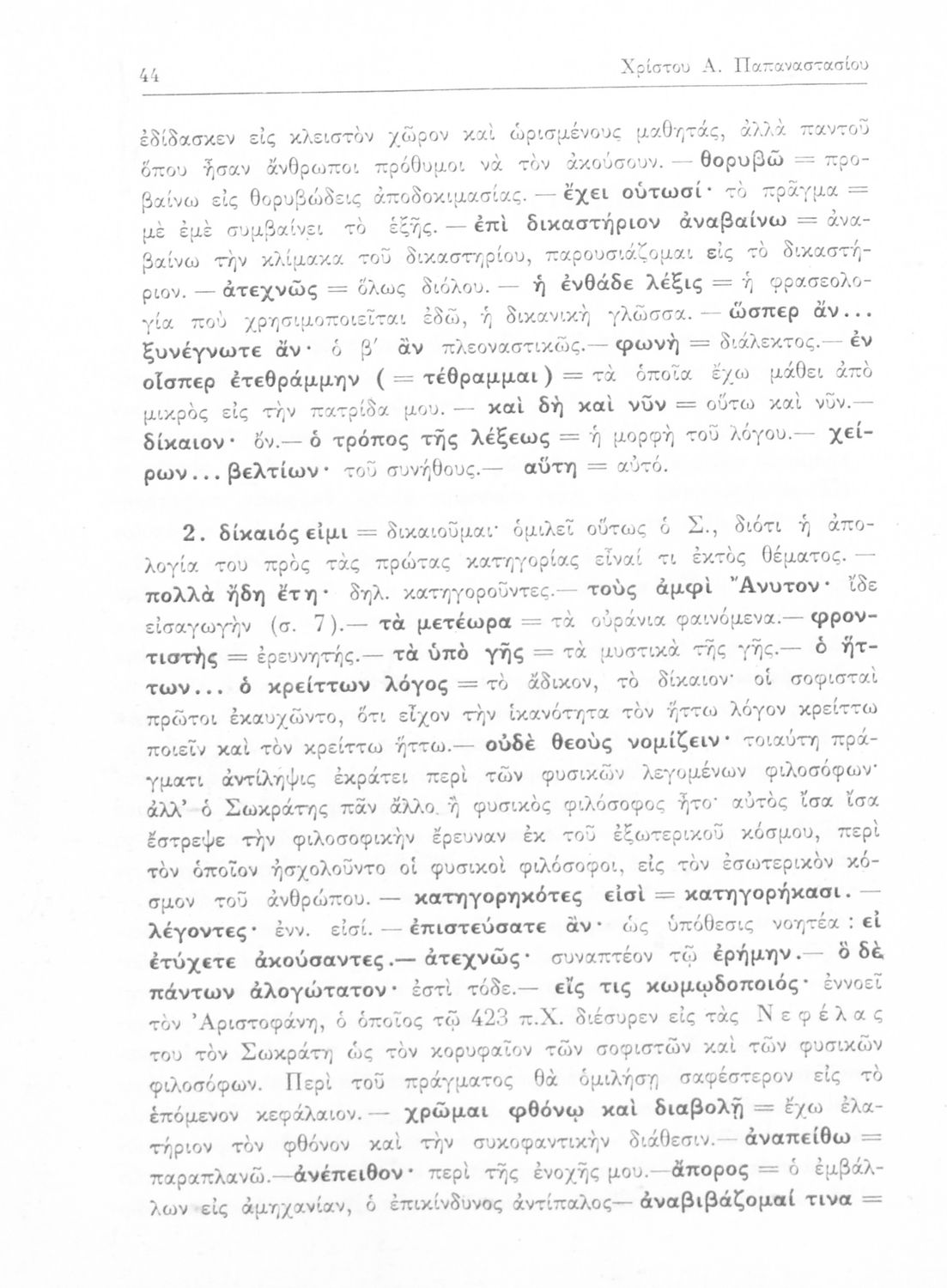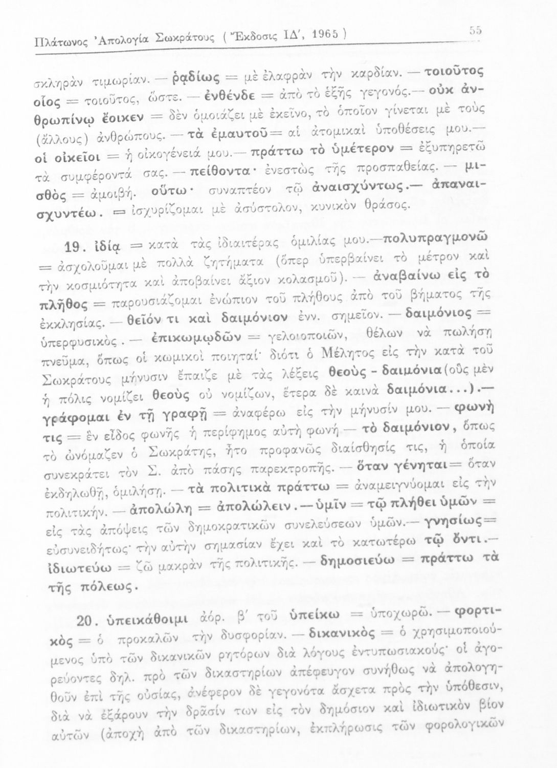 520 ## _aΣχολικό εγχειρίδιο για το μάθημα των Αρχαίων Ελληνικών και συγκεκριμένα επιλεγόμενα αποσπάσματα από την Απολογία Σωκράτους και τον διάλογο Κρίτων του Πλάτωνα. Το εγχειρίδιο χωρίζεται σε δύο μέρη. Το πρώτο μέρος περιλαμβάνει την Απολογία Σωκράτους, εισαγωγικός βίος Πλάτωνα και υπόθεση έργου, το αρχαίο κείμενο, ερμηνευτικά και πραγματολογικά σχόλια και στο δεύτερο μέρος εισαγωγικά στοιχεία για τον διάλογο μεταξύ Σωκράτη και Κρίτωνα, το αρχαίο κείμενο, ερμηνευτικές και πραγματολογικές σημειώσεις