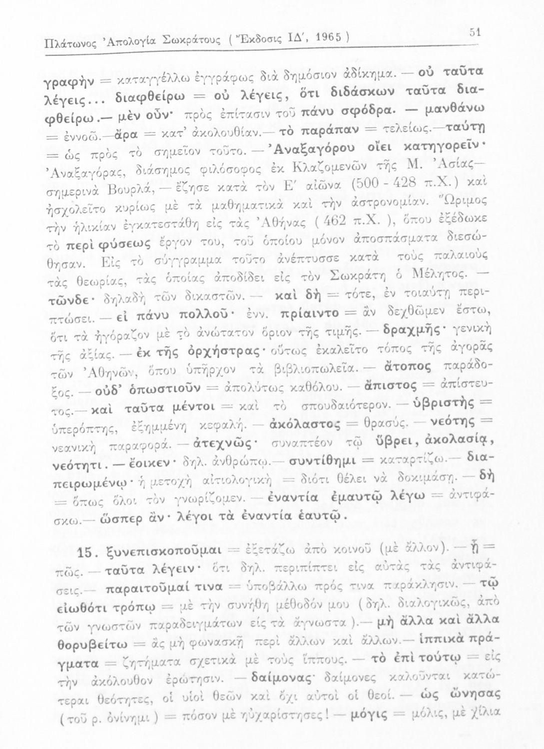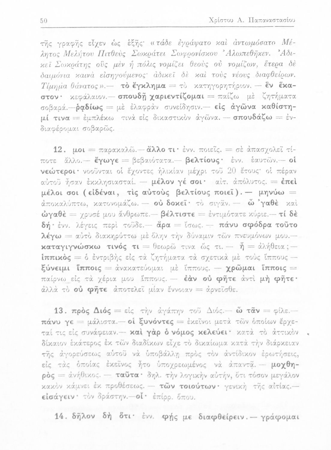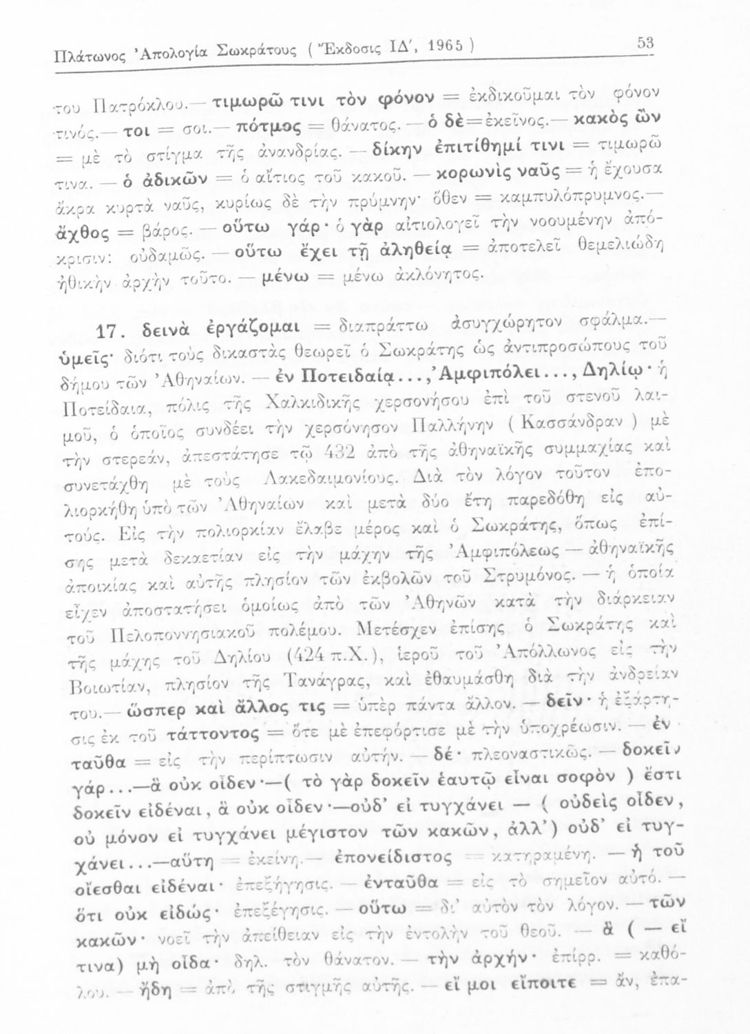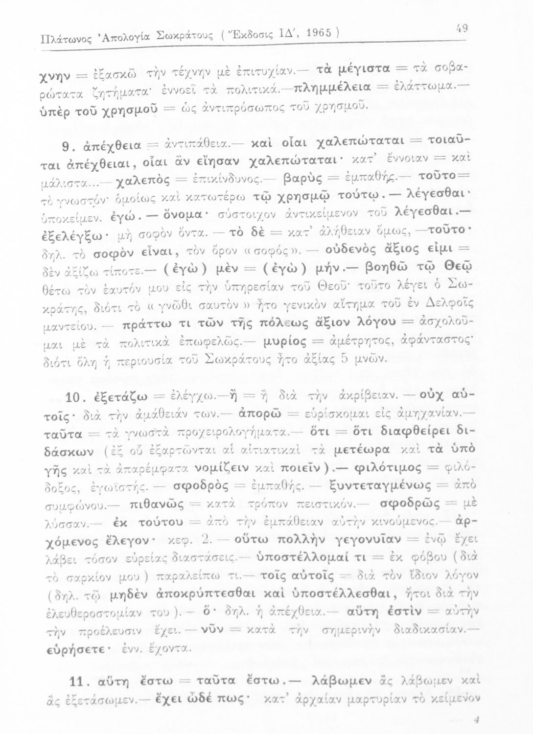 Σχολικό εγχειρίδιο για το μάθημα των Αρχαίων Ελληνικών και συγκεκριμένα επιλεγόμενα αποσπάσματα από την Απολογία Σωκράτους και τον διάλογο Κρίτων του Πλάτωνα. Το εγχειρίδιο χωρίζεται σε δύο μέρη. Το πρώτο μέρος περιλαμβάνει την Απολογία Σωκράτους, εισαγωγικός βίος Πλάτωνα και υπόθεση έργου, το αρχαίο κείμενο, ερμηνευτικά και πραγματολογικά σχόλια και στο δεύτερο μέρος εισαγωγικά στοιχεία για τον διάλογο μεταξύ Σωκράτη και Κρίτωνα, το αρχαίο κείμενο, ερμηνευτικές και πραγματολογικές σημειώσεις