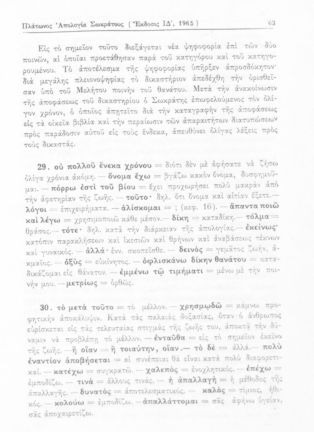 520 ## _aΣχολικό εγχειρίδιο για το μάθημα των Αρχαίων Ελληνικών και συγκεκριμένα επιλεγόμενα αποσπάσματα από την Απολογία Σωκράτους και τον διάλογο Κρίτων του Πλάτωνα. Το εγχειρίδιο χωρίζεται σε δύο μέρη. Το πρώτο μέρος περιλαμβάνει την Απολογία Σωκράτους, εισαγωγικός βίος Πλάτωνα και υπόθεση έργου, το αρχαίο κείμενο, ερμηνευτικά και πραγματολογικά σχόλια και στο δεύτερο μέρος εισαγωγικά στοιχεία για τον διάλογο μεταξύ Σωκράτη και Κρίτωνα, το αρχαίο κείμενο, ερμηνευτικές και πραγματολογικές σημειώσεις