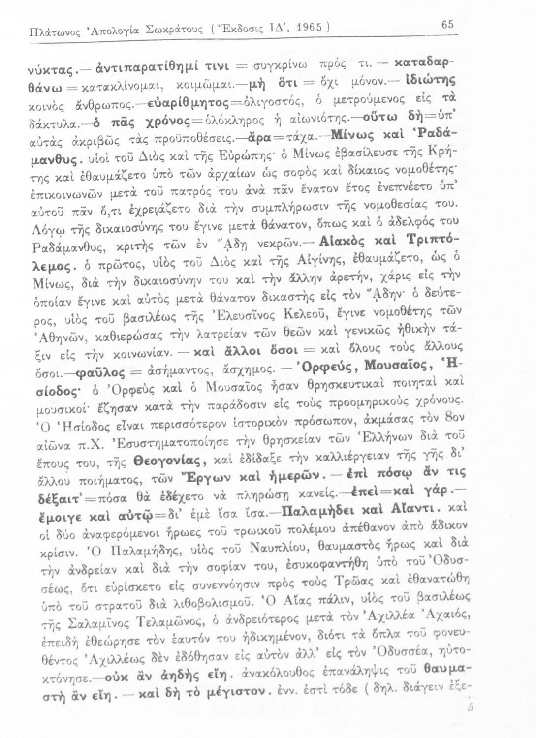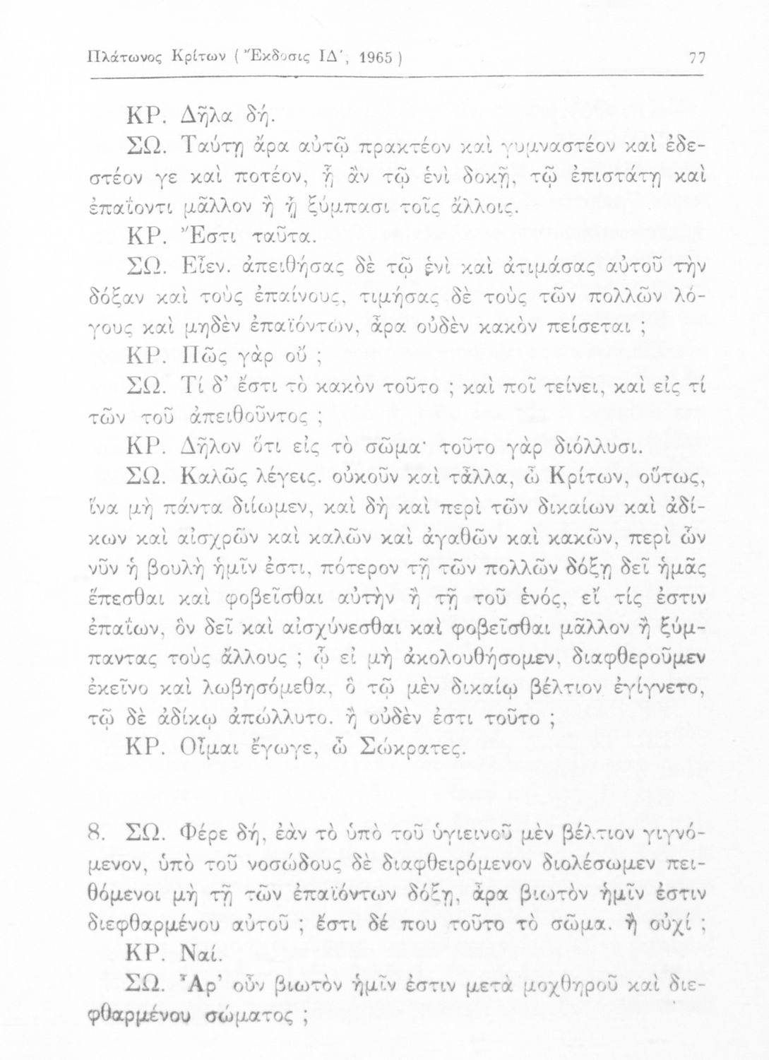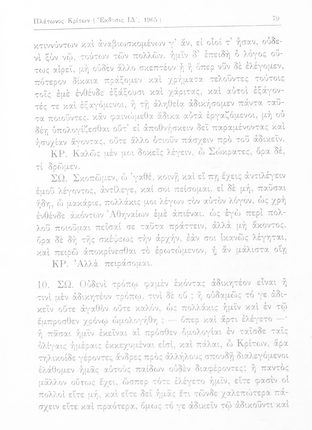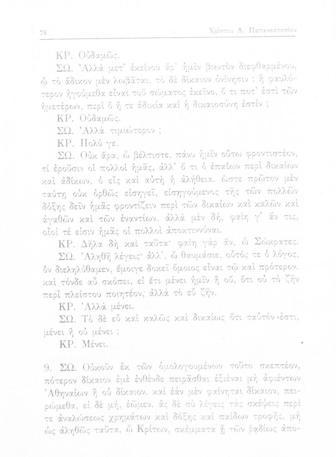 Σχολικό εγχειρίδιο για το μάθημα των Αρχαίων Ελληνικών και συγκεκριμένα επιλεγόμενα αποσπάσματα από την Απολογία Σωκράτους και τον διάλογο Κρίτων του Πλάτωνα. Το εγχειρίδιο χωρίζεται σε δύο μέρη. Το πρώτο μέρος περιλαμβάνει την Απολογία Σωκράτους, εισαγωγικός βίος Πλάτωνα και υπόθεση έργου, το αρχαίο κείμενο, ερμηνευτικά και πραγματολογικά σχόλια και στο δεύτερο μέρος εισαγωγικά στοιχεία για τον διάλογο μεταξύ Σωκράτη και Κρίτωνα, το αρχαίο κείμενο, ερμηνευτικές και πραγματολογικές σημειώσεις