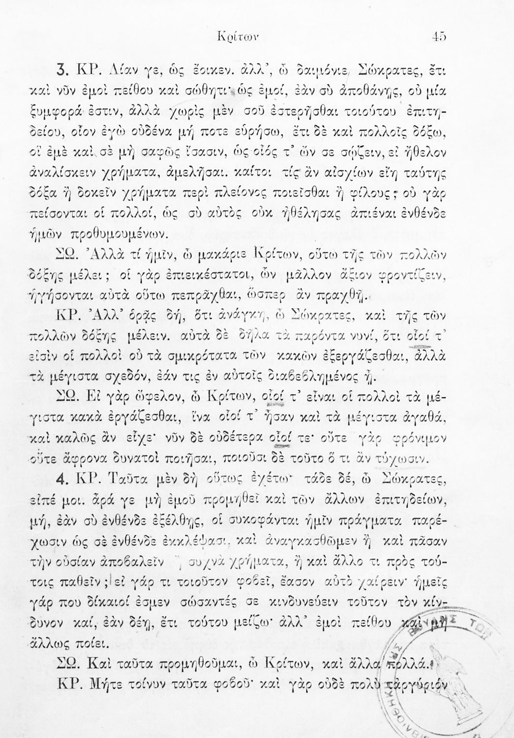 Τίτλος: Πλάτωνος Απολογία Σωκράτους και Κρίτων δια την Ε ́ τάξιν των Γυμνασίων παλαιού τύπου και την ΣΤ ́ τάξιν των Γυμνασίων νέου τύπου
