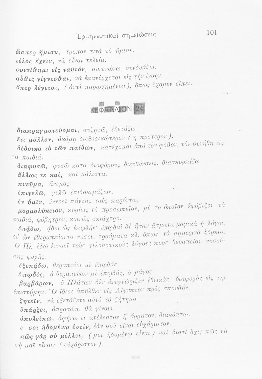 Σχολικό εγχειρίδιο Αρχαίων Ελληνικών για τη ΣΤ΄ τάξη των Εξαταξίων Γυμνασίων που περιλαμβάνει σύντομο βιογραφικό του Πλάτωνα, εισαγωγή στην προσωκρατική φιλοσοφία και στην φιλοσοφία του Πλάτωνα, αποσπάσματα ...