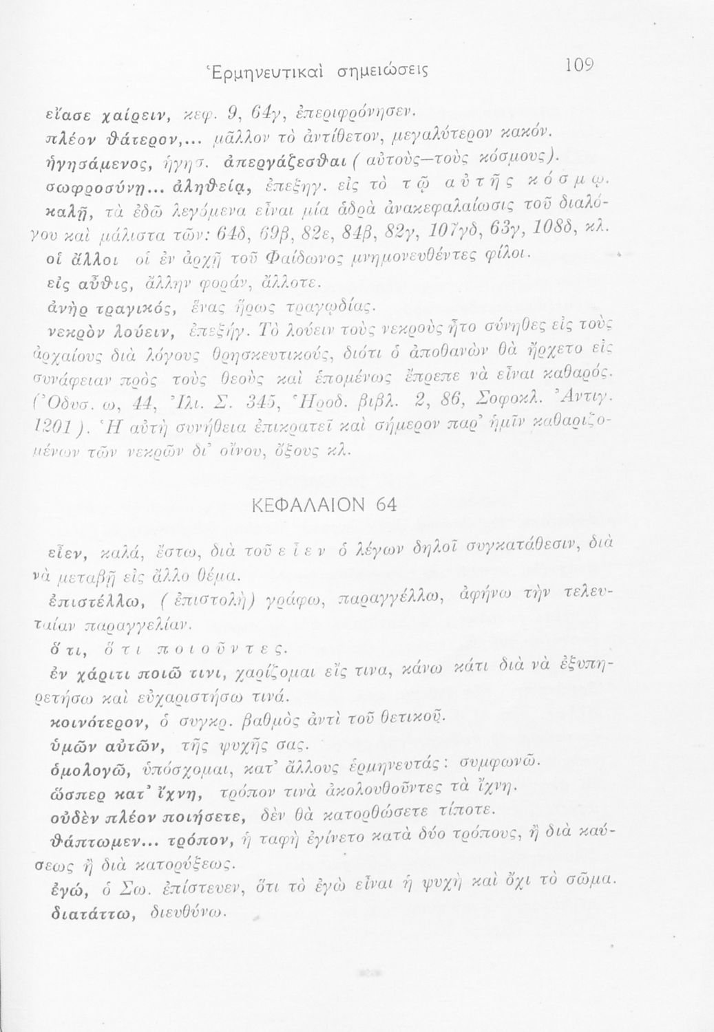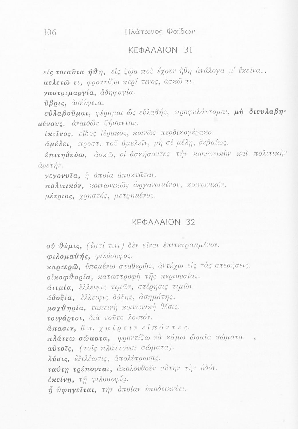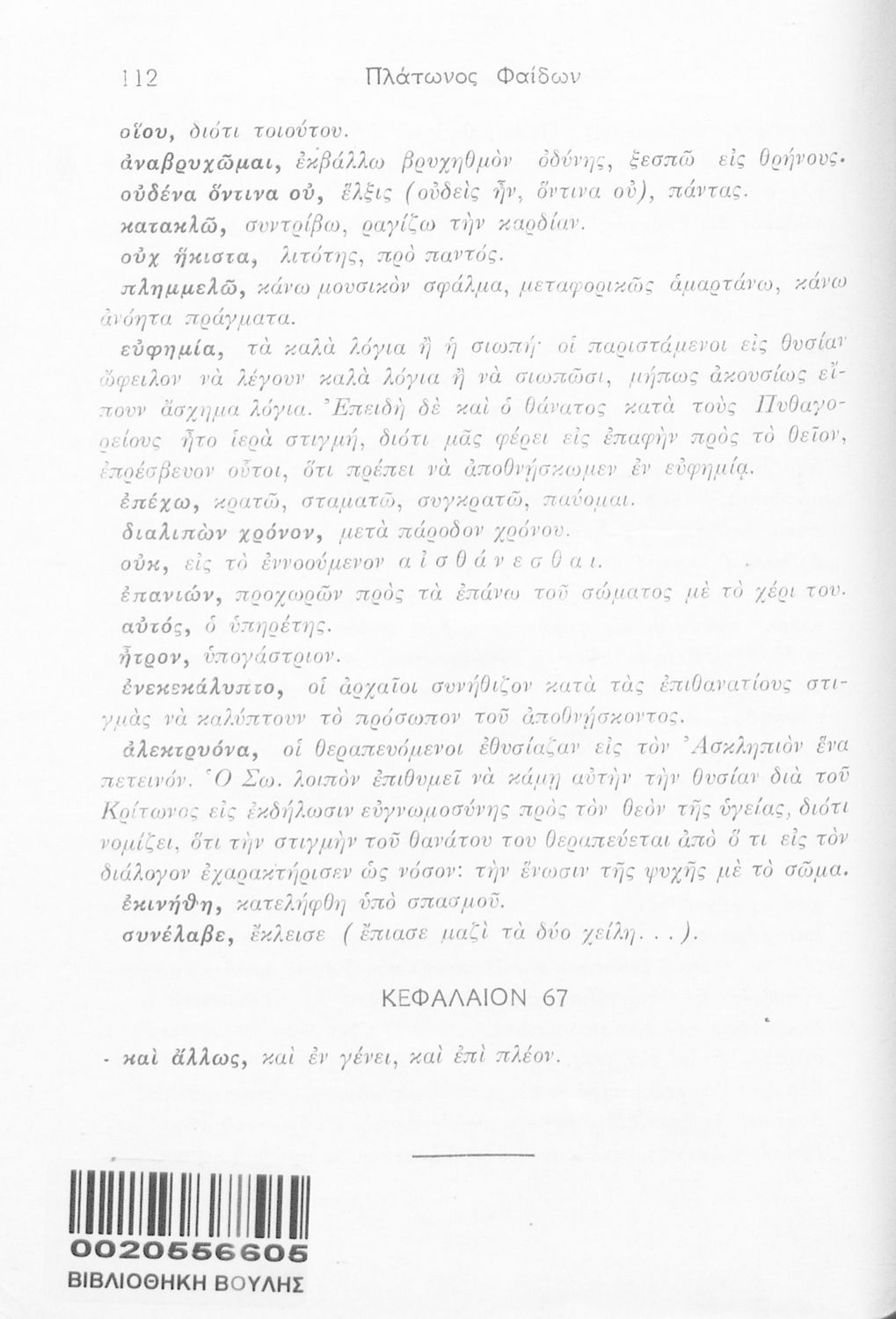 Σχολικό εγχειρίδιο Αρχαίων Ελληνικών. Το βιβλίο περιλαμβάνει εισαγωγή σχετικά με τη ζωή και το έργο του Πλάτωνα και αναφέρεται σε φιλοσόφους της εποχής. Παραθέτεται το κείμενο "Φαίδων : Η περί ψυχής ηθικός" το
