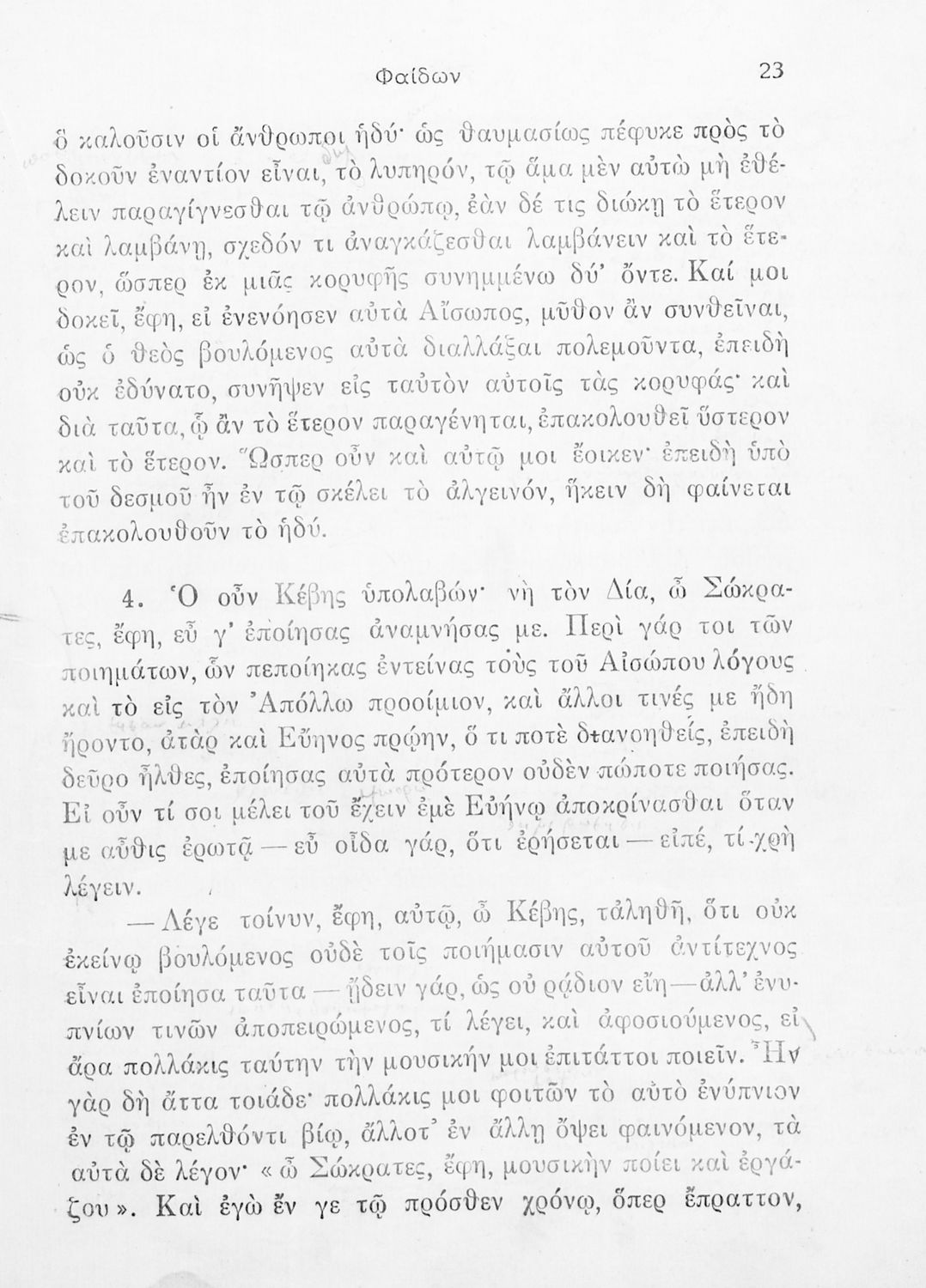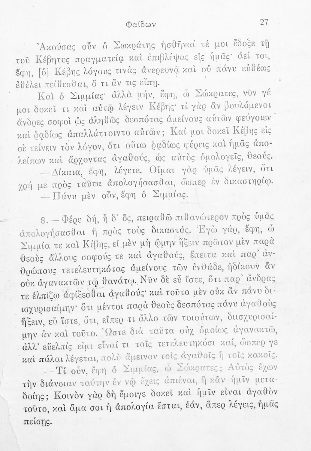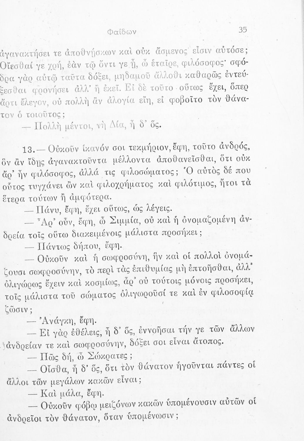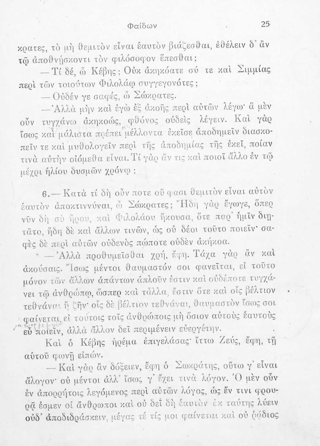 Σχολικό εγχειρίδιο της ΣΤ΄ Γυμνασίου για το μάθημα των Αρχαίων Ελληνικών. Περιέχει το πρωτότυπο κείμενο από το έργο του Πλάτωνα Φαίδων. Τα κείμενα συνοδεύονται από ερμηνευτικές και λεξιλογικές παρατηρήσεις του συγγραφέα.