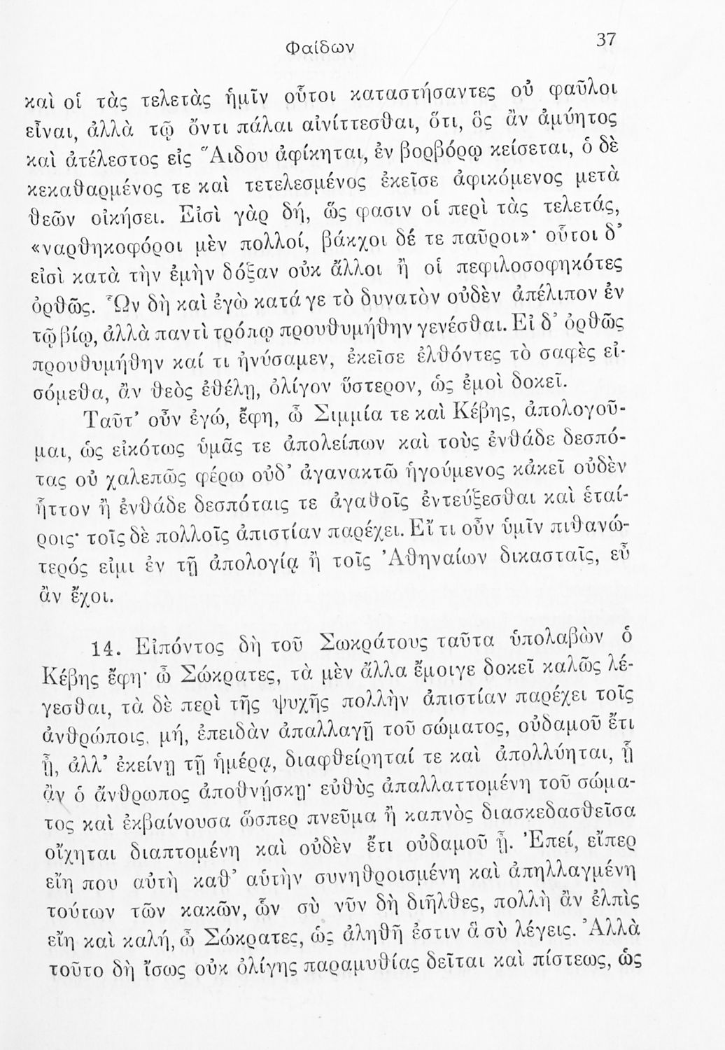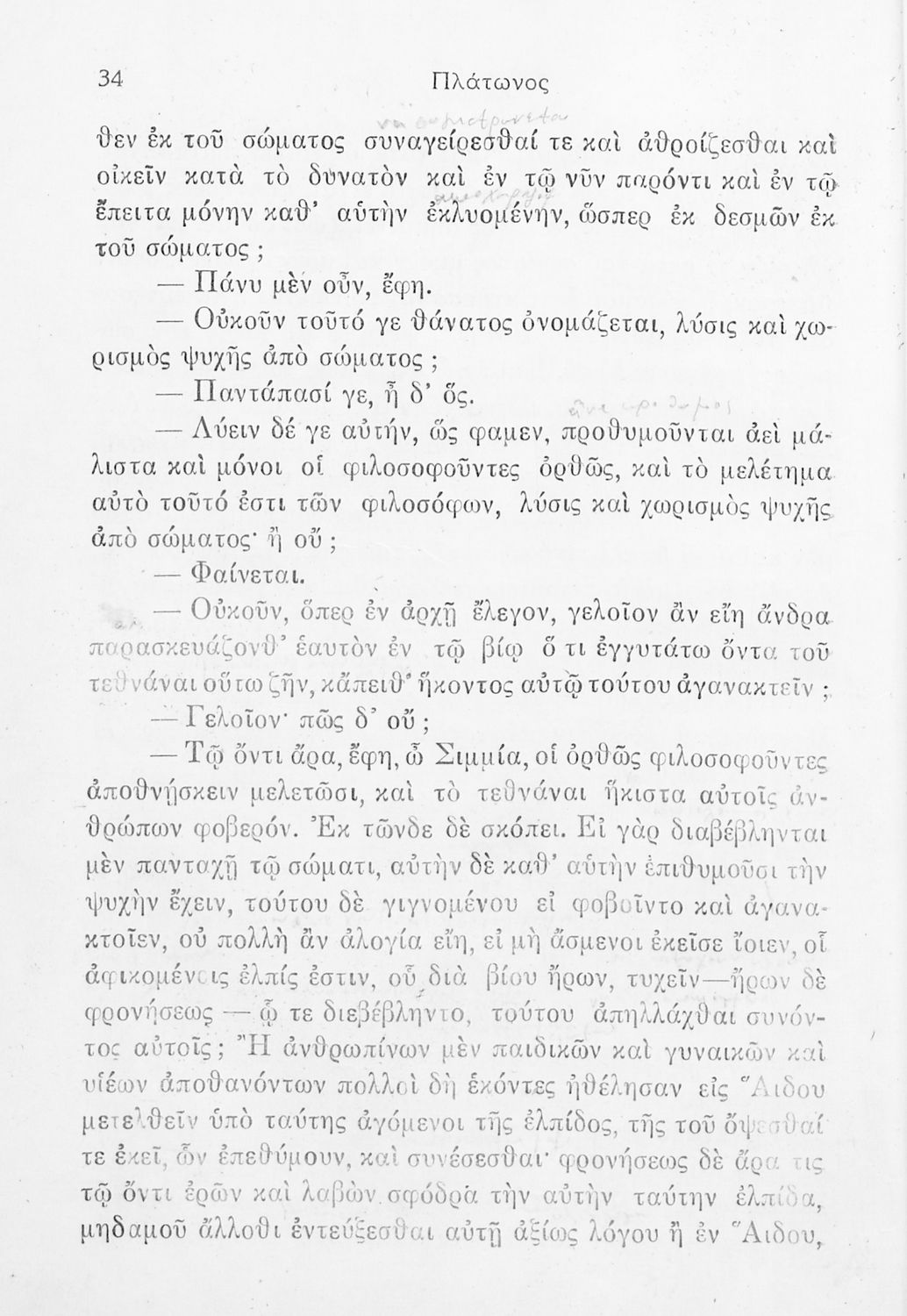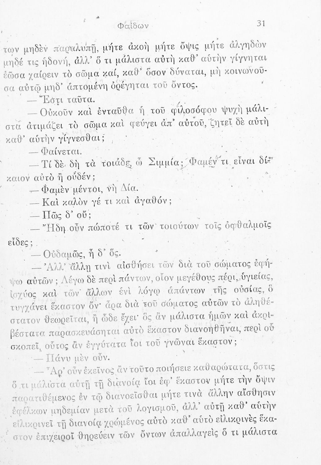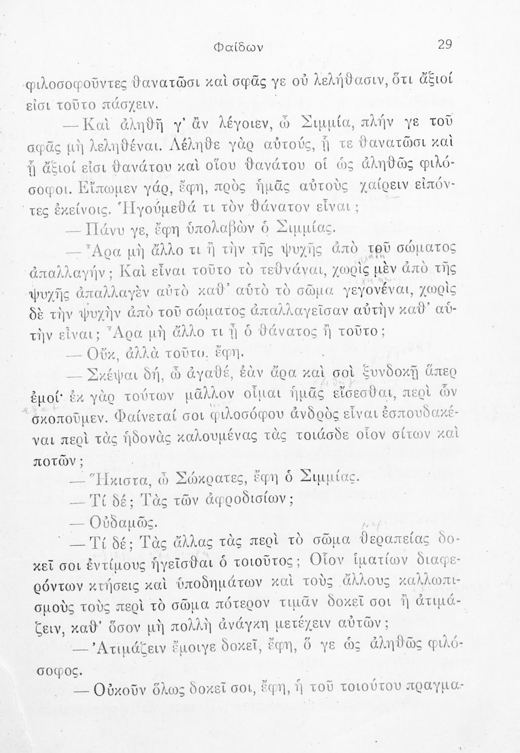 Σχολικό εγχειρίδιο Αρχαίων Ελληνικών. Το βιβλίο περιλαμβάνει εισαγωγή σχετικά με τη ζωή και το έργο του Πλάτωνα και αναφέρεται σε φιλοσόφους της εποχής. Παραθέτεται το κείμενο "Φαίδων : Η περί ψυχής ηθικός" το