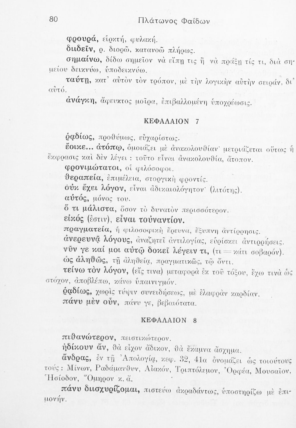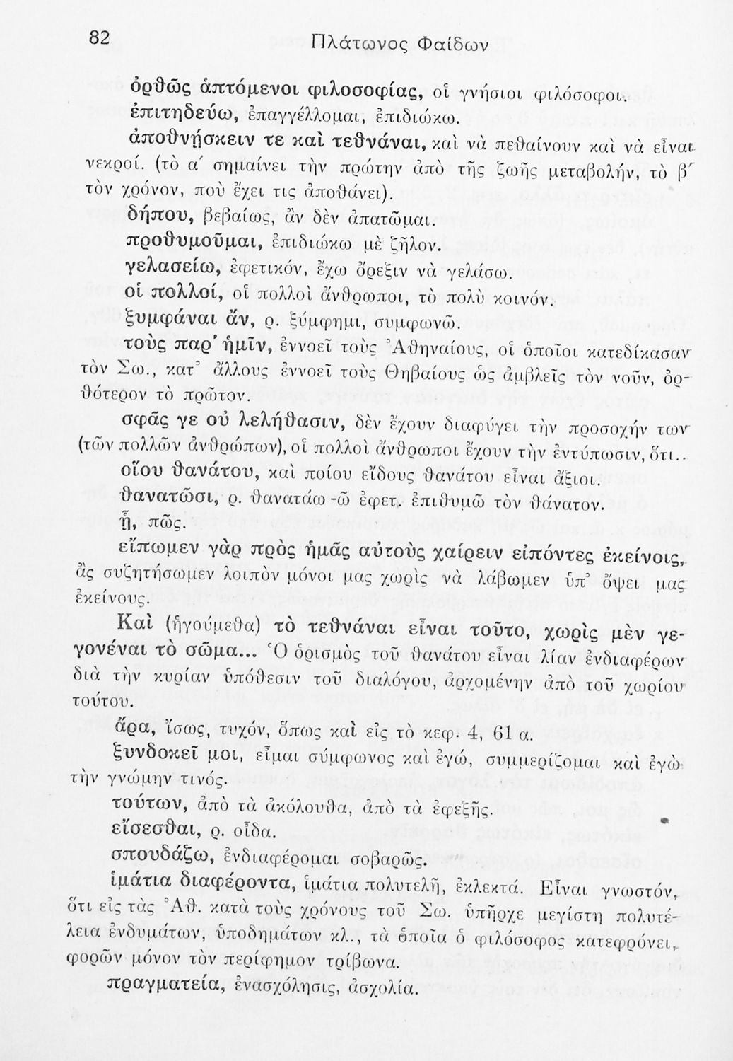 Σχολικό εγχειρίδιο της ΣΤ΄ Γυμνασίου για το μάθημα των Αρχαίων Ελληνικών. Περιέχει το πρωτότυπο κείμενο από το έργο του Πλάτωνα Φαίδων. Τα κείμενα συνοδεύονται από ερμηνευτικές και λεξιλογικές παρατηρήσεις του συγγραφέα.
