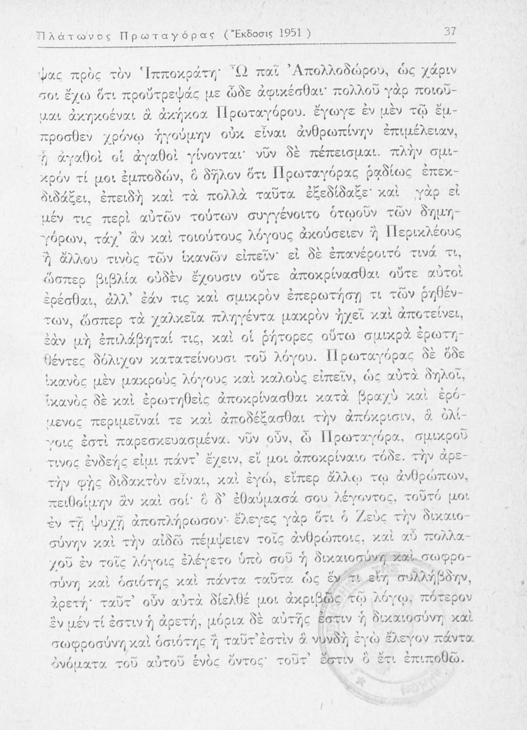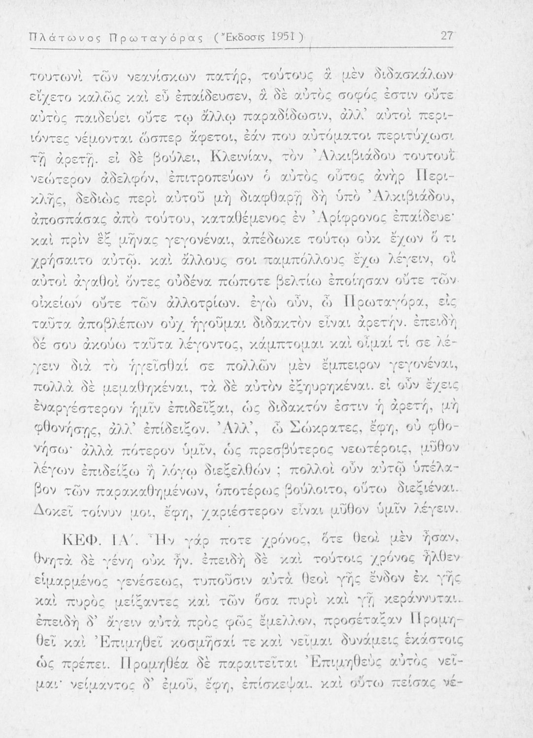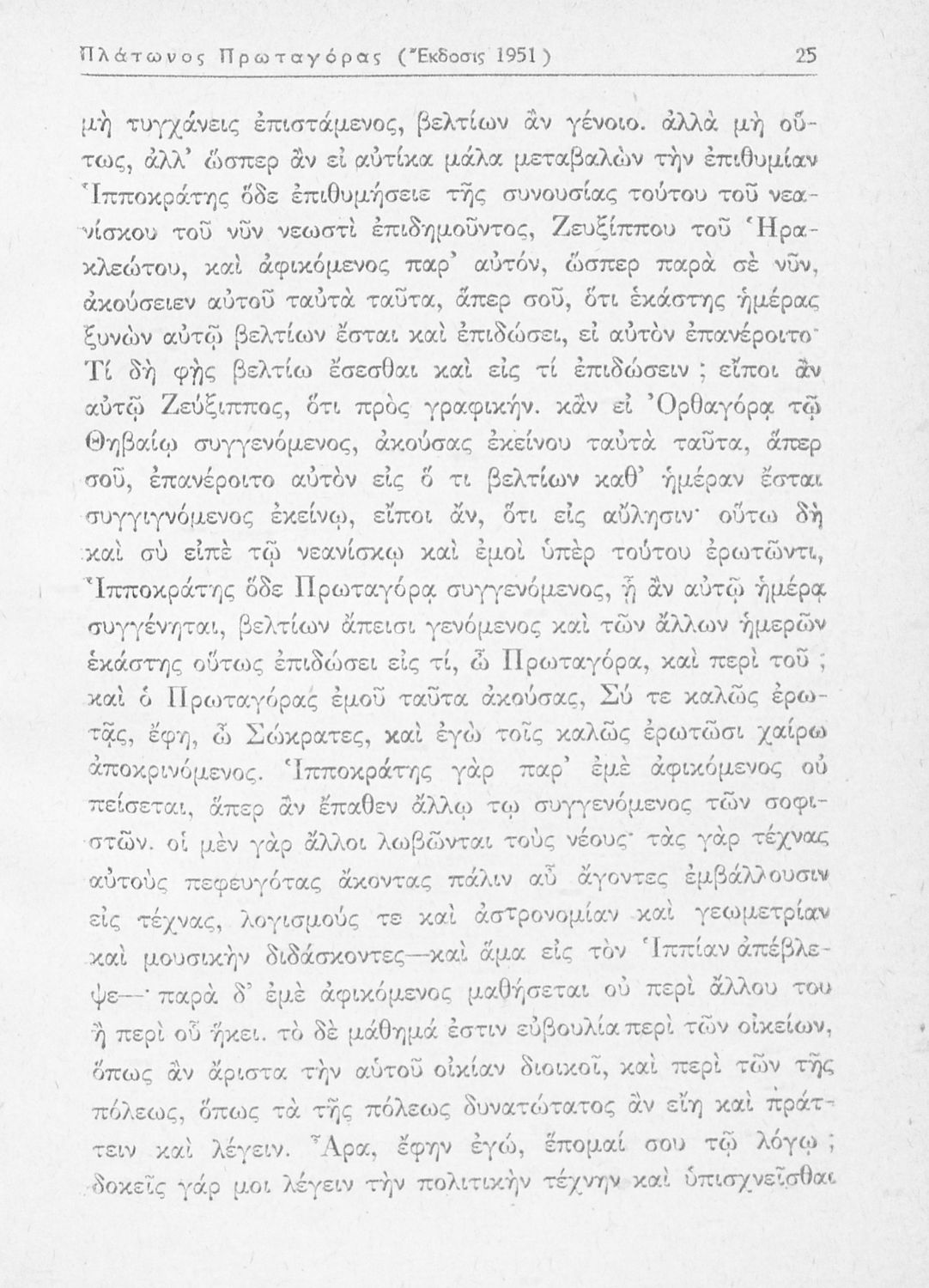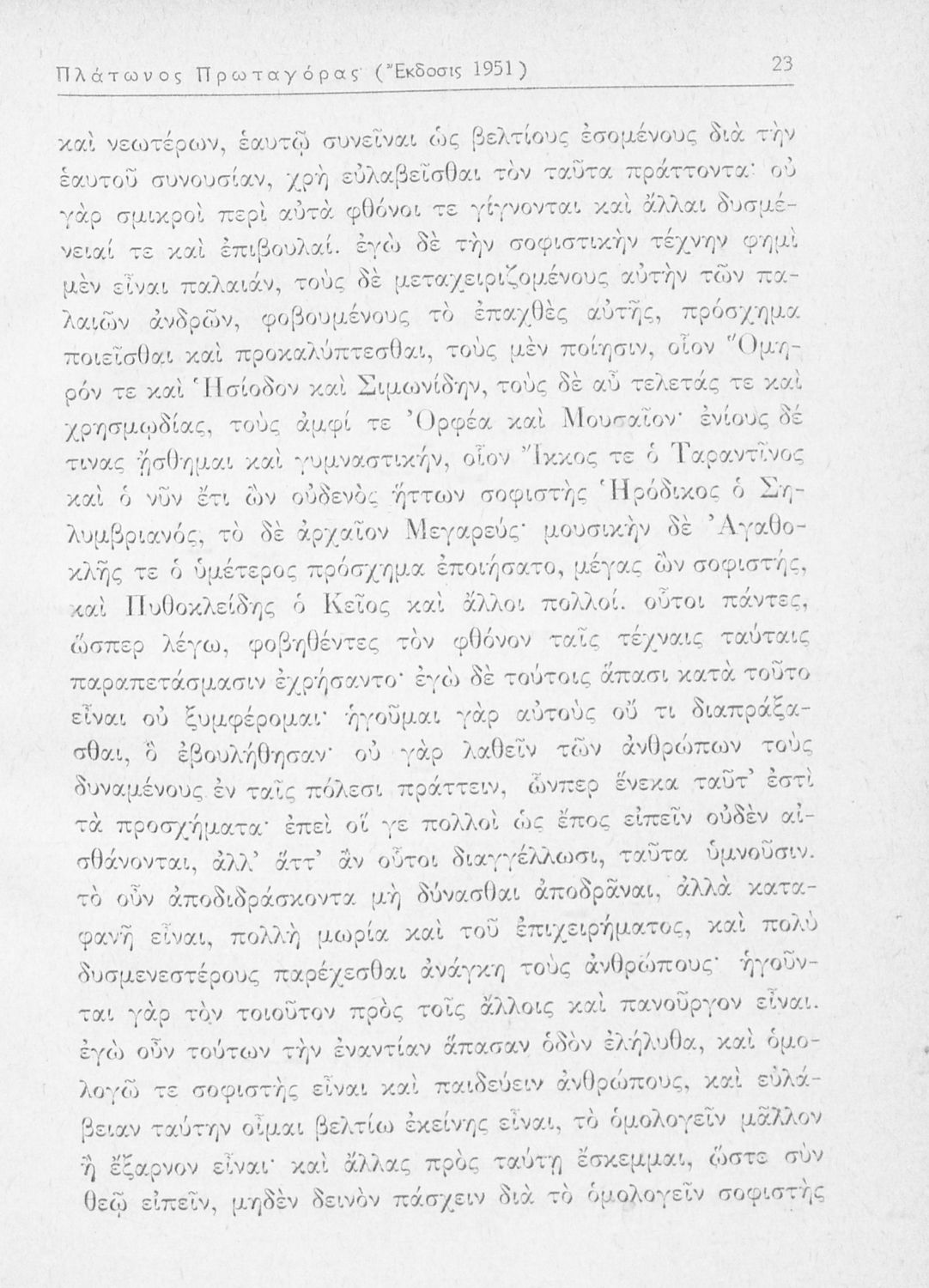 Σχολικό εγχειρίδιο για την ΣΤ΄ Γυμνασίου για το μάθημα των Αρχαίων Ελληνικών και συγκεκριμένα επιλεγόμενα αποσπάσματα από τον Πρωταγόρα του Πλάτωνα. Το εγχειρίδιο περιλαμβάνει εισαγωγικά σκοπός και παιδευτική αξία του διαλόγου, η τέχνη της σοφιστικής και οι σοφιστές, το αρχαίο πρωτότυπο κείμενο του Πρωταγόρα, ερμηνευτικά, πραγματολογικά και λεξιλογικά στοιχεία, παράρτημα με διακοσμητικά στοών και χώρων όπου γινόντουσαν οι φιλοσοφικές συζητήσεις κατά την αρχαιότητα.