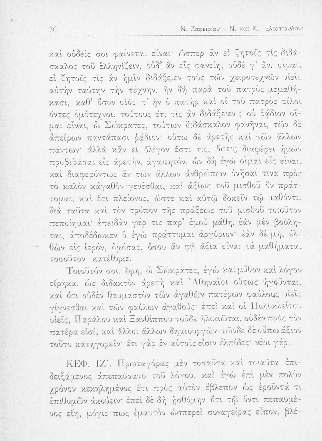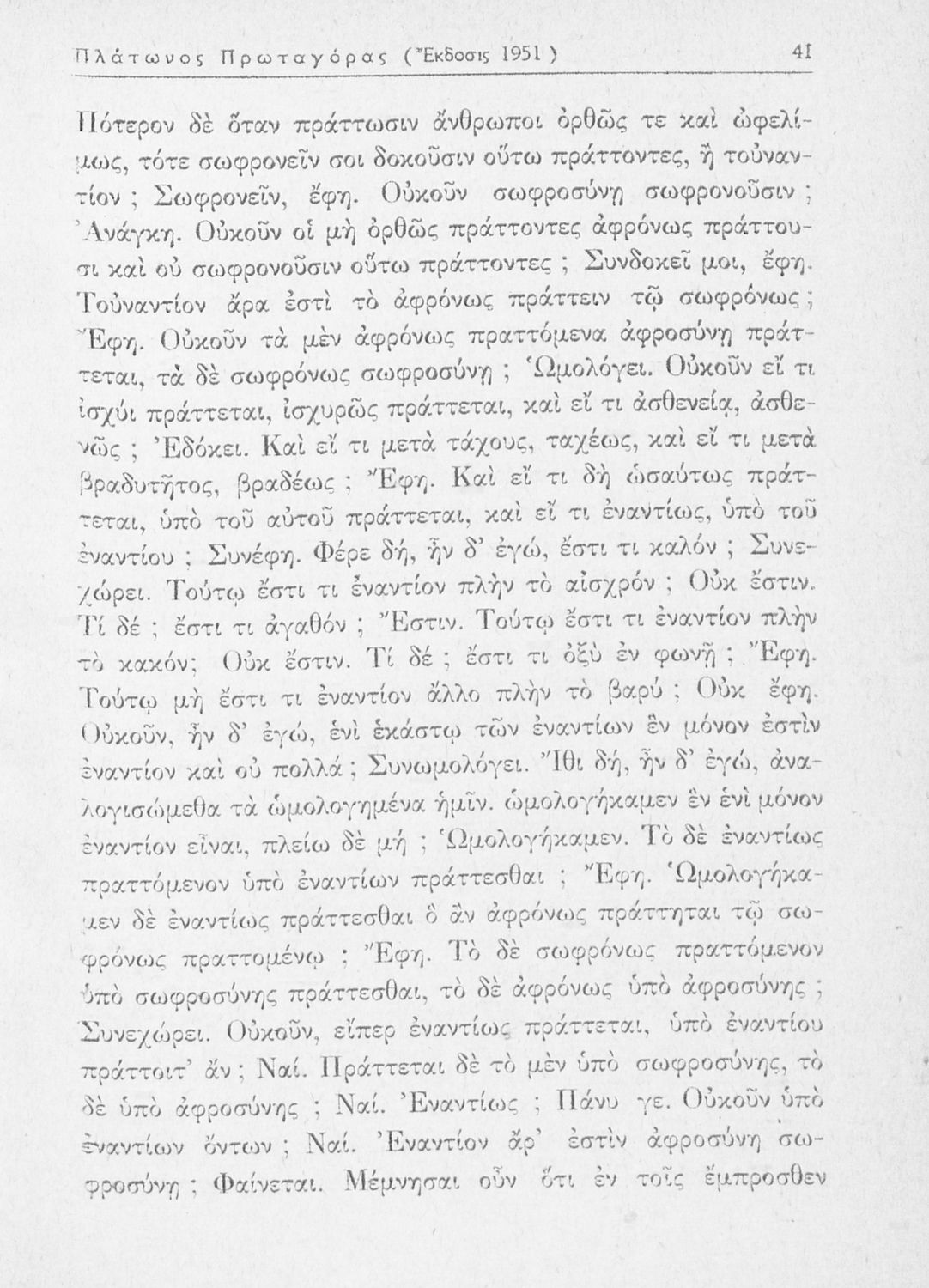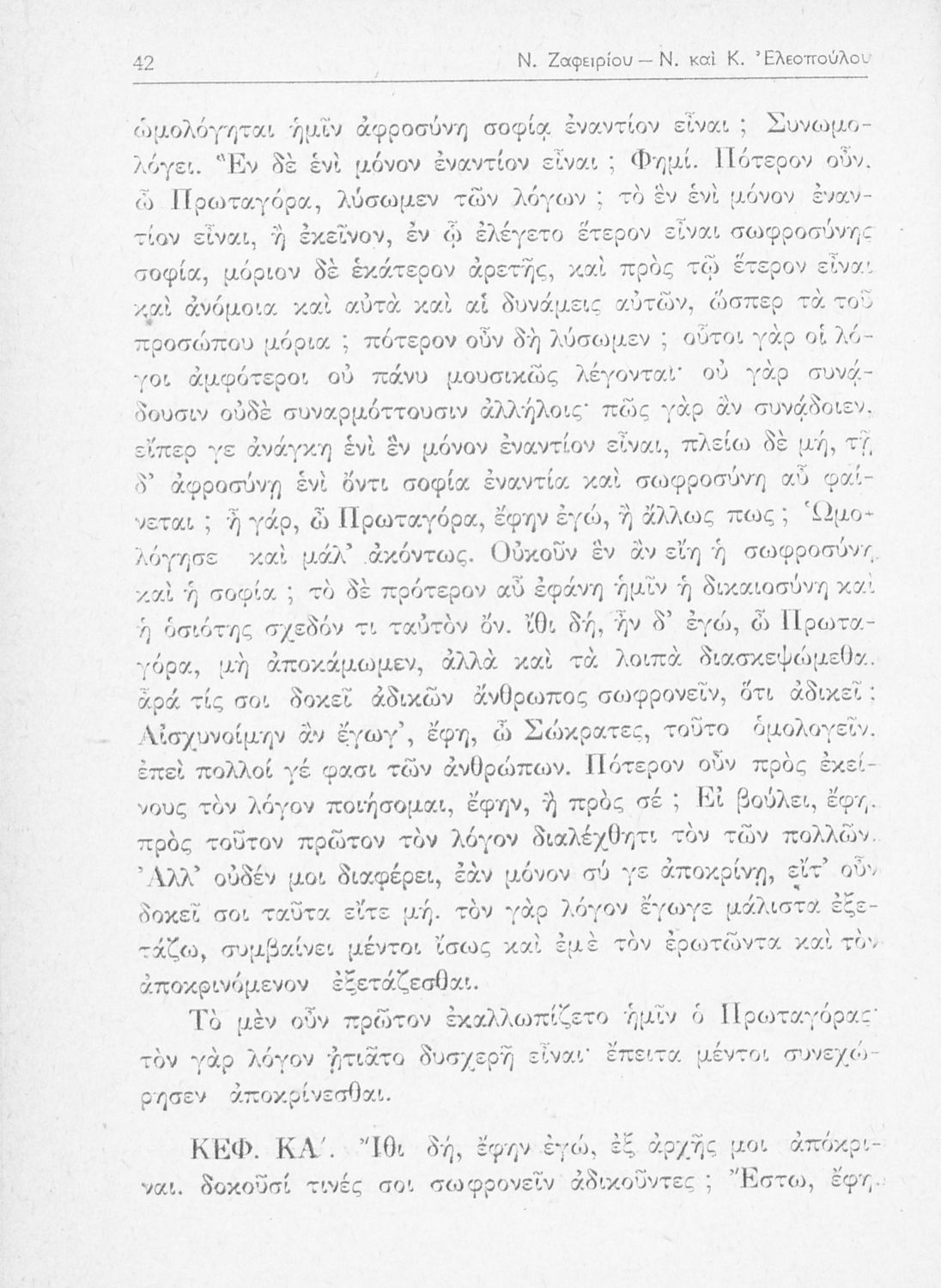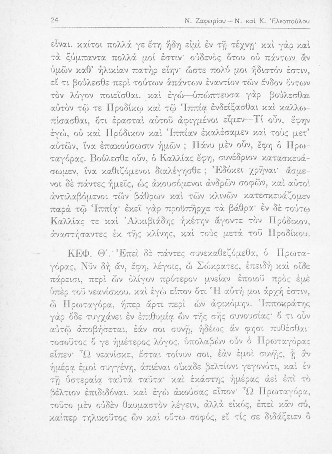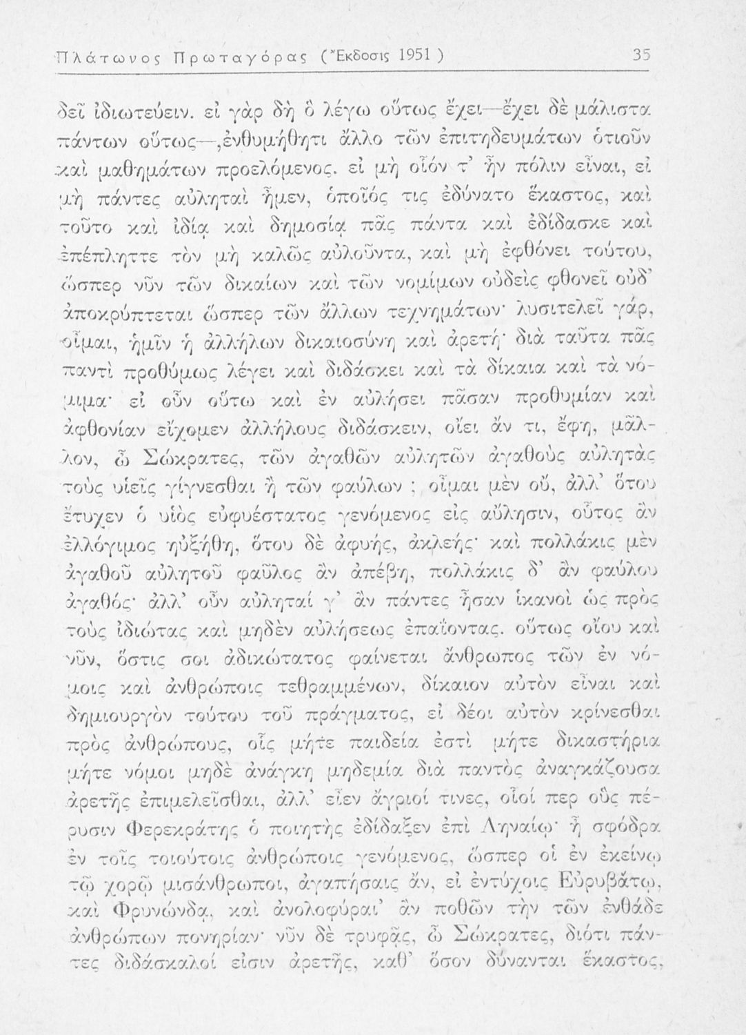 Σχολικό εγχειρίδιο για την ΣΤ΄ Γυμνασίου για το μάθημα των Αρχαίων Ελληνικών και συγκεκριμένα επιλεγόμενα αποσπάσματα από τον Πρωταγόρα του Πλάτωνα. Το εγχειρίδιο περιλαμβάνει εισαγωγικά σκοπός και παιδευτική αξία του διαλόγου, η τέχνη της σοφιστικής και οι σοφιστές, το αρχαίο πρωτότυπο κείμενο του Πρωταγόρα, ερμηνευτικά, πραγματολογικά και λεξιλογικά στοιχεία, παράρτημα με διακοσμητικά στοών και χώρων όπου γινόντουσαν οι φιλοσοφικές συζητήσεις κατά την αρχαιότητα.