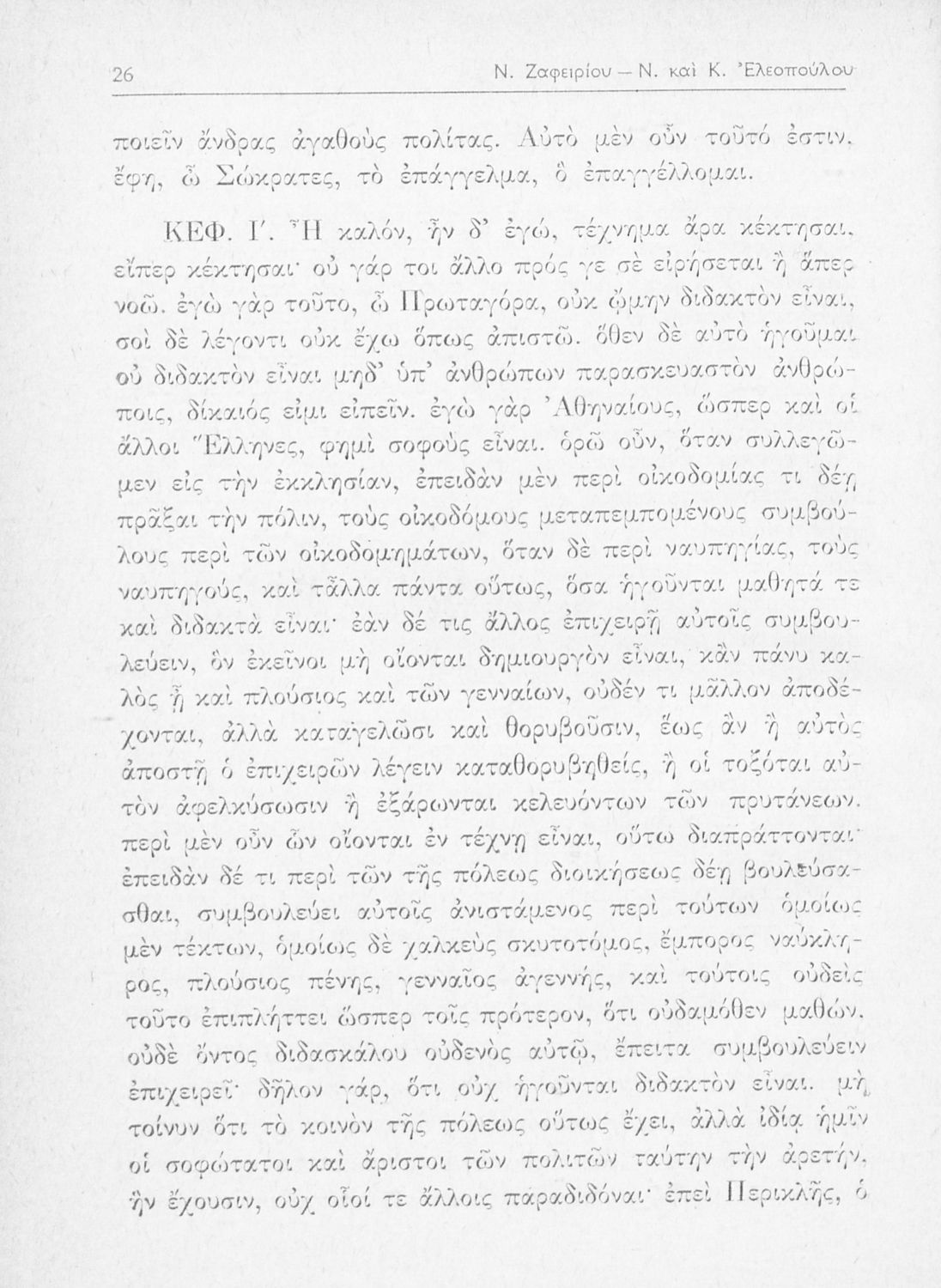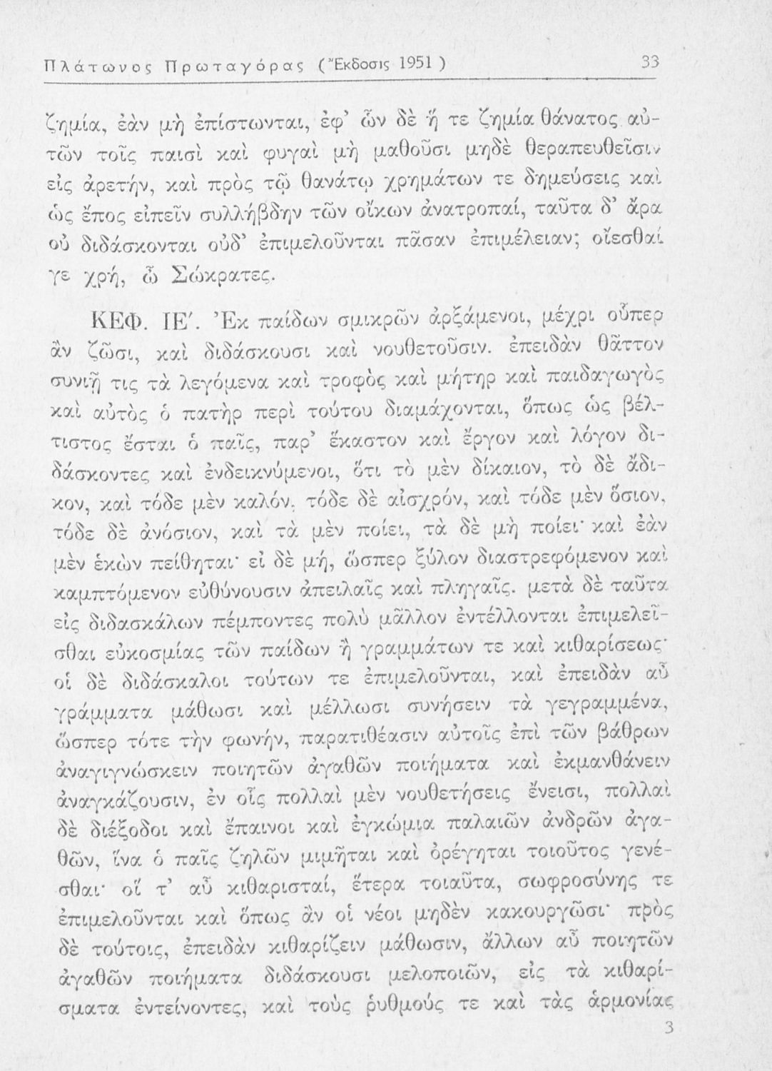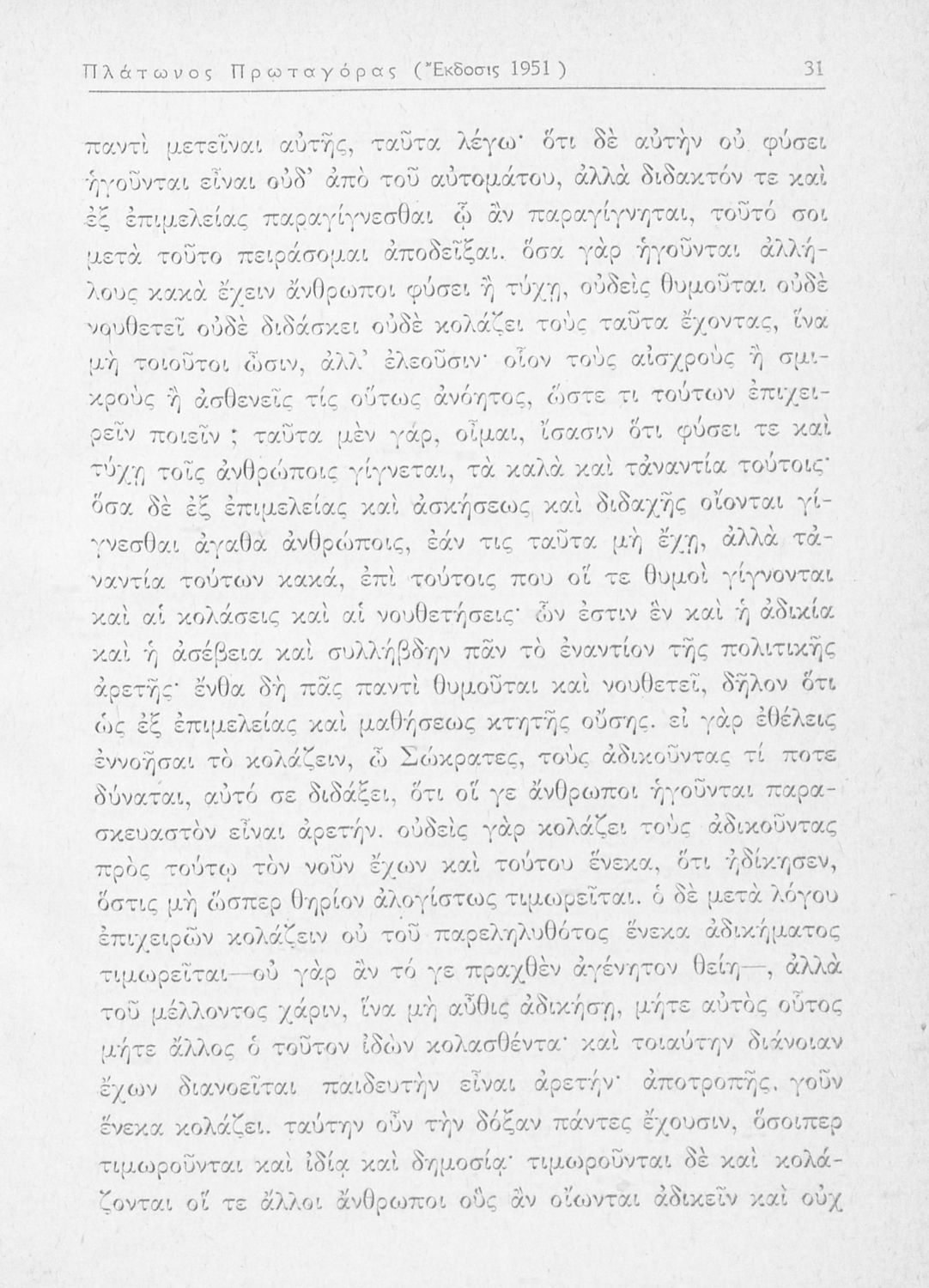 Βαθμίδα εκπαίδευσης: Δευτεροβάθμια Τάξη: ΣΤ' Γυμνασίου Μάθημα: Αρχαία Ελληνικά Γλώσσα: Καθαρεύουσα Παρουσίαση περιεχομένου: Σχολικό εγχειρίδιο για την ΣΤ΄ Γυμνασίου για το μάθημα των Αρχαίων Ελληνικών και συγκεκριμένα επιλεγόμενα αποσπάσματα από τον Πρωταγόρα του Πλάτωνα. Το εγχειρίδιο περιλαμβάνει εισαγωγικά σκοπός και παιδευτική αξία του διαλόγου, η τέχνη της σοφιστικής και οι σοφιστές, το αρχαίο πρωτότυπο κείμενο του Πρωταγόρα, ερμηνευτικά, πραγματολογικά και λεξιλογικά στοιχεία, παράρτημα με διακοσμητικά στοών και χώρων όπου γινόντουσαν οι φιλοσοφικές συζητήσεις κατά την αρχαιότητα. |