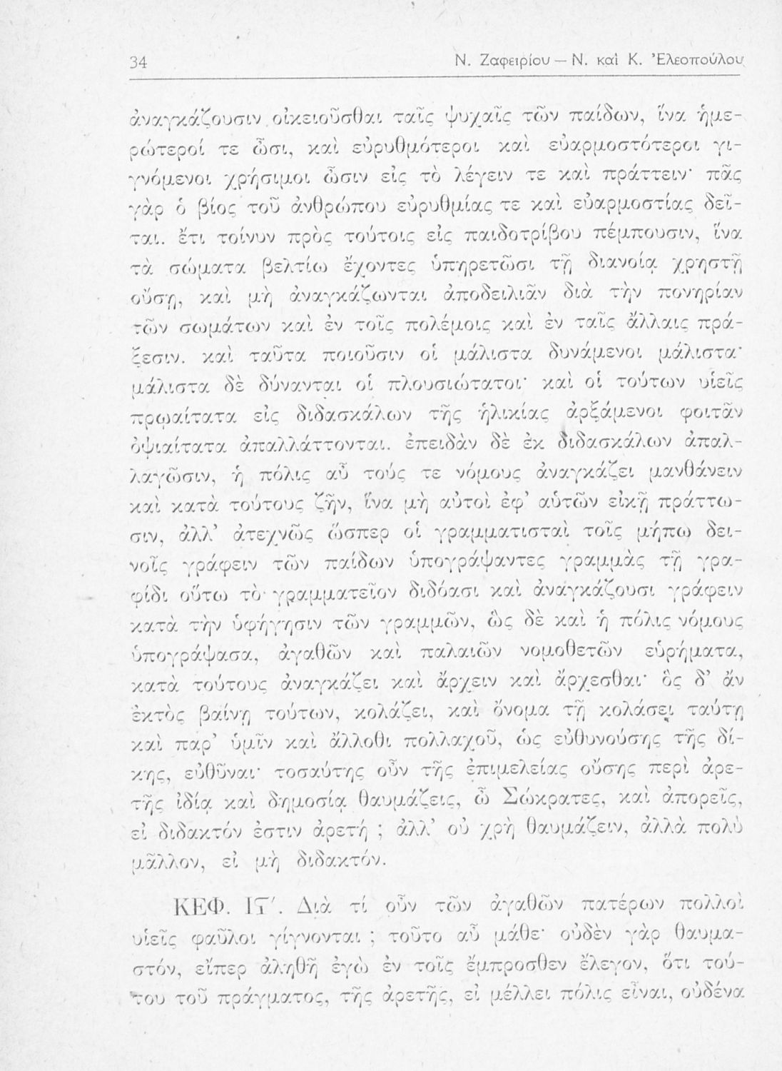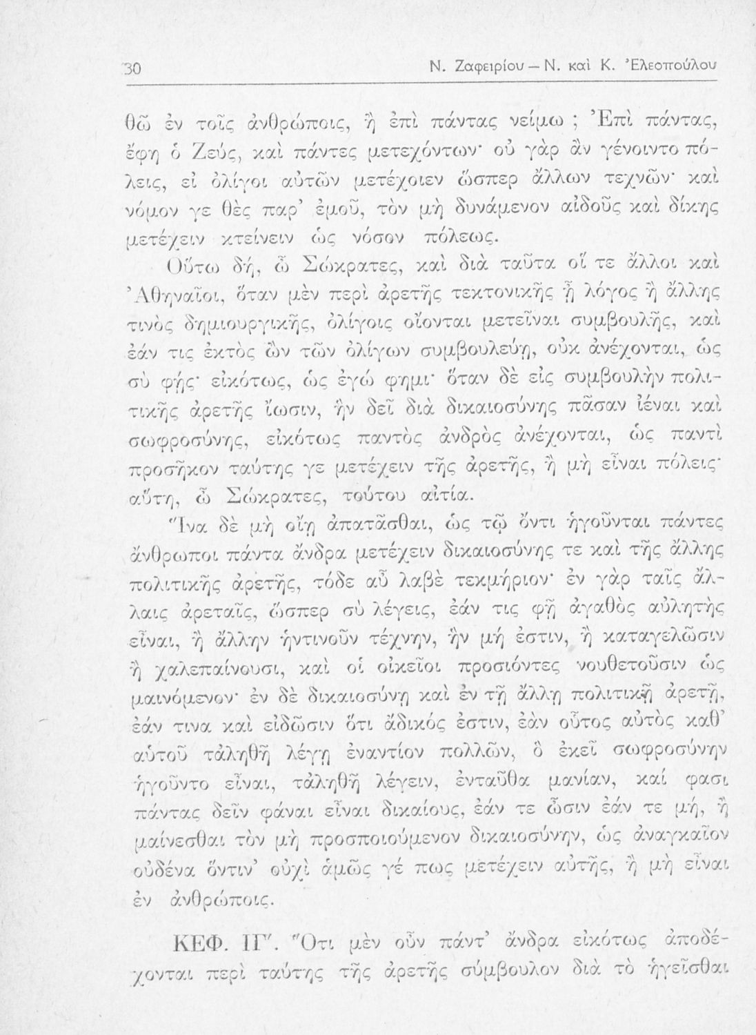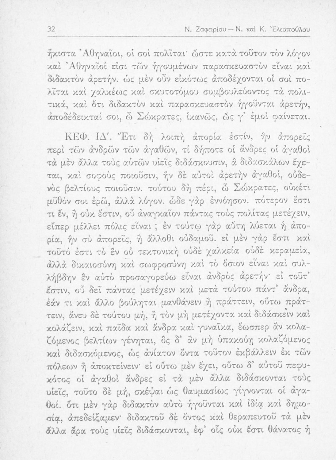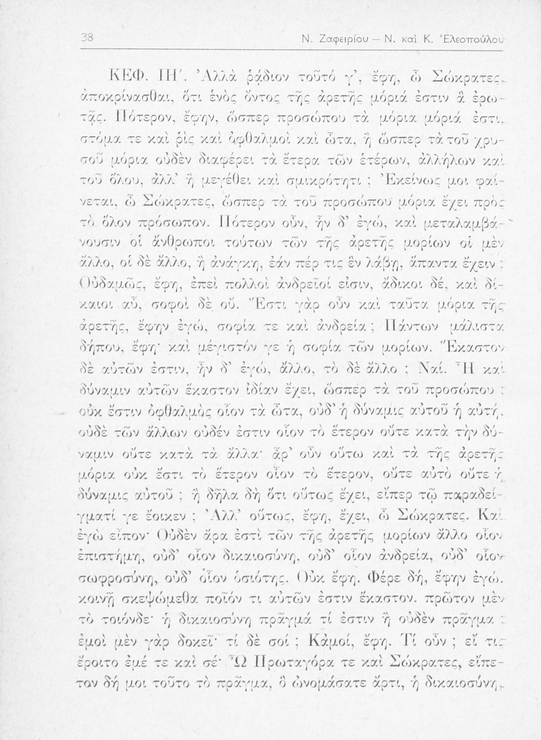 Βαθμίδα εκπαίδευσης: Δευτεροβάθμια Τάξη: ΣΤ' Γυμνασίου Μάθημα: Αρχαία Ελληνικά Γλώσσα: Καθαρεύουσα Παρουσίαση περιεχομένου: Σχολικό εγχειρίδιο για την ΣΤ΄ Γυμνασίου για το μάθημα των Αρχαίων Ελληνικών και συγκεκριμένα επιλεγόμενα αποσπάσματα από τον Πρωταγόρα του Πλάτωνα. Το εγχειρίδιο περιλαμβάνει εισαγωγικά σκοπός και παιδευτική αξία του διαλόγου, η τέχνη της σοφιστικής και οι σοφιστές, το αρχαίο πρωτότυπο κείμενο του Πρωταγόρα, ερμηνευτικά, πραγματολογικά και λεξιλογικά στοιχεία, παράρτημα με διακοσμητικά στοών και χώρων όπου γινόντουσαν οι φιλοσοφικές συζητήσεις κατά την αρχαιότητα. |