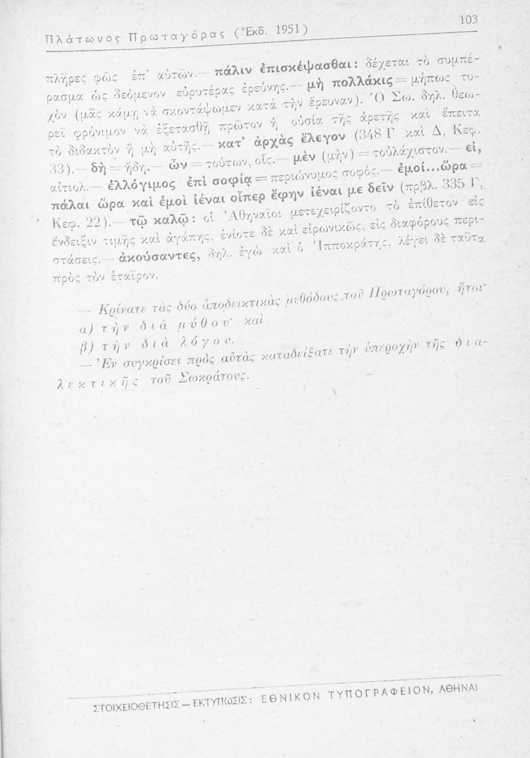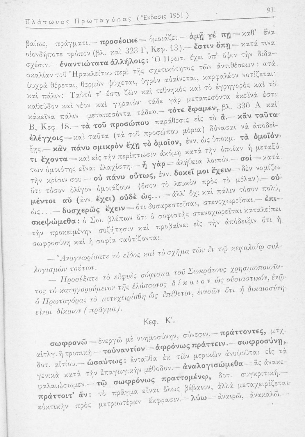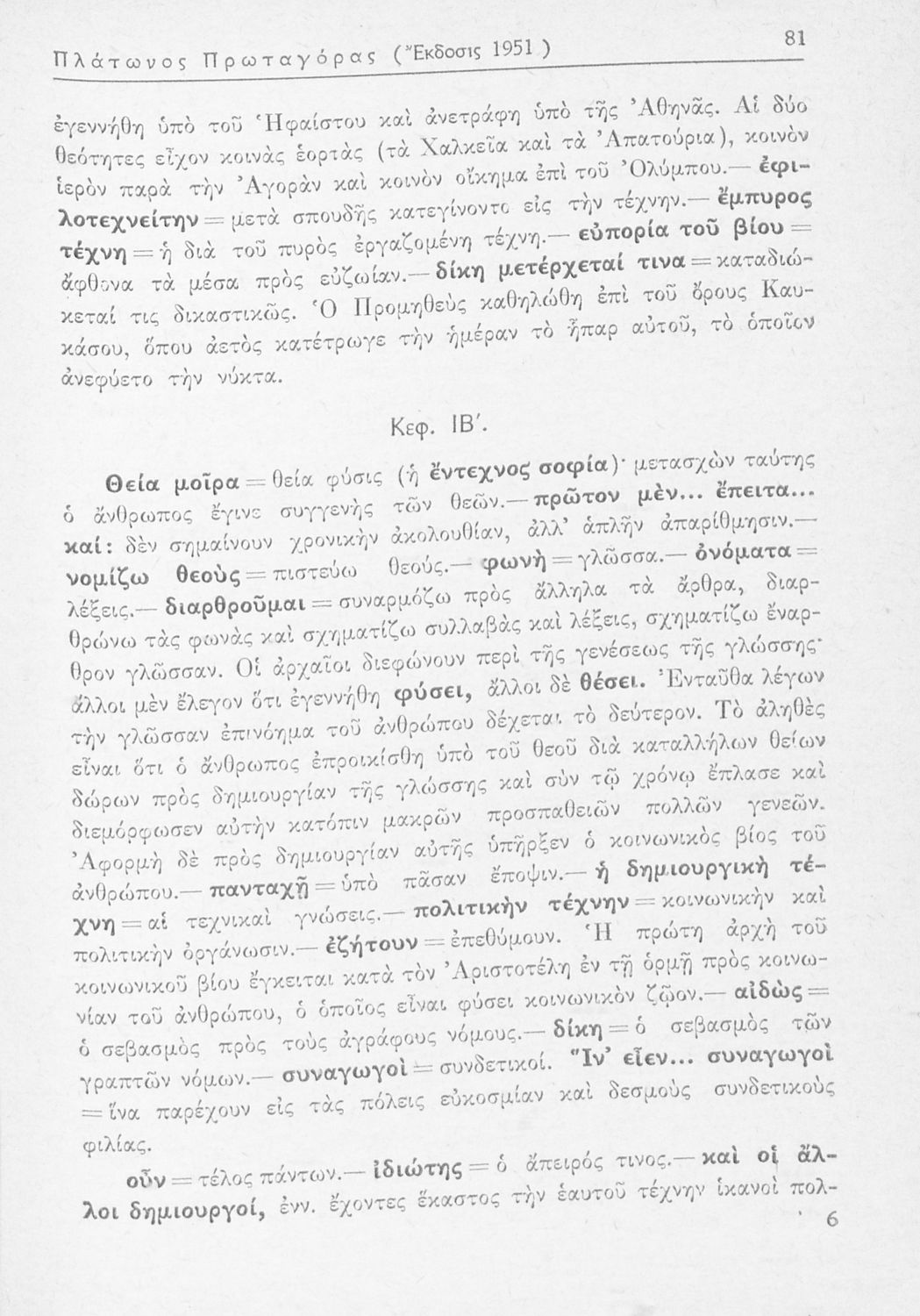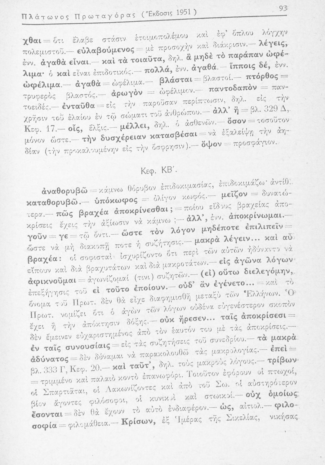 Βαθμίδα εκπαίδευσης: Δευτεροβάθμια Τάξη: ΣΤ' Γυμνασίου Μάθημα: Αρχαία Ελληνικά Γλώσσα: Καθαρεύουσα Παρουσίαση περιεχομένου: Σχολικό εγχειρίδιο για την ΣΤ΄ Γυμνασίου για το μάθημα των Αρχαίων Ελληνικών και συγκεκριμένα επιλεγόμενα αποσπάσματα από τον Πρωταγόρα του Πλάτωνα. Το εγχειρίδιο περιλαμβάνει εισαγωγικά σκοπός και παιδευτική αξία του διαλόγου, η τέχνη της σοφιστικής και οι σοφιστές, το αρχαίο πρωτότυπο κείμενο του Πρωταγόρα, ερμηνευτικά, πραγματολογικά και λεξιλογικά στοιχεία, παράρτημα με διακοσμητικά στοών και χώρων όπου γινόντουσαν οι φιλοσοφικές συζητήσεις κατά την αρχαιότητα. |
