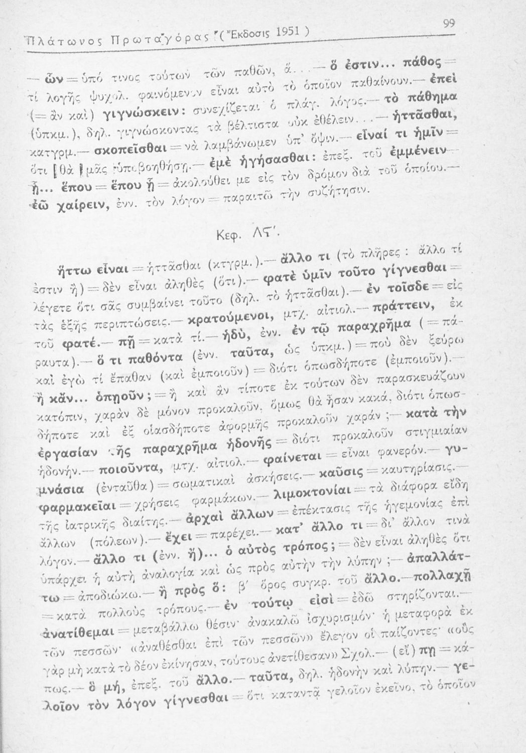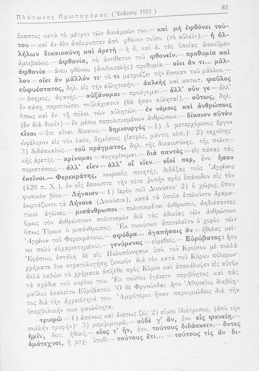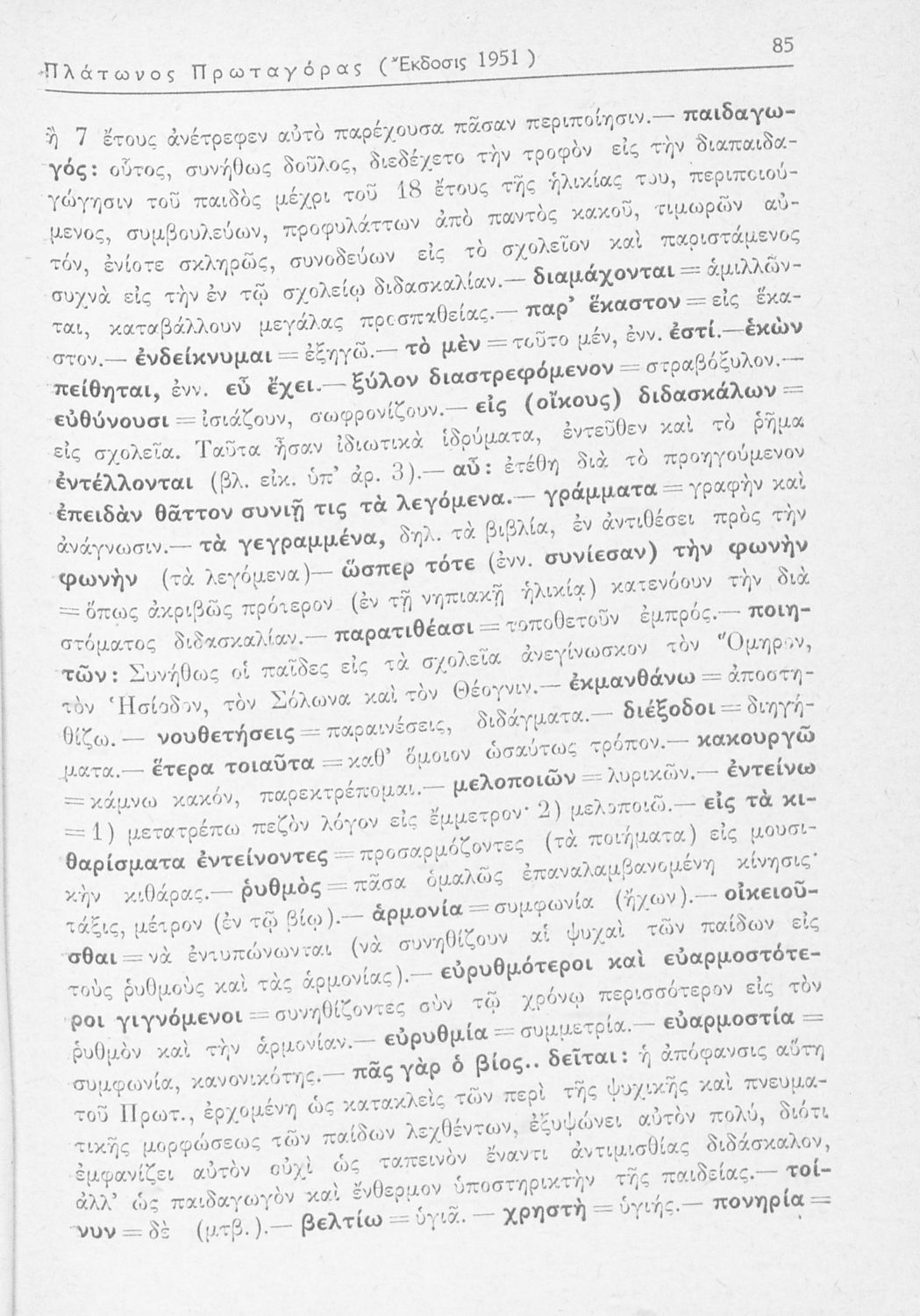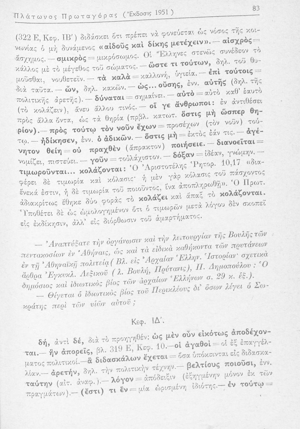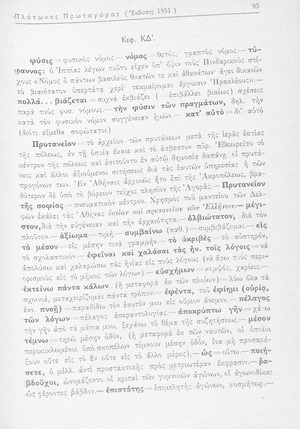 Βαθμίδα εκπαίδευσης: Δευτεροβάθμια Τάξη: ΣΤ' Γυμνασίου Μάθημα: Αρχαία Ελληνικά Γλώσσα: Καθαρεύουσα Παρουσίαση περιεχομένου: Σχολικό εγχειρίδιο για την ΣΤ΄ Γυμνασίου για το μάθημα των Αρχαίων Ελληνικών και συγκεκριμένα επιλεγόμενα αποσπάσματα από τον Πρωταγόρα του Πλάτωνα. Το εγχειρίδιο περιλαμβάνει εισαγωγικά σκοπός και παιδευτική αξία του διαλόγου, η τέχνη της σοφιστικής και οι σοφιστές, το αρχαίο πρωτότυπο κείμενο του Πρωταγόρα, ερμηνευτικά, πραγματολογικά και λεξιλογικά στοιχεία, παράρτημα με διακοσμητικά στοών και χώρων όπου γινόντουσαν οι φιλοσοφικές συζητήσεις κατά την αρχαιότητα. |