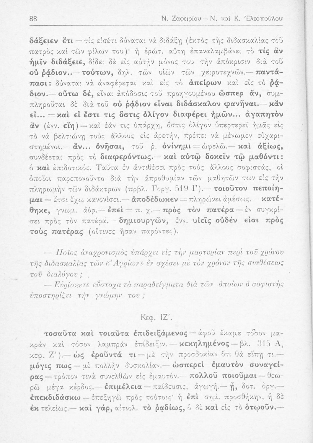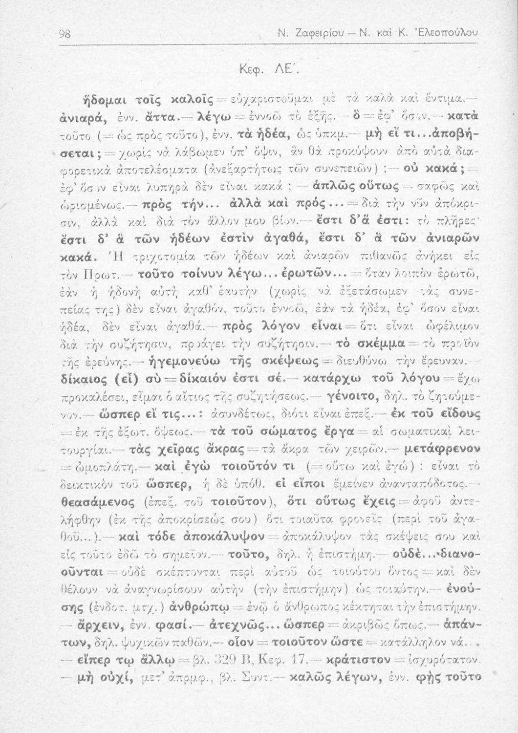 LDR 01934 2200193 4500 035 ## _a03-20556615 040 ## _aΒιβλιοθήκη της Βουλής των Ελλήνων 041 ## _ael 100 ## _aΠλάτων _aΝικ. Ζαφειρίου _aΝικ. Ελεόπουλος _aΚαλλ. Ελεοπούλου (σχόλια) 110 ## _a20556615 245 0# _aΠλάτωνος Πρωταγόρας δια την ΣΤ΄ τάξιν των Εξαταξίων Γυμνασίων 260 ## _aΑθήνα _bΟργανισμός Εκδόσεως Σχολικών Βιβλίων _c1951 300 ## _a114 _bΣκίτσα (ασπρόμαυρα) _c20 520 ## _aΣχολικό εγχειρίδιο για την ΣΤ΄ Γυμνασίου για το μάθημα των Αρχαίων Ελληνικών και συγκεκριμένα επιλεγόμενα αποσπάσματα από τον Πρωταγόρα του Πλάτωνα. Το εγχειρίδιο περιλαμβάνει εισαγωγικά σκοπός και παιδευτική αξία του διαλόγου, η τέχνη της σοφιστικής και οι σοφιστές, το αρχαίο πρωτότυπο κείμενο του Πρωταγόρα, ερμηνευτικά, πραγματολογικά και λεξιλογικά στοιχεία, παράρτημα με διακοσμητικά στοών και χώρων όπου γινόντουσαν οι φιλοσοφικές συζητήσεις κατά την αρχαιότητα. 521 ## _aΣΤ' Γυμνασίου 522 ## _aΕλλάδα 546 ## _aΚαθαρεύουσα 563 ## _aΜαλακό Εξώφυλλο 650 #4 _aΑρχαίο κείμενο _aΔιάλογος _aΕικόνες _aΕισαγωγή _aΕρμηνευτικές σημειώσεις _aΚαθαρεύουσα _aΠλάτωνος Πρωταγόρας ΣΤ΄ Γυμνασίου _aΣοφιστές και πλοκή του έργου