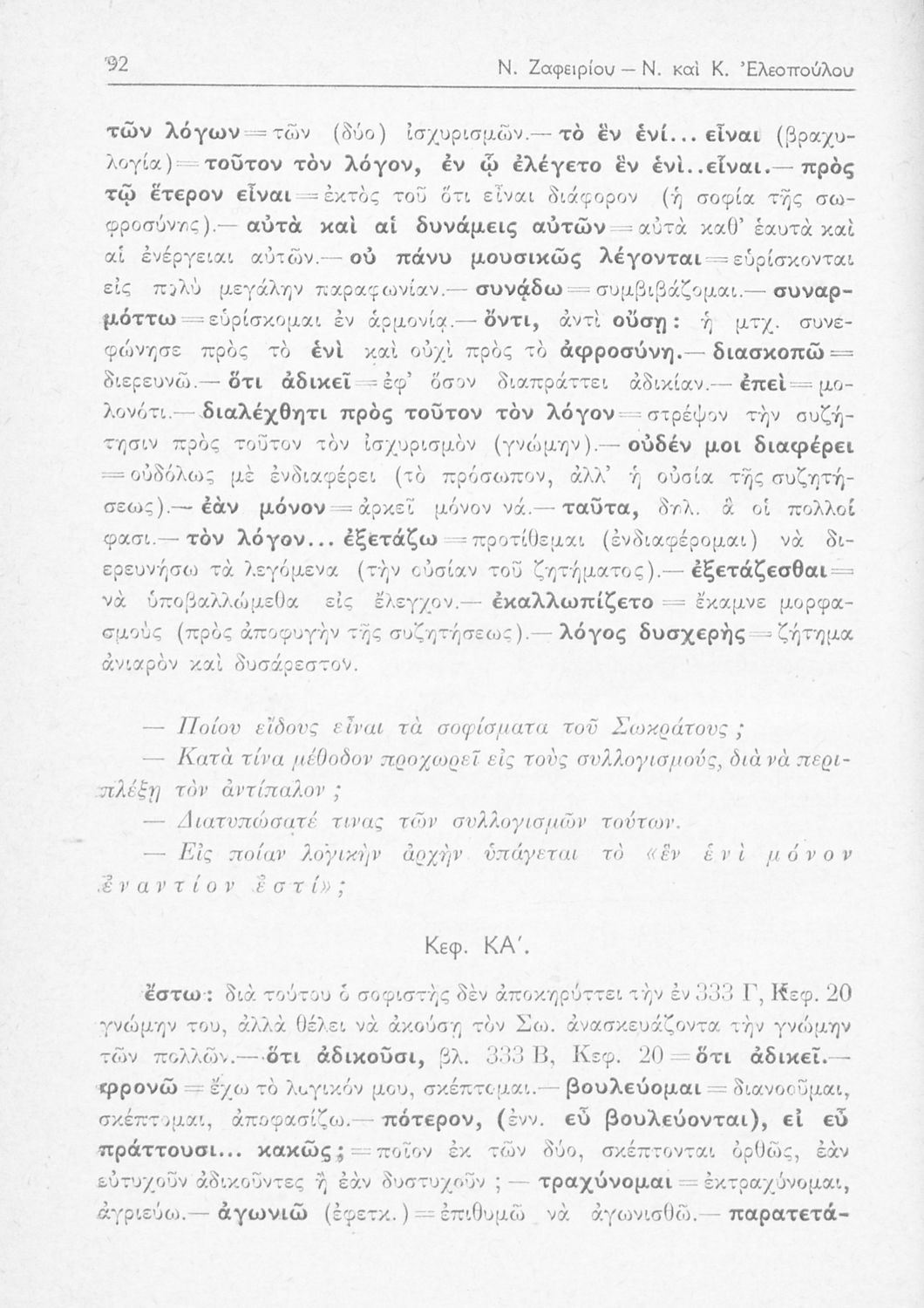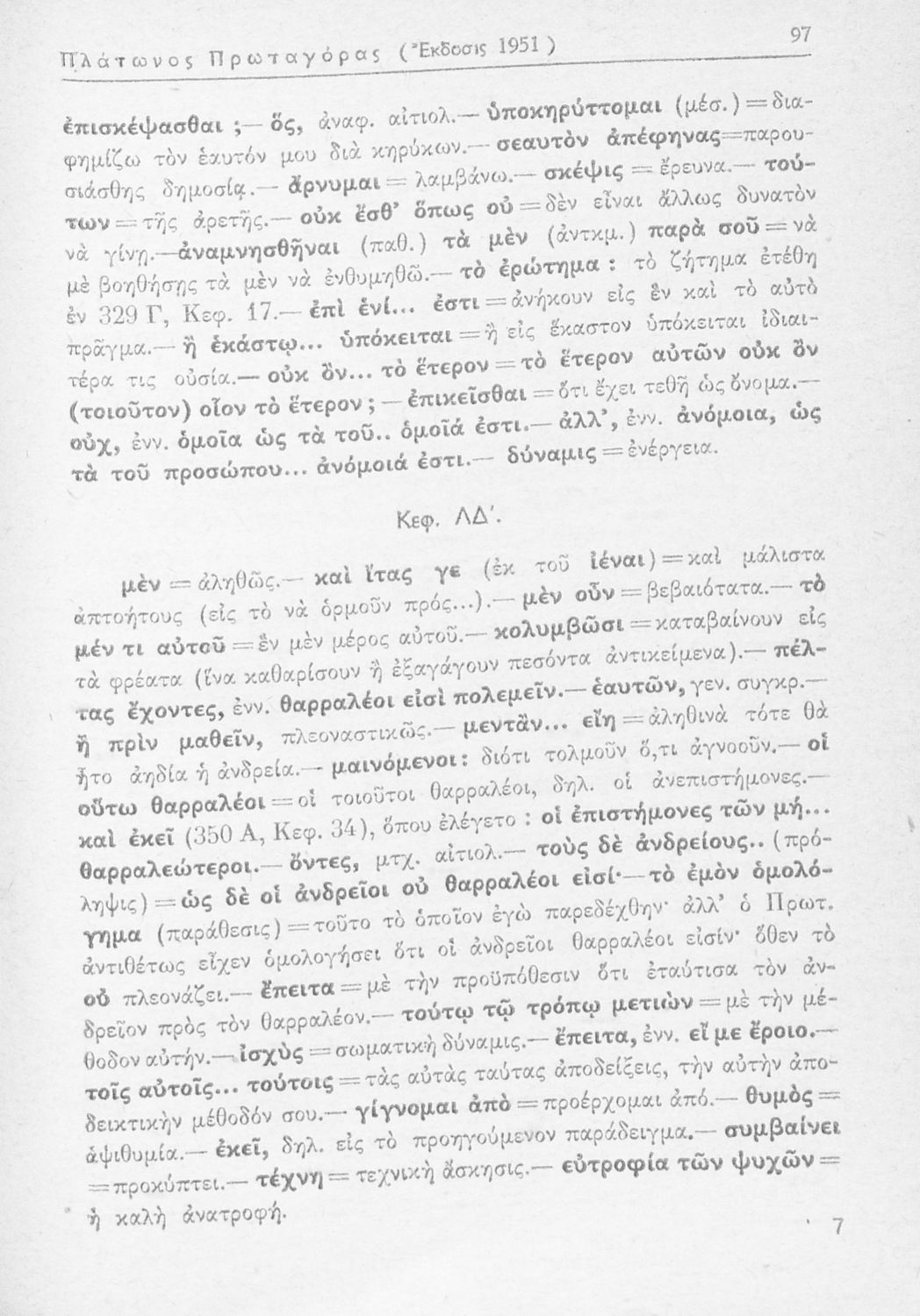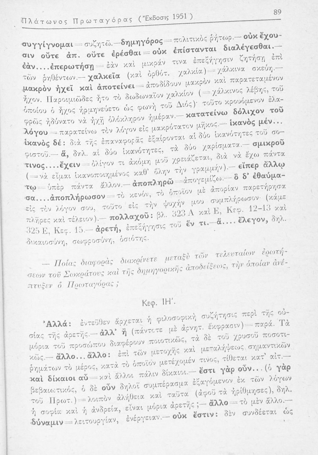 Σχολικό εγχειρίδιο για την ΣΤ΄ Γυμνασίου για το μάθημα των Αρχαίων Ελληνικών και συγκεκριμένα επιλεγόμενα αποσπάσματα από τον Πρωταγόρα του Πλάτωνα. Το εγχειρίδιο περιλαμβάνει εισαγωγικά σκοπός και παιδευτική αξία του διαλόγου, η τέχνη της σοφιστικής και οι σοφιστές, το αρχαίο πρωτότυπο κείμενο του Πρωταγόρα, ερμηνευτικά, πραγματολογικά και λεξιλογικά στοιχεία, παράρτημα με διακοσμητικά στοών και χώρων όπου γινόντουσαν οι φιλοσοφικές συζητήσεις κατά την αρχαιότητα.