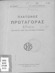 Σχολικό εγχειρίδιο για την ΣΤ΄ Γυμνασίου για το μάθημα των Αρχαίων Ελληνικών και συγκεκριμένα επιλεγόμενα αποσπάσματα από τον Πρωταγόρα του Πλάτωνα. Το εγχειρίδιο περιλαμβάνει εισαγωγικά σκοπός και παιδευτική αξία του διαλόγου, η τέχνη της σοφιστικής και οι σοφιστές, το αρχαίο πρωτότυπο κείμενο του Πρωταγόρα, ερμηνευτικά, πραγματολογικά και λεξιλογικά στοιχεία, παράρτημα με διακοσμητικά στοών και χώρων όπου γινόντουσαν οι φιλοσοφικές συζητήσεις κατά την αρχαιότητα.