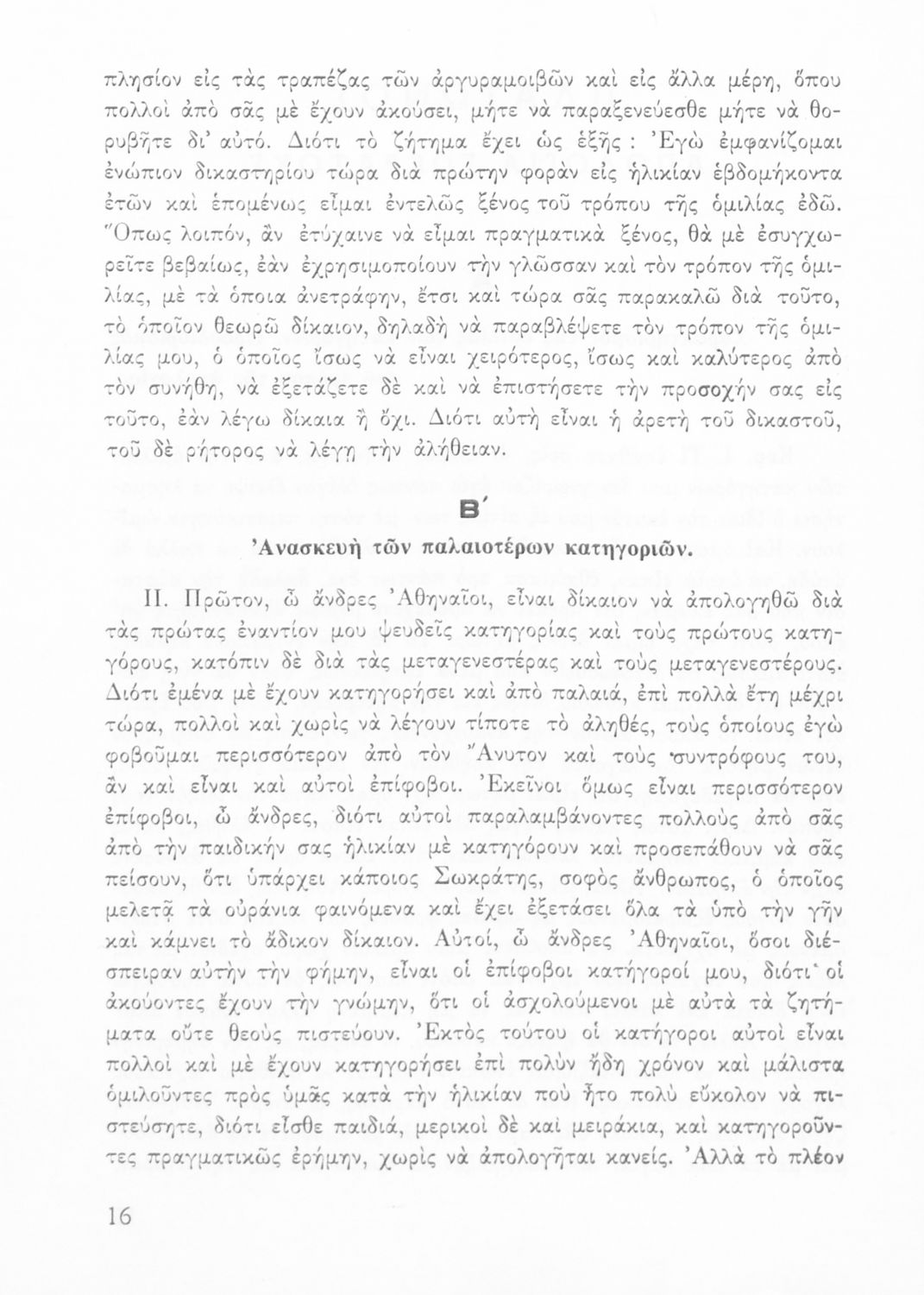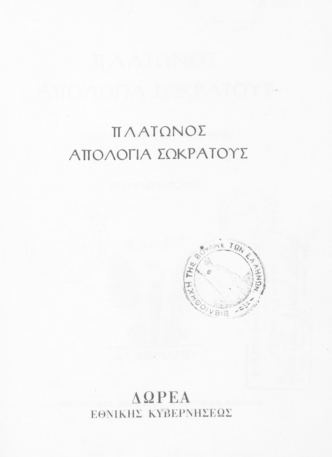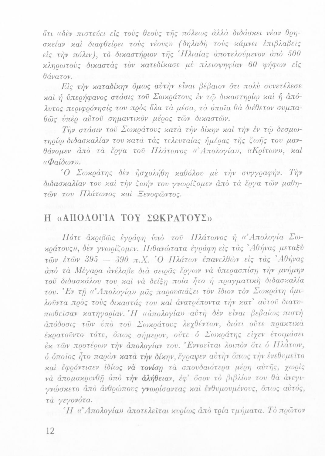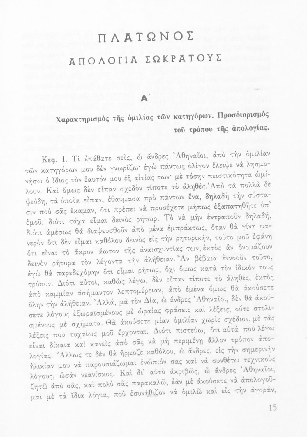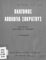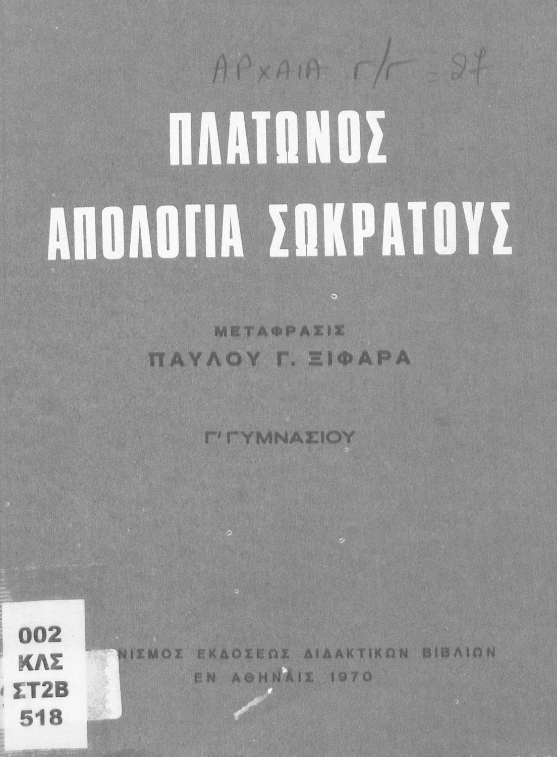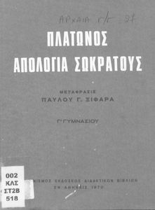 Σχολικό εγχειρίδιο της Γ΄ Τάξης Γυμνασίου για το μάθημα των Αρχαίων Ελληνικών. Περιέχει το πρωτότυπο κείμενο της Απολογίας του Σωκράτη με πραγματολογικές και ερμηνευτικές παρατηρήσεις του συγγραφέα. Επίσης έχει εισαγωγή και μετάφραση.
