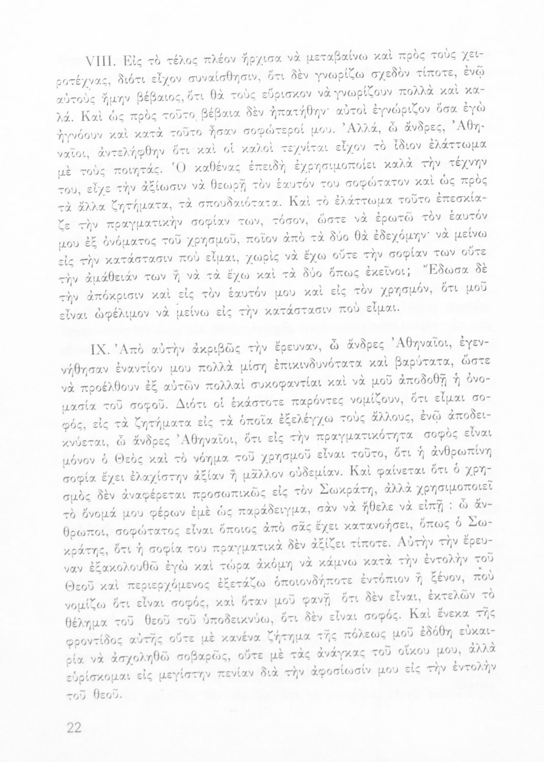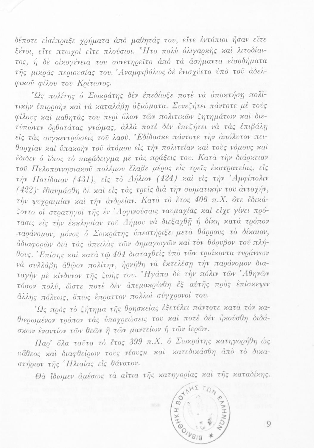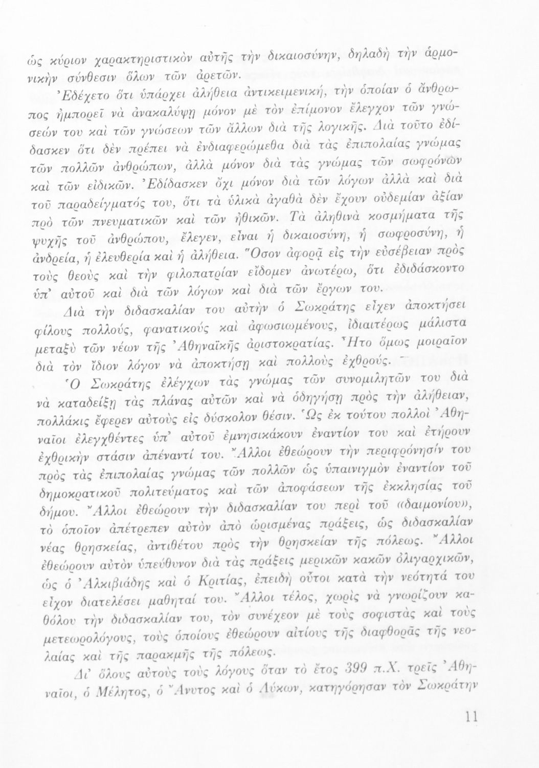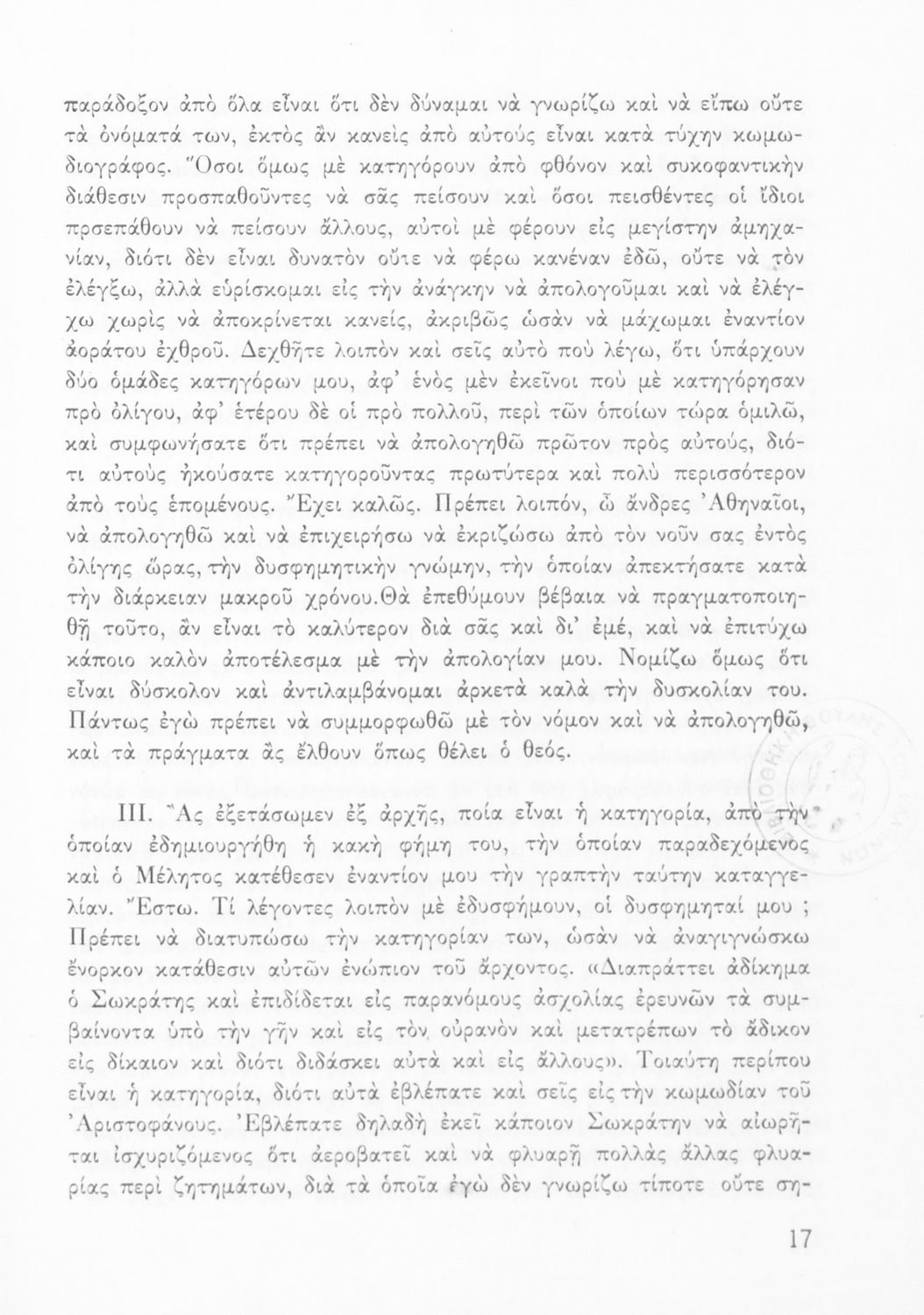 Σχολικό εγχειρίδιο της Γ΄ Τάξης Γυμνασίου για το μάθημα των Αρχαίων Ελληνικών. Περιέχει το πρωτότυπο κείμενο της Απολογίας του Σωκράτη με πραγματολογικές και ερμηνευτικές παρατηρήσεις του συγγραφέα. Επίσης έχει εισαγωγή και μετάφραση.