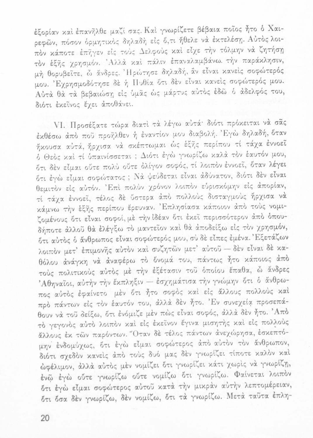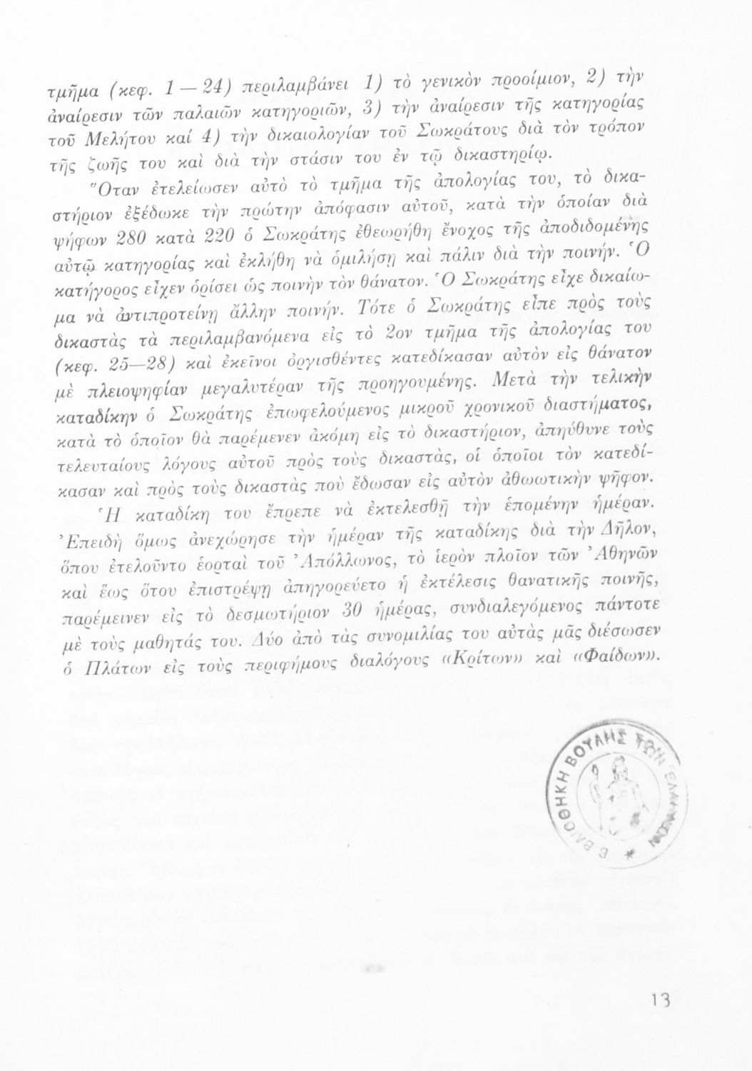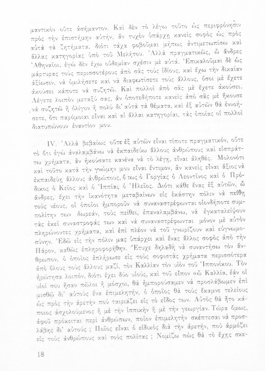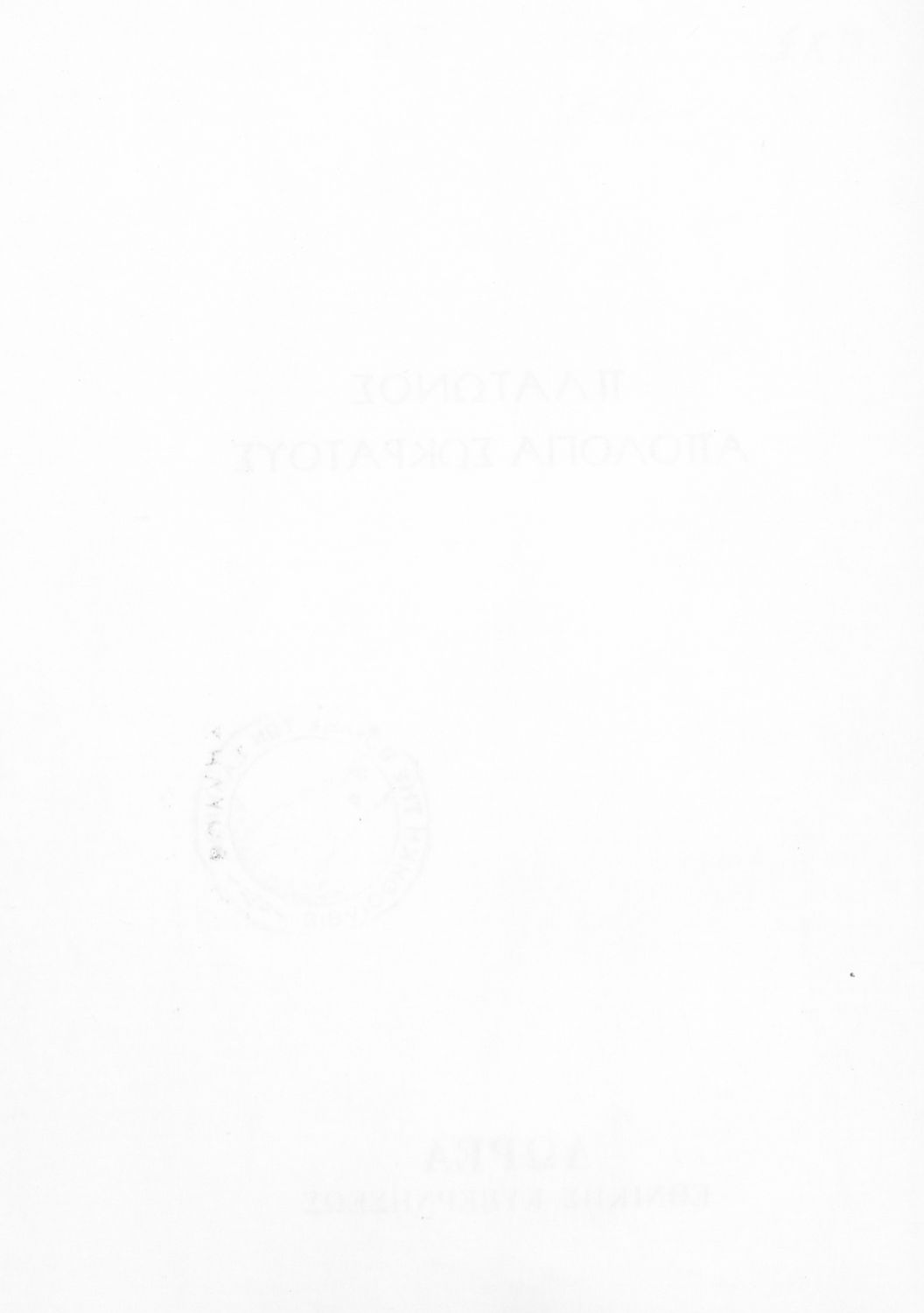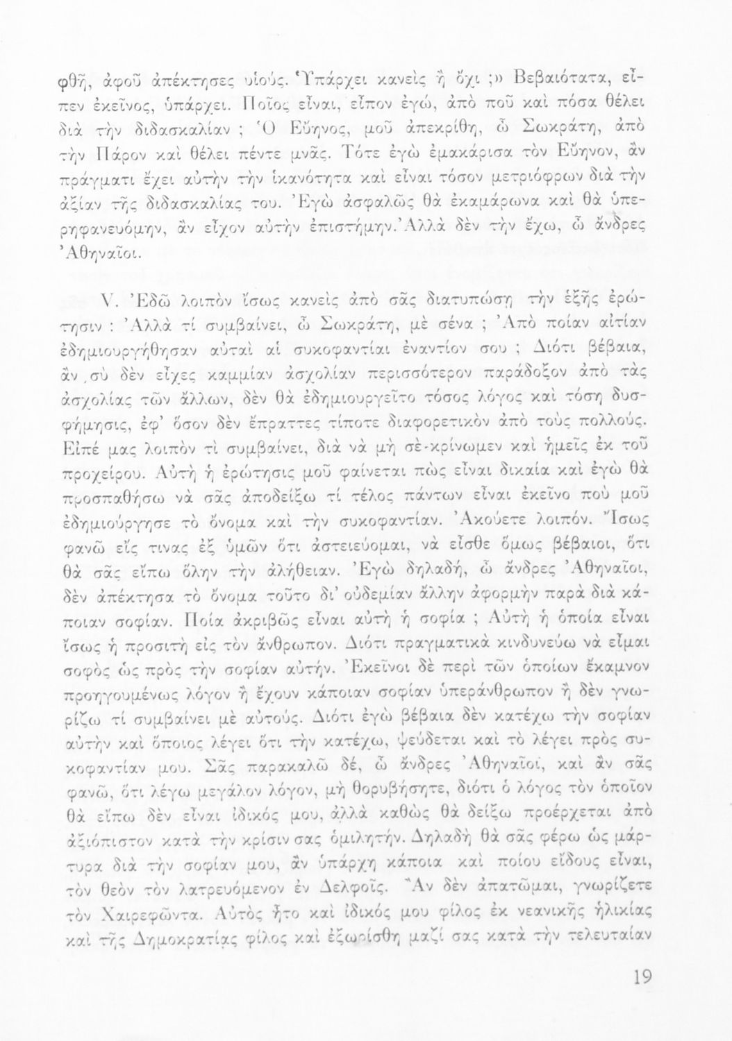 Σχολικό εγχειρίδιο της Γ΄ Τάξης Γυμνασίου για το μάθημα των Αρχαίων Ελληνικών. Περιέχει το πρωτότυπο κείμενο της Απολογίας του Σωκράτη με πραγματολογικές και ερμηνευτικές παρατηρήσεις του συγγραφέα. Επίσης έχει εισαγωγή και μετάφραση.