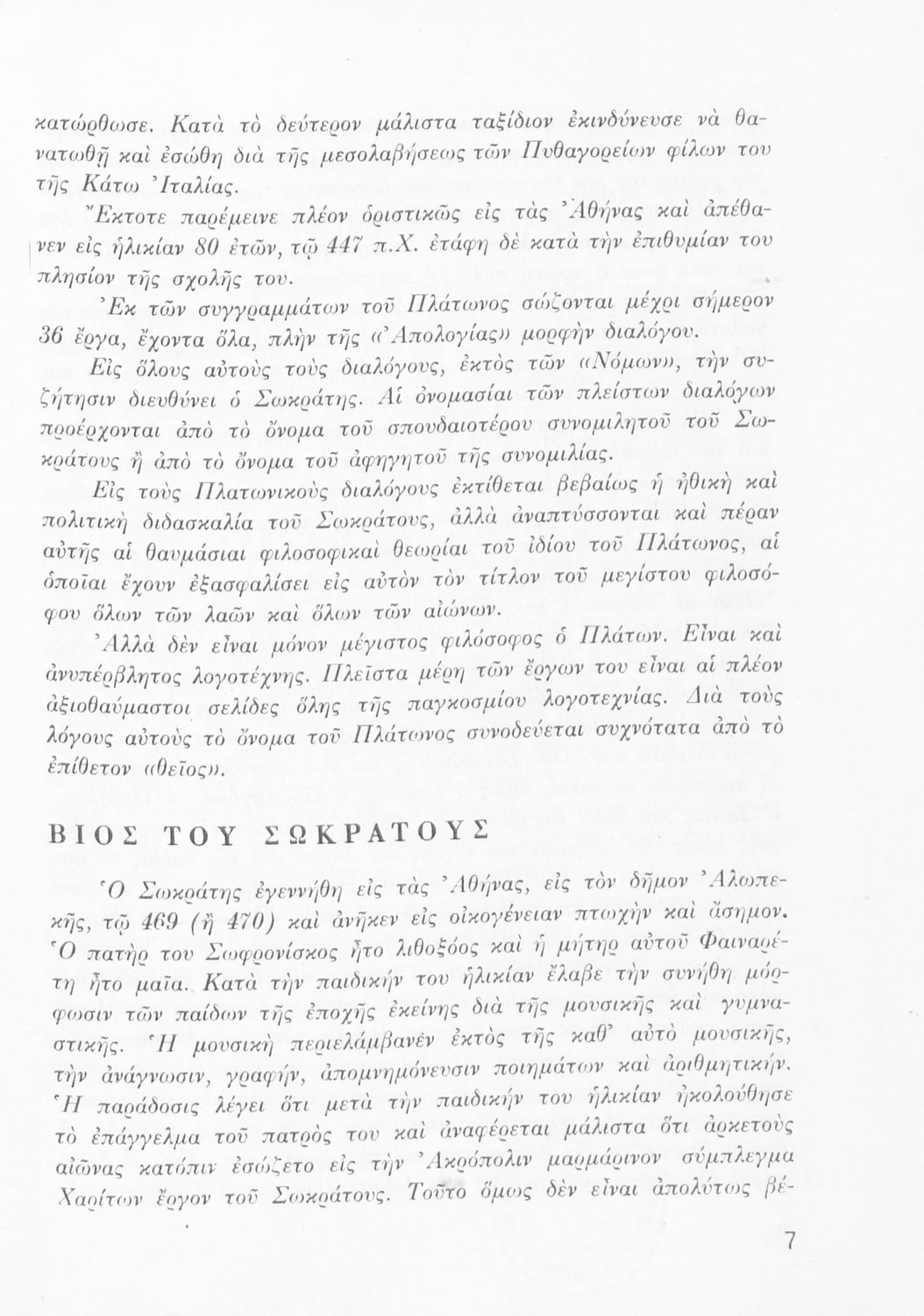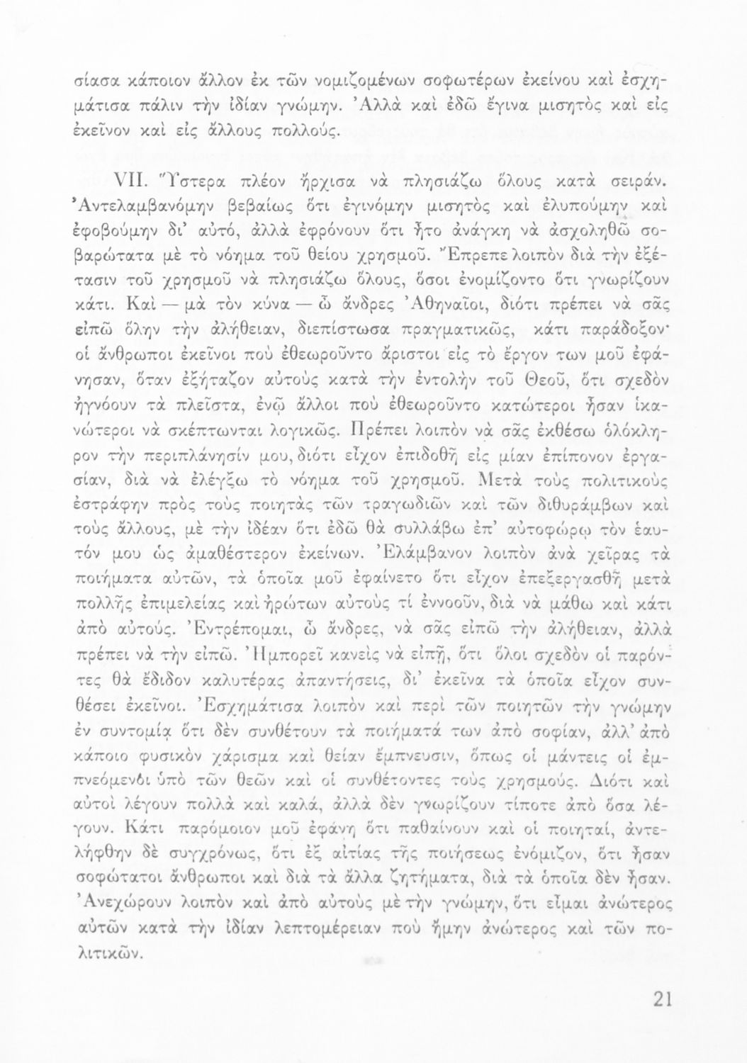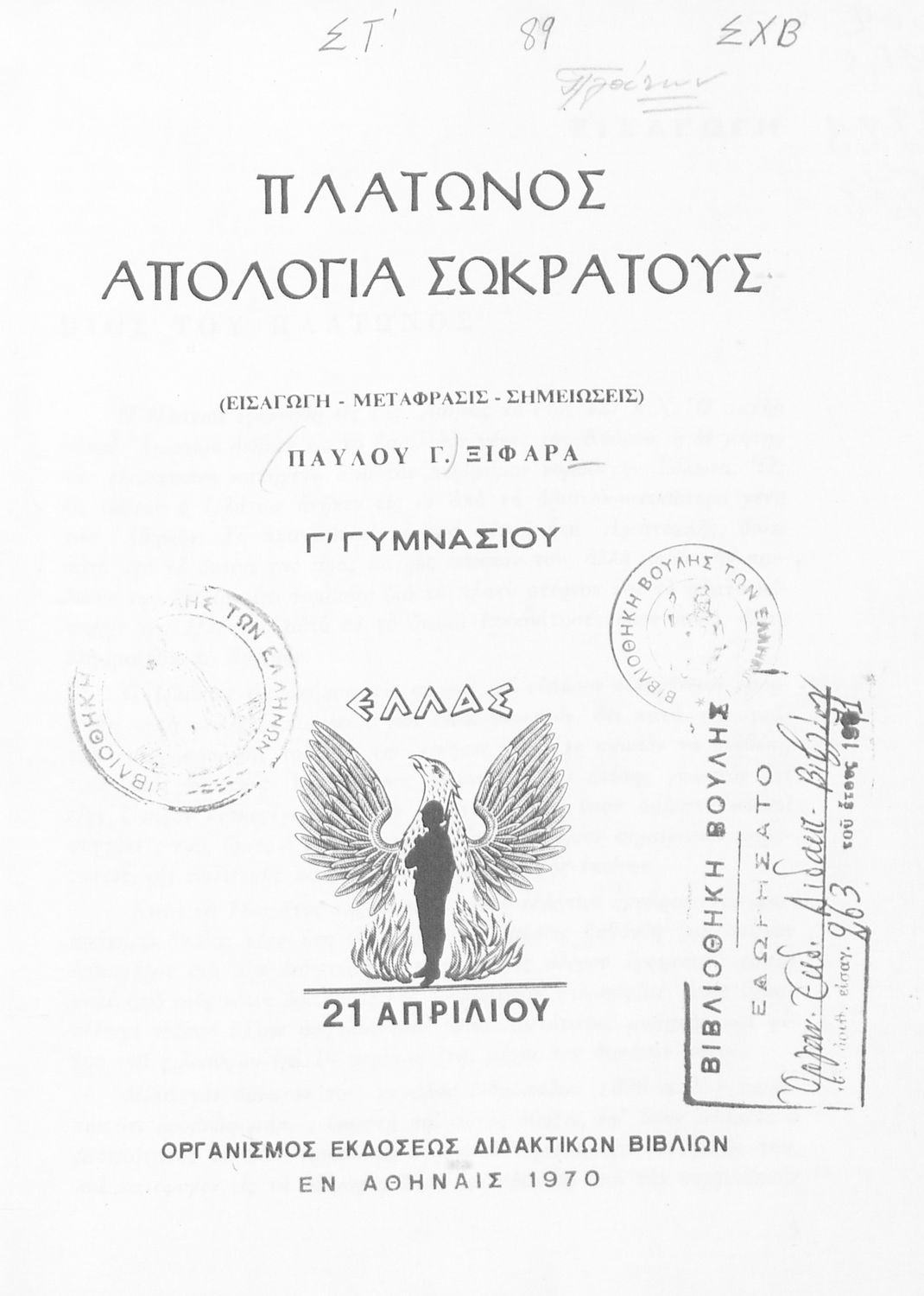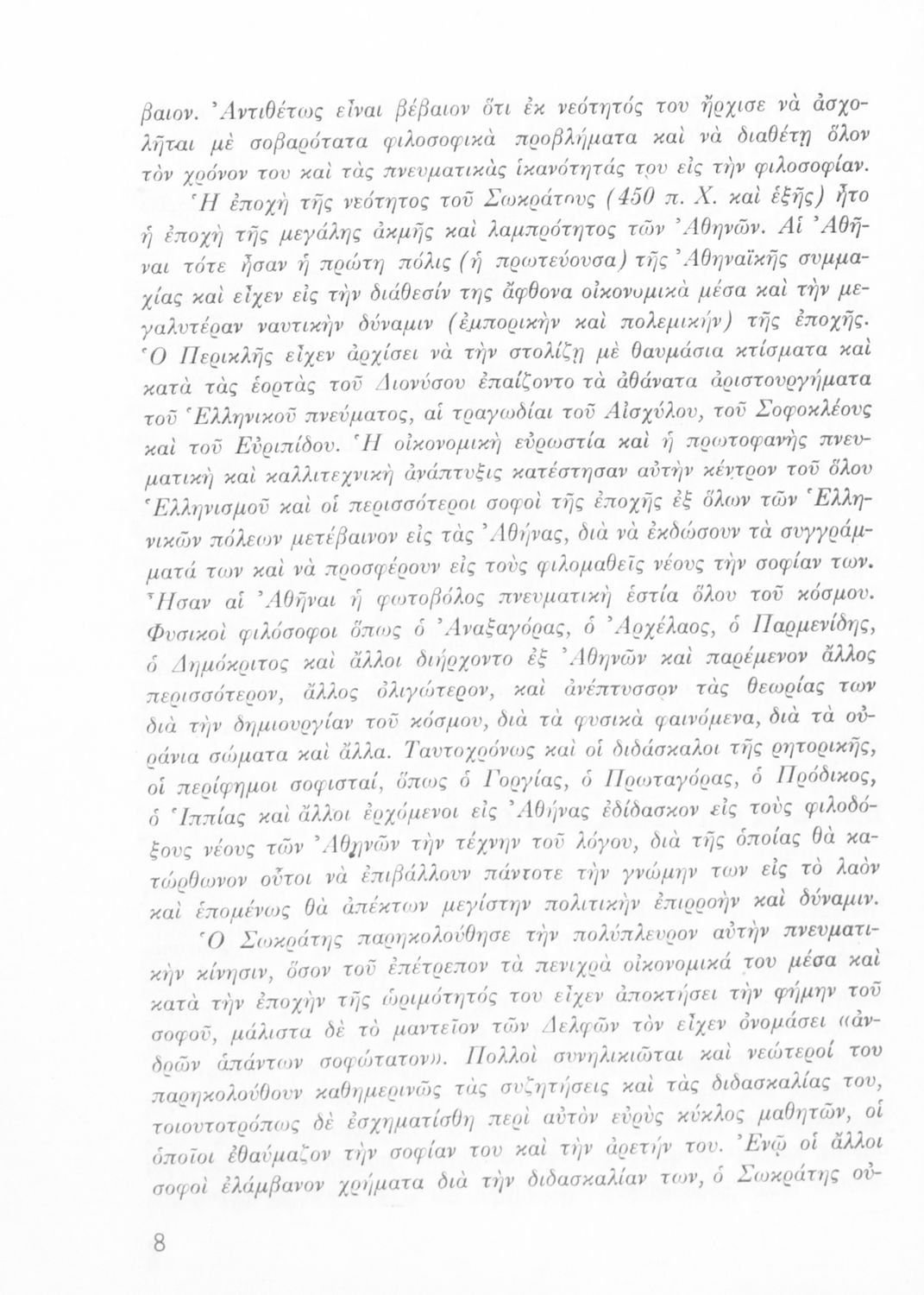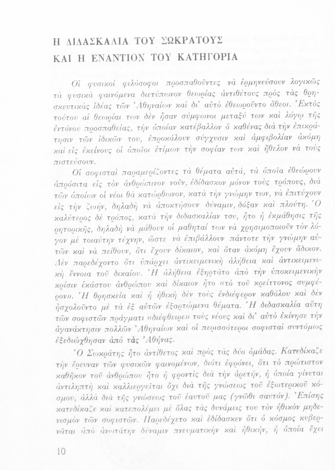 Σχολικό εγχειρίδιο της Γ΄ Τάξης Γυμνασίου για το μάθημα των Αρχαίων Ελληνικών. Περιέχει το πρωτότυπο κείμενο της Απολογίας του Σωκράτη με πραγματολογικές και ερμηνευτικές παρατηρήσεις του συγγραφέα. Επίσης έχει εισαγωγή και μετάφραση.