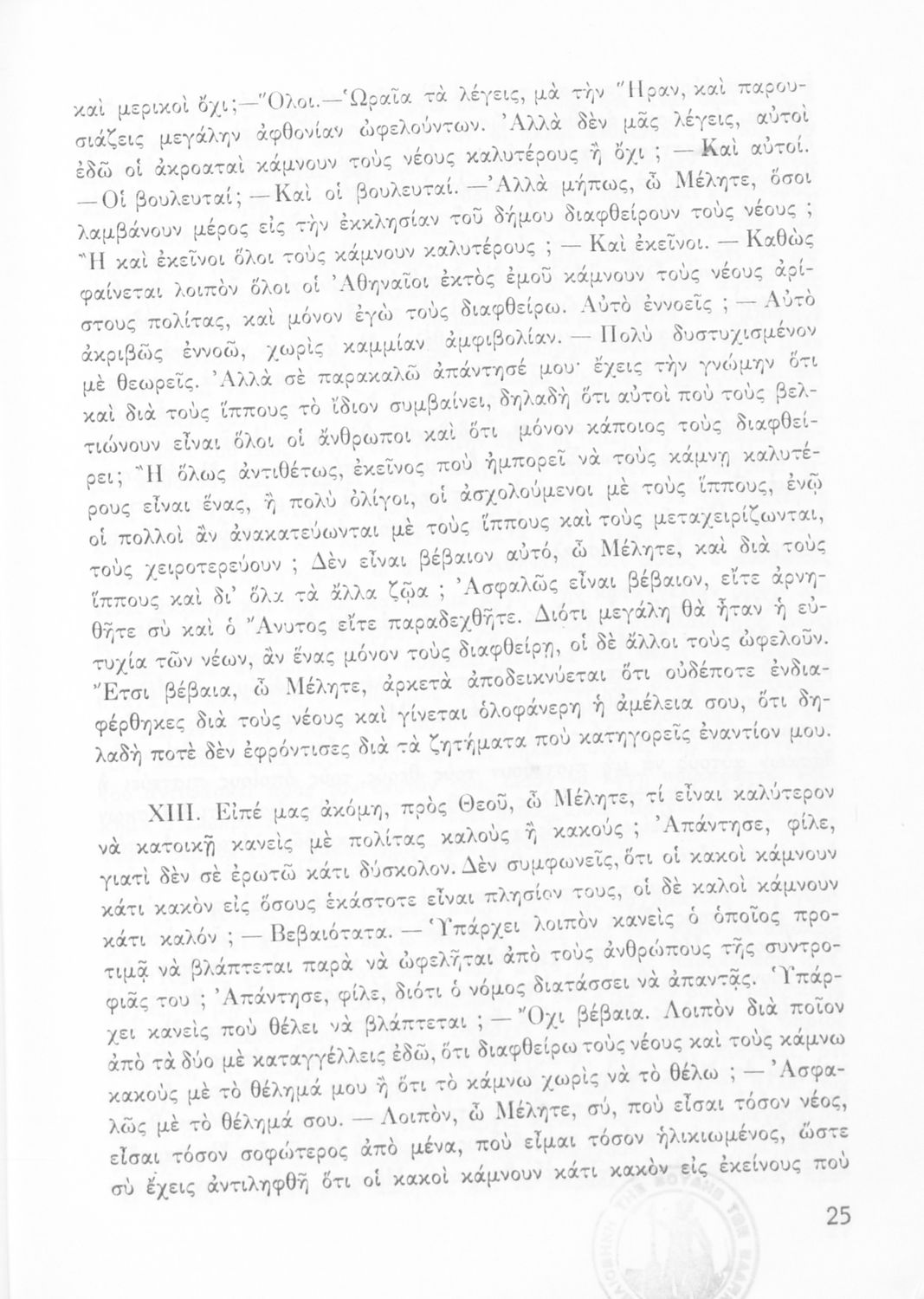 Σχολικό εγχειρίδιο Αρχαίων Ελληνικών για την Ε' Γυμνασίου. Βιβλίο που περιλαμβάνει εισαγωγή με το βίο του Πλάτωνα ενώ το κείμενο είναι μετάφραση. Το βιβλίο κοσμείται από το σύμβολο της επταετίας.