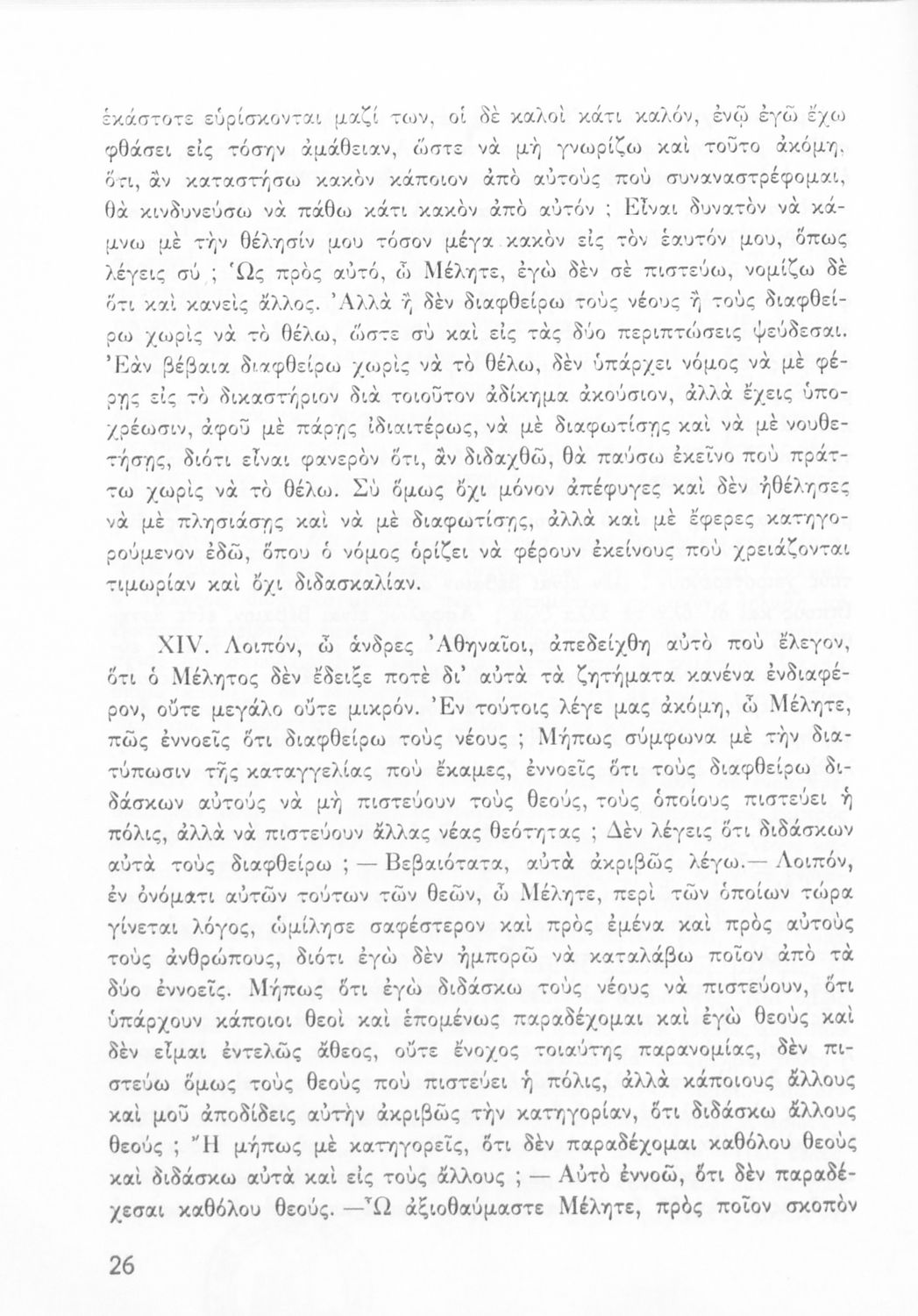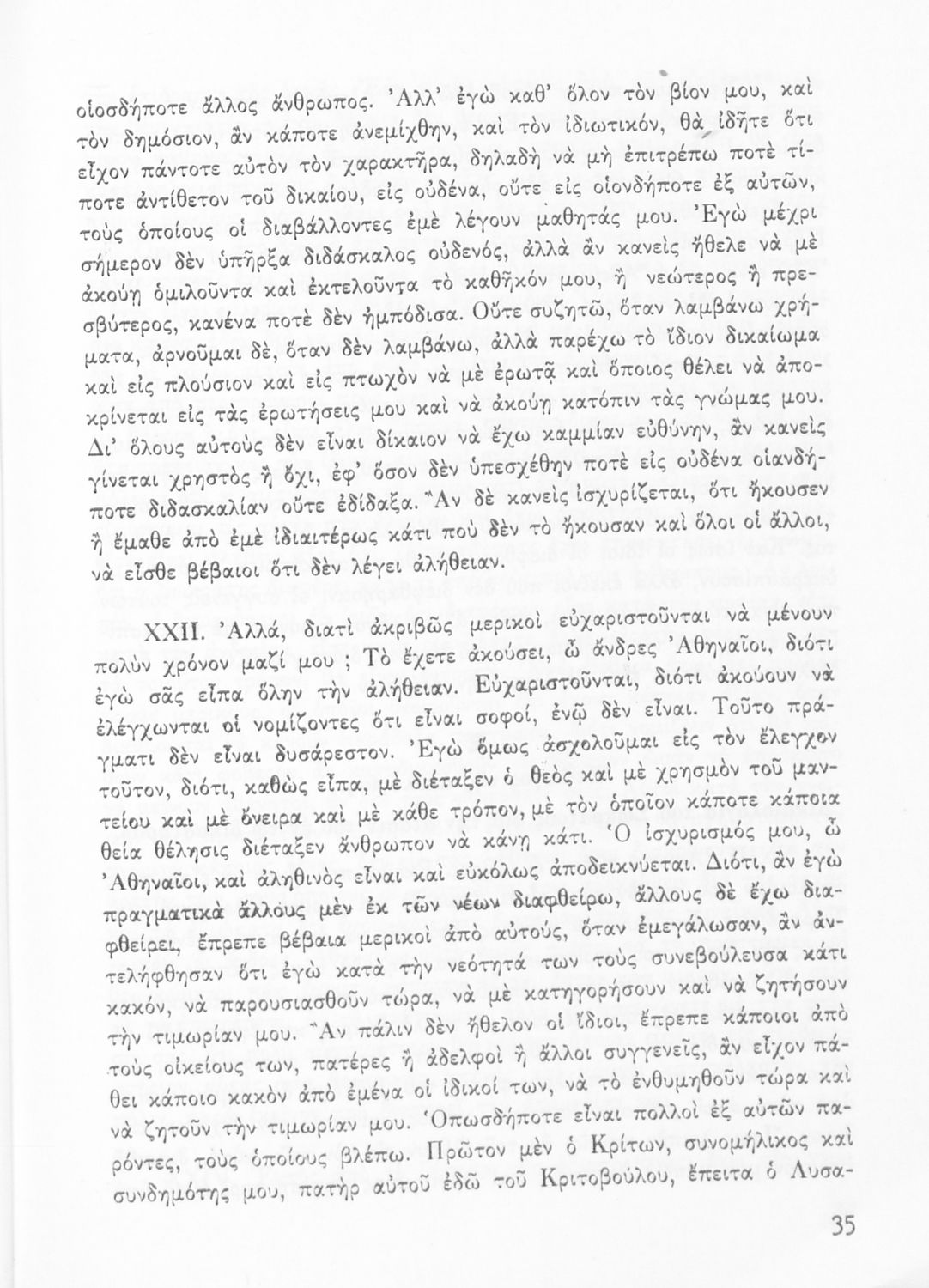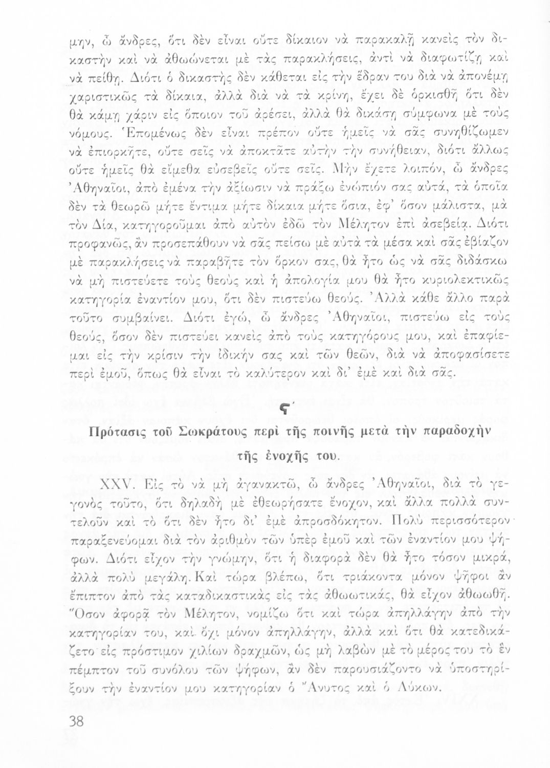 Σχολικό εγχειρίδιο της Ε΄ Τάξης Γυμνασίου για το μάθημα των Αρχαίων Ελληνικών. Περιέχει το πρωτότυπο κείμενο της Απολογίας του Σωκράτη με πραγματολογικές και ερμηνευτικές παρατηρήσεις του συγγραφέα. Επίσης έχει εισαγωγή και μετάφραση.
