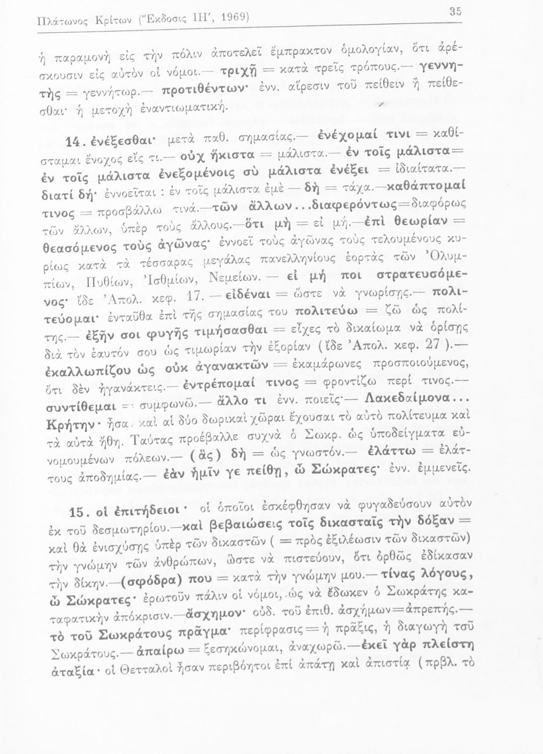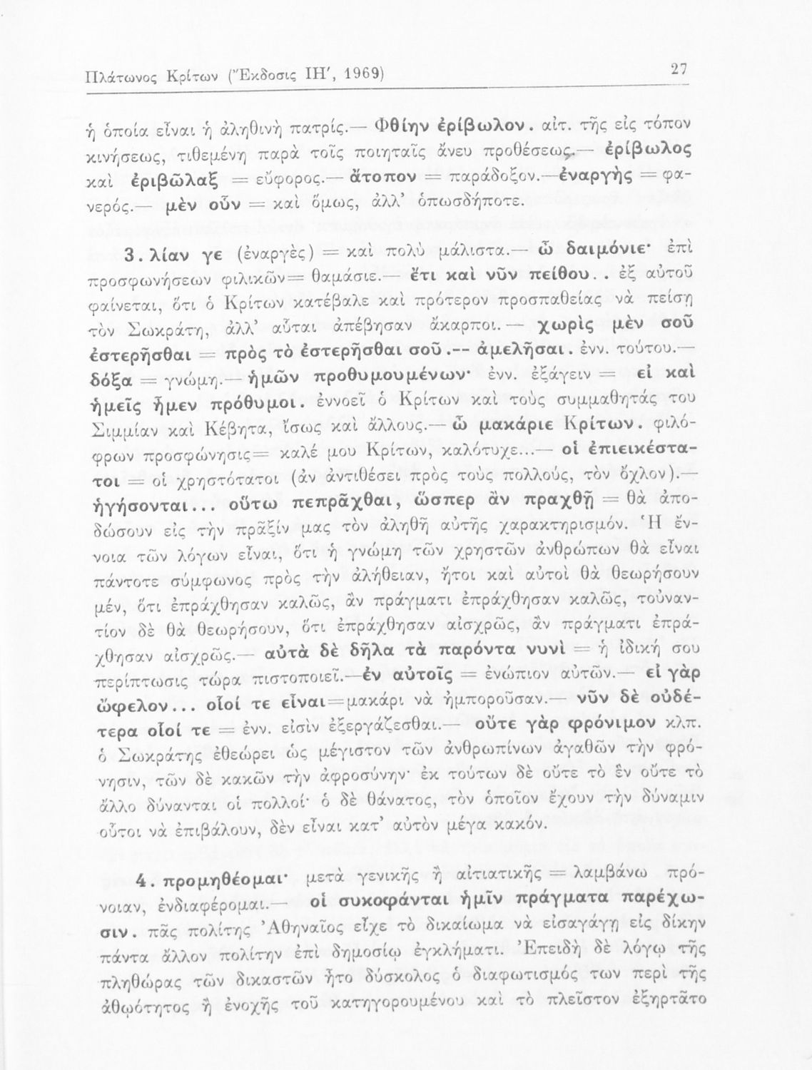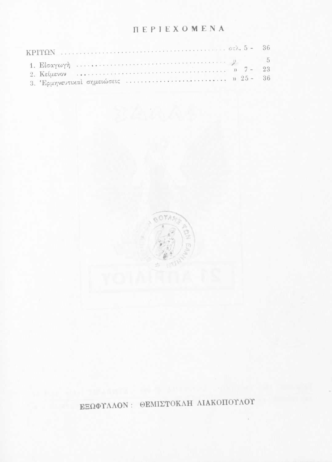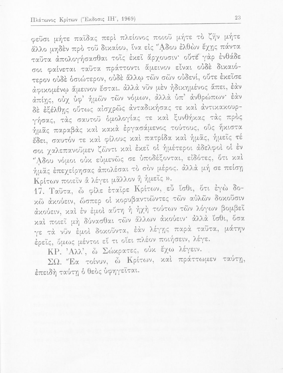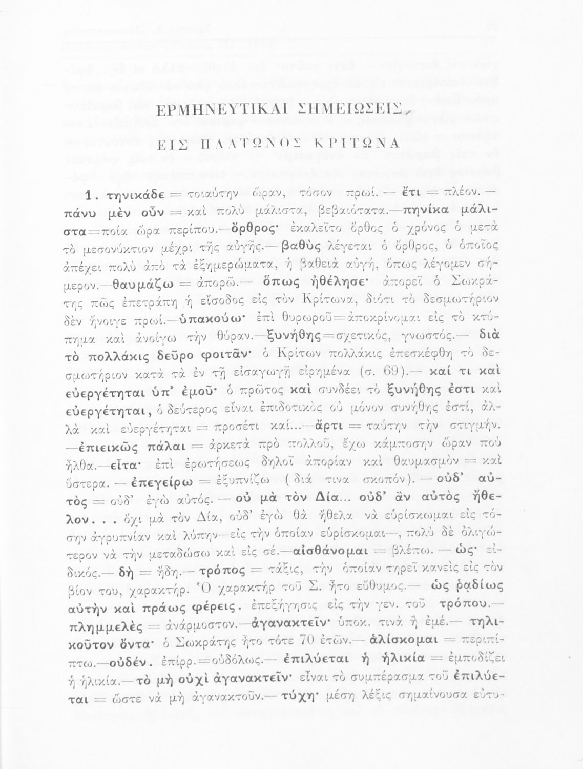Σχολικό εγχειρίδιο της Ε΄ Γυμνασίου για το μάθημα των Αρχαίων Ελληνικών. Το εγχειρίδιο περιλαμβάνει το αρχαίο κείμενο του έργου του Πλάτωνα, "Κρίτων" και το β΄ μέρος περιλαμβάνει ερμηνευτικές σημειώσεις με πραγματολογικά, γλωσσικά και γραμματολογικά σχόλια.