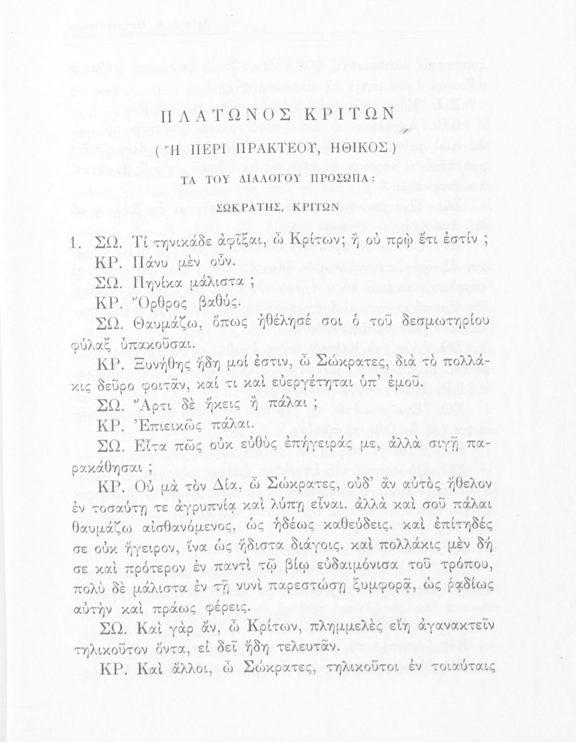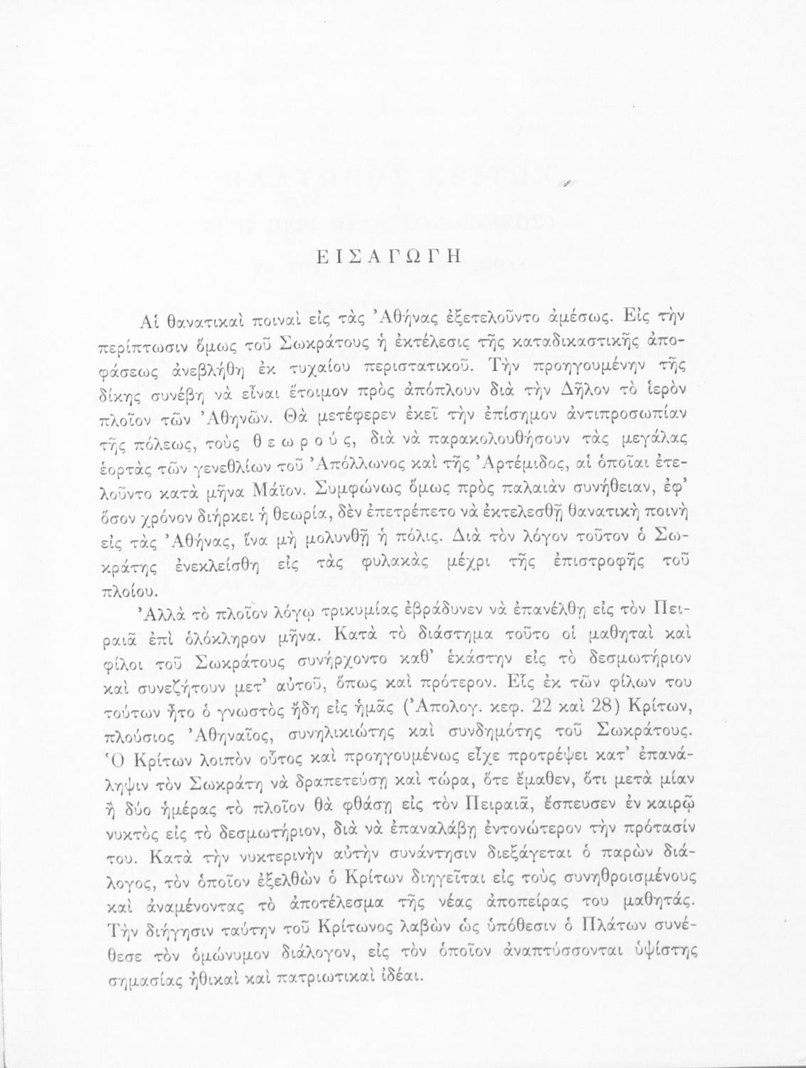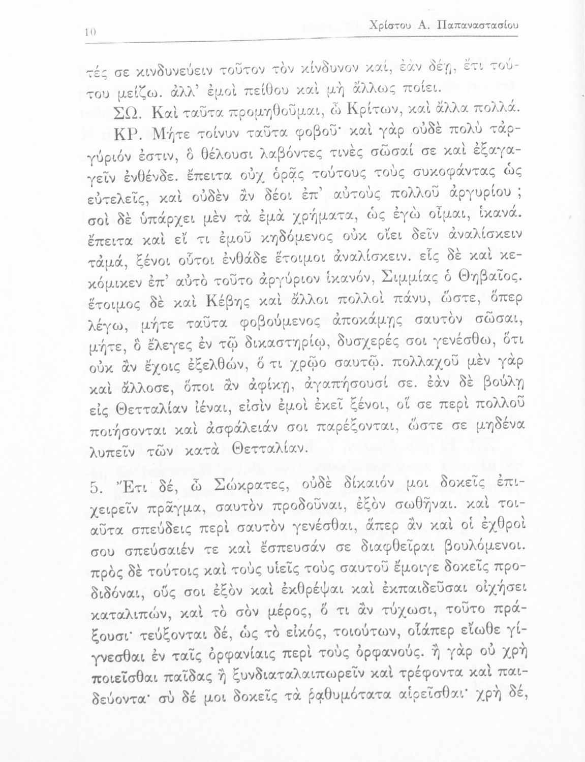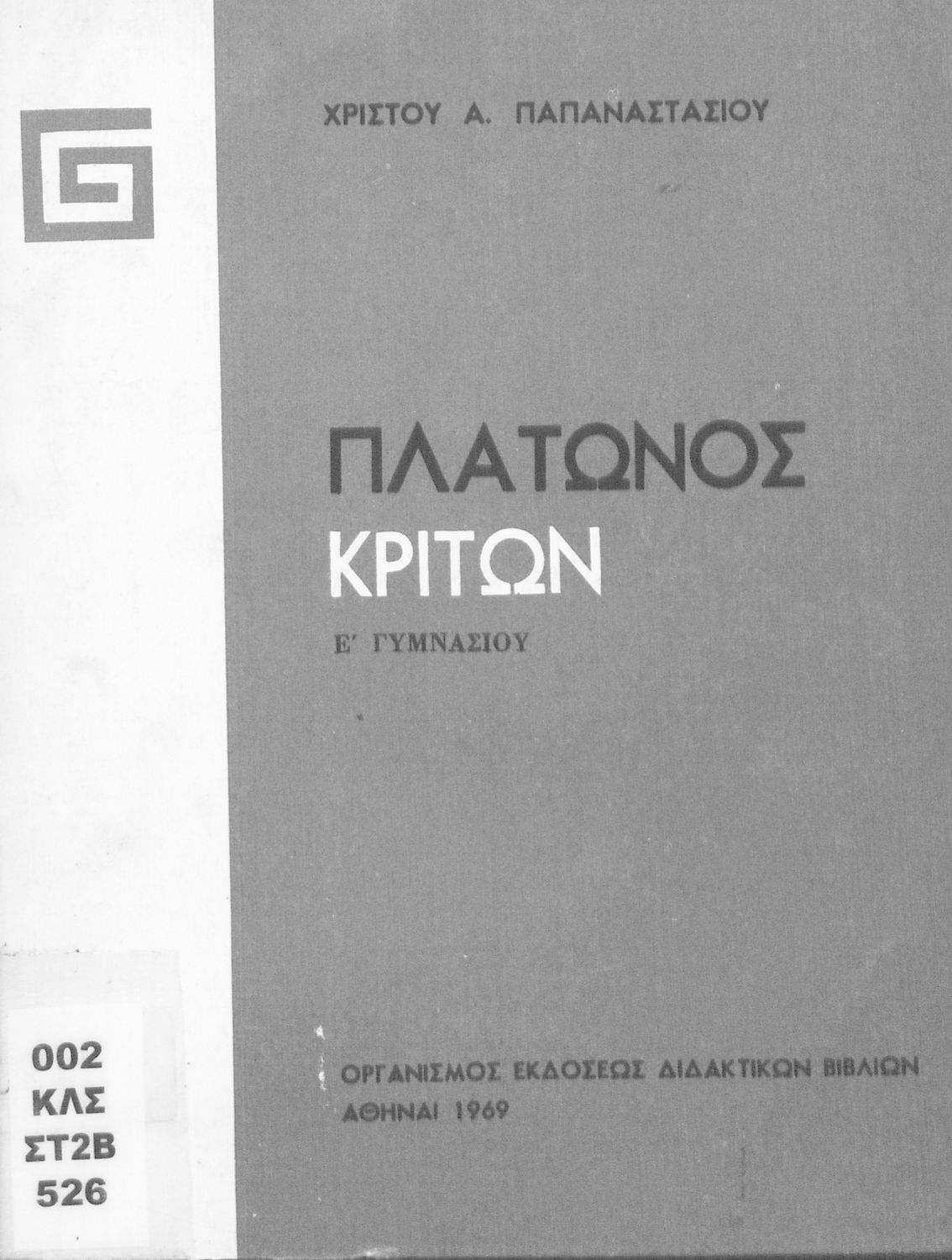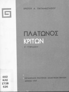 Σχολικό εγχειρίδιο της Ε΄ Γυμνασίου για το μάθημα των Αρχαίων Ελληνικών. Το εγχειρίδιο περιλαμβάνει το αρχαίο κείμενο του έργου του Πλάτωνα, "Κρίτων" και το β΄ μέρος περιλαμβάνει ερμηνευτικές σημειώσεις με πραγματολογικά, γλωσσικά και γραμματολογικά σχόλια.