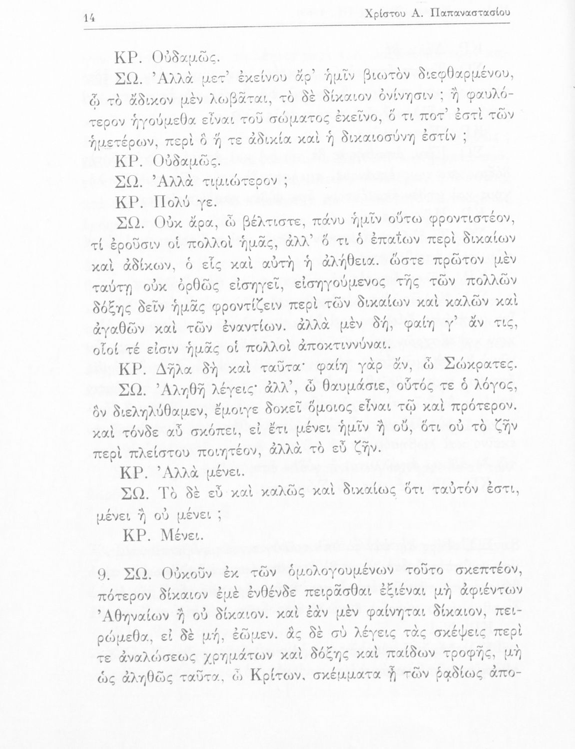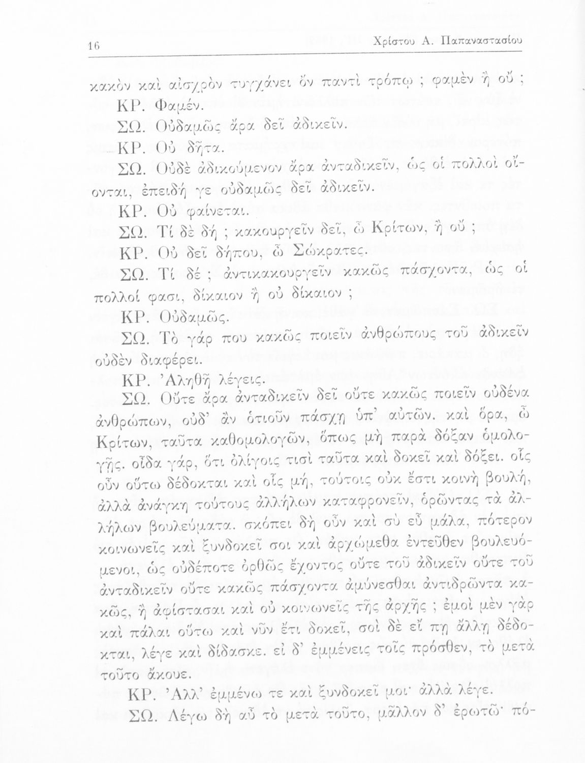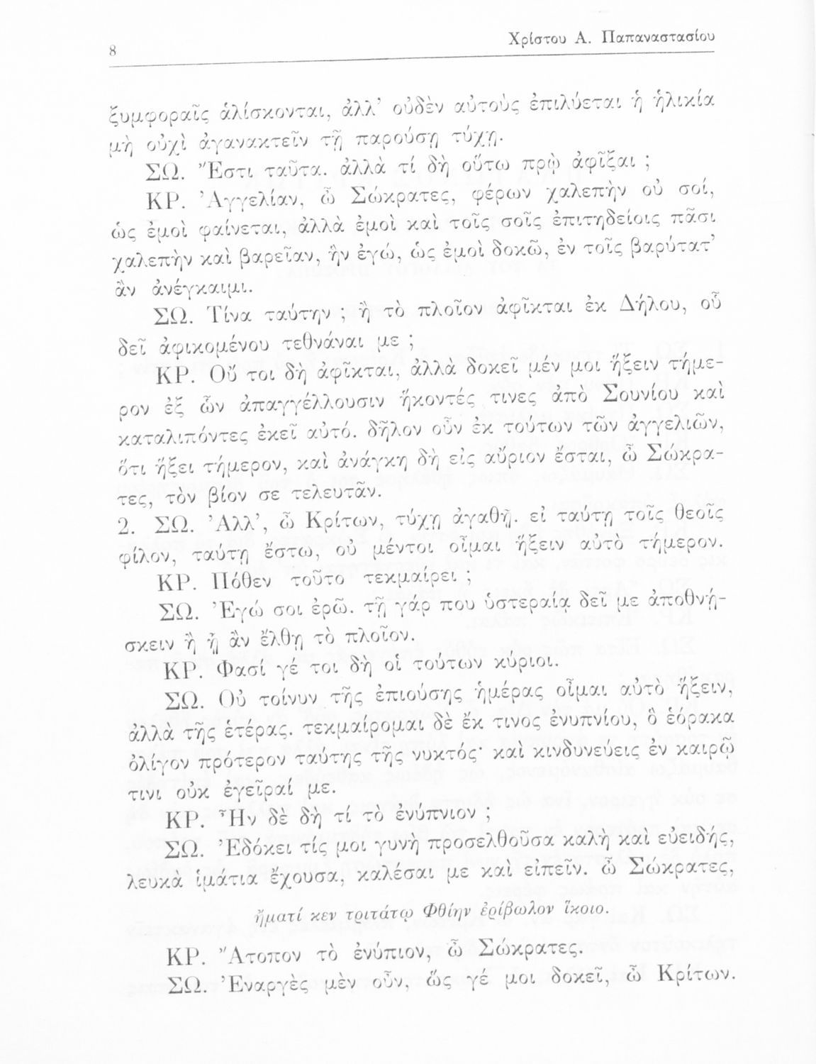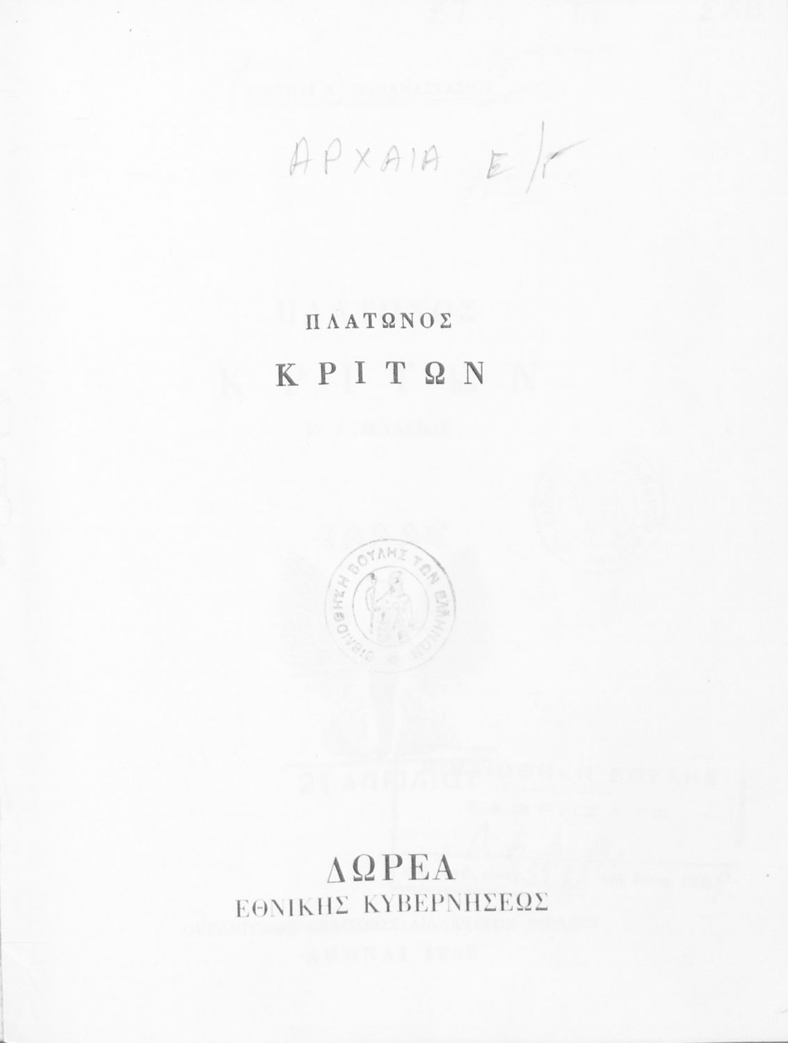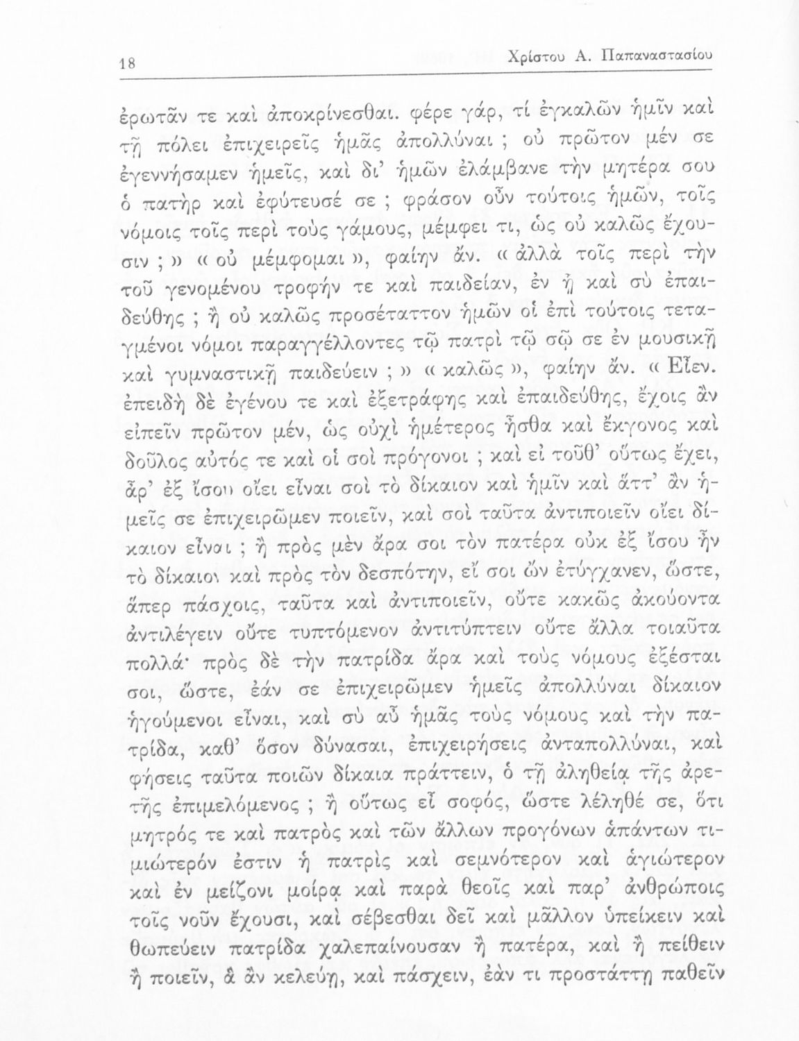 Σχολικό εγχειρίδιο της Ε΄ Γυμνασίου για το μάθημα των Αρχαίων Ελληνικών. Το εγχειρίδιο περιλαμβάνει το αρχαίο κείμενο του έργου του Πλάτωνα, "Κρίτων" και το β΄ μέρος περιλαμβάνει ερμηνευτικές σημειώσεις με πραγματολογικά, γλωσσικά και γραμματολογικά σχόλια.